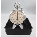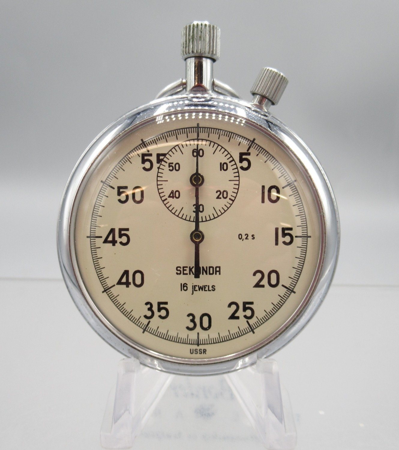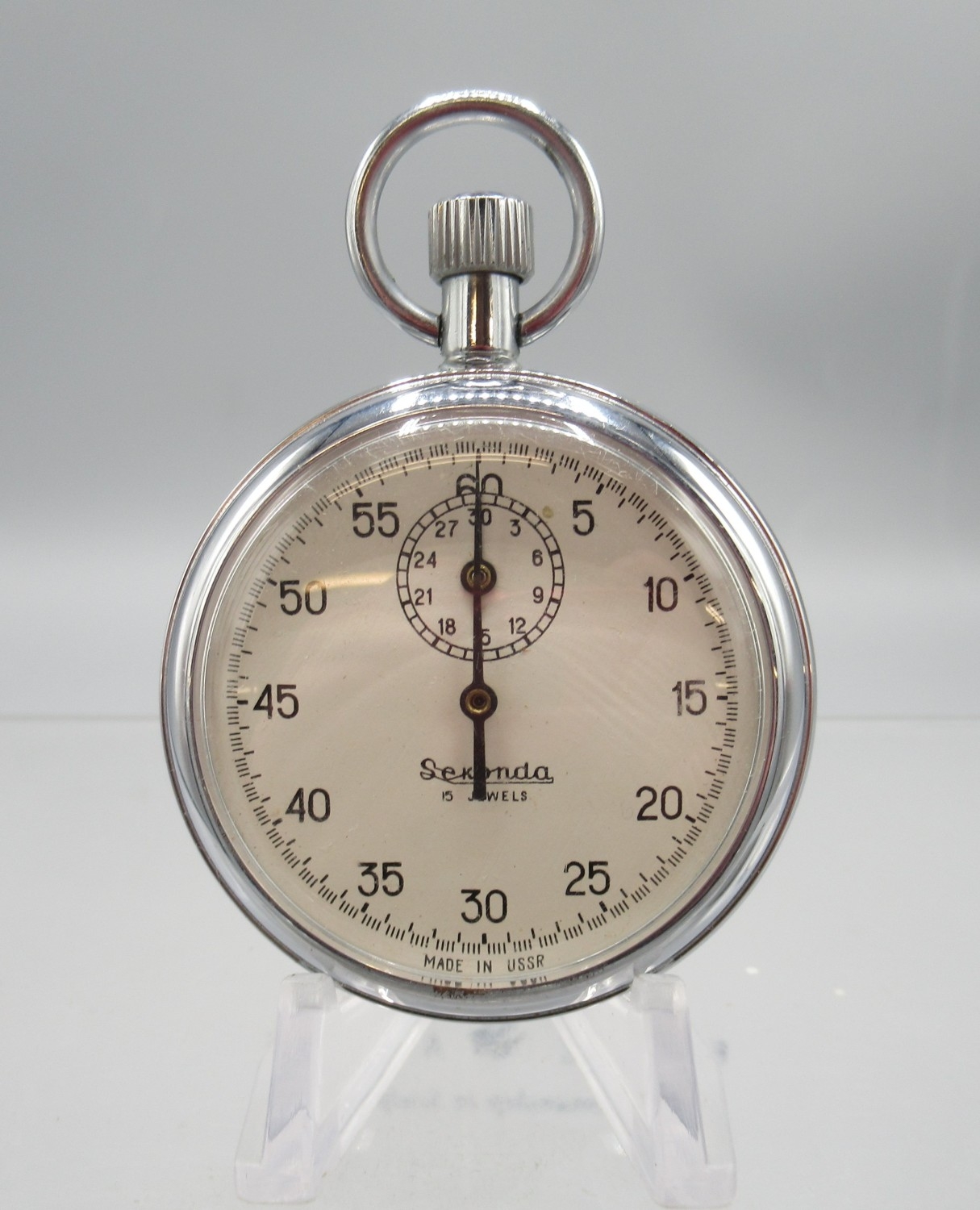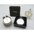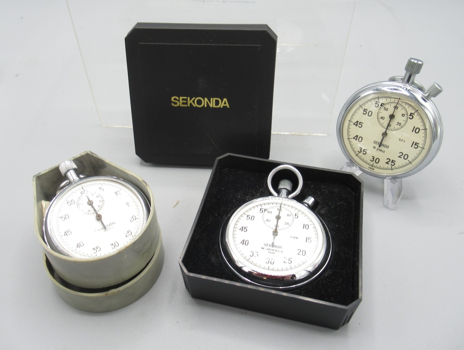 Sekonda chrome stopwatch, signed white dial with 30 minute subsidiary dial, snap on case back, 4282 calibre 15 jewel movement no. 4937, D49.7mm and two other Sekonda chrome stopwatches, D54.8mm