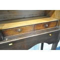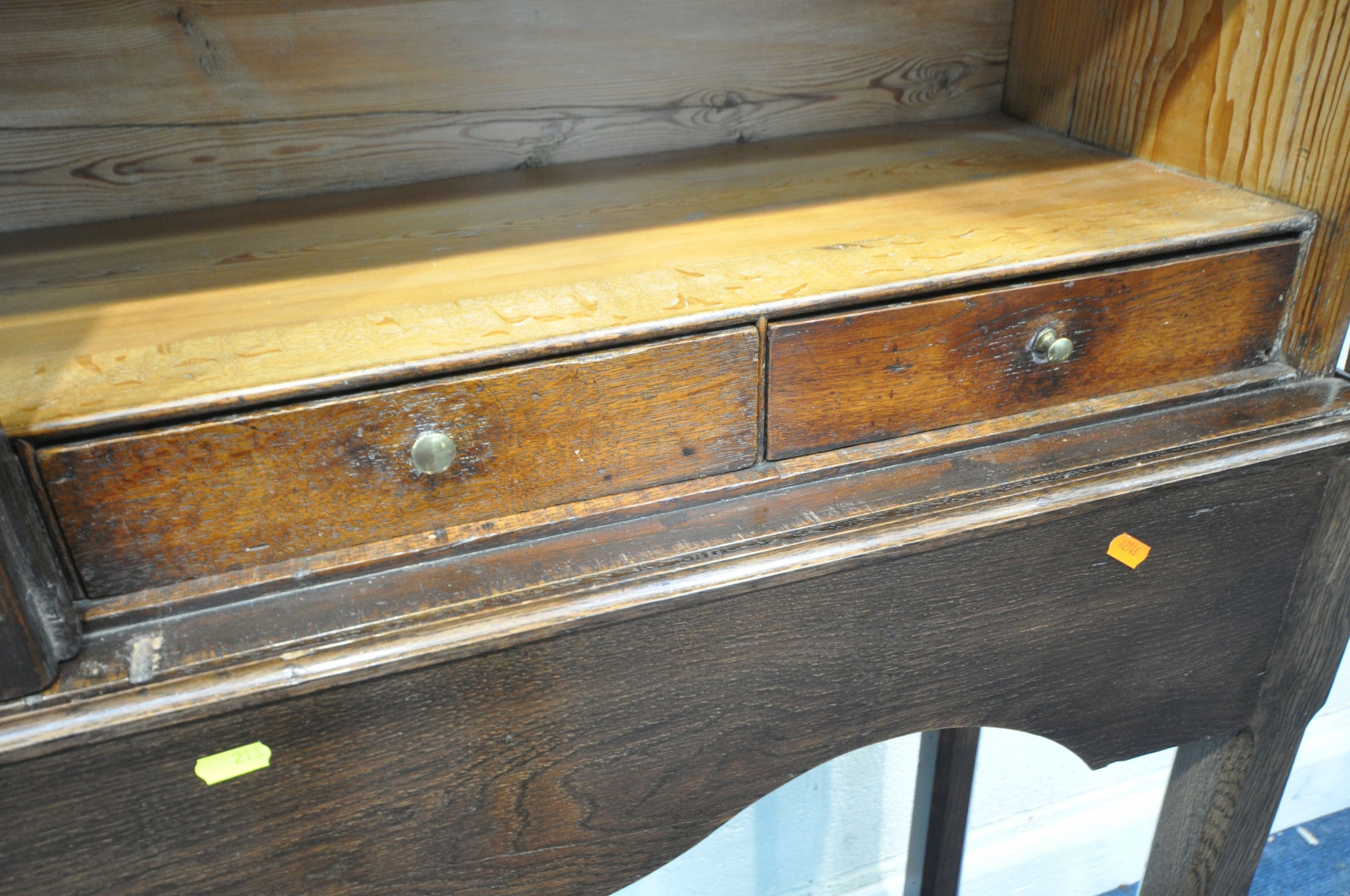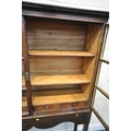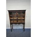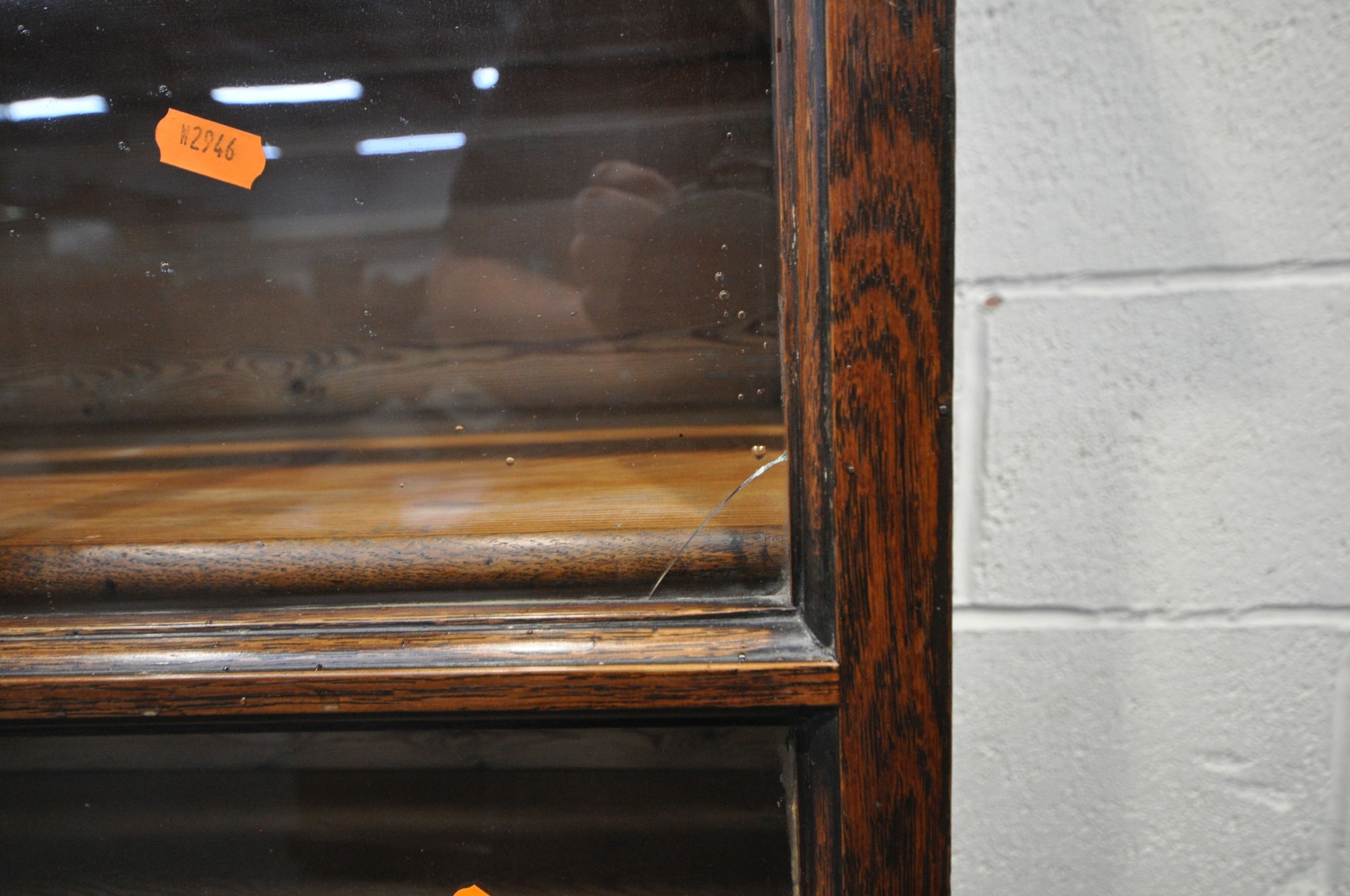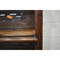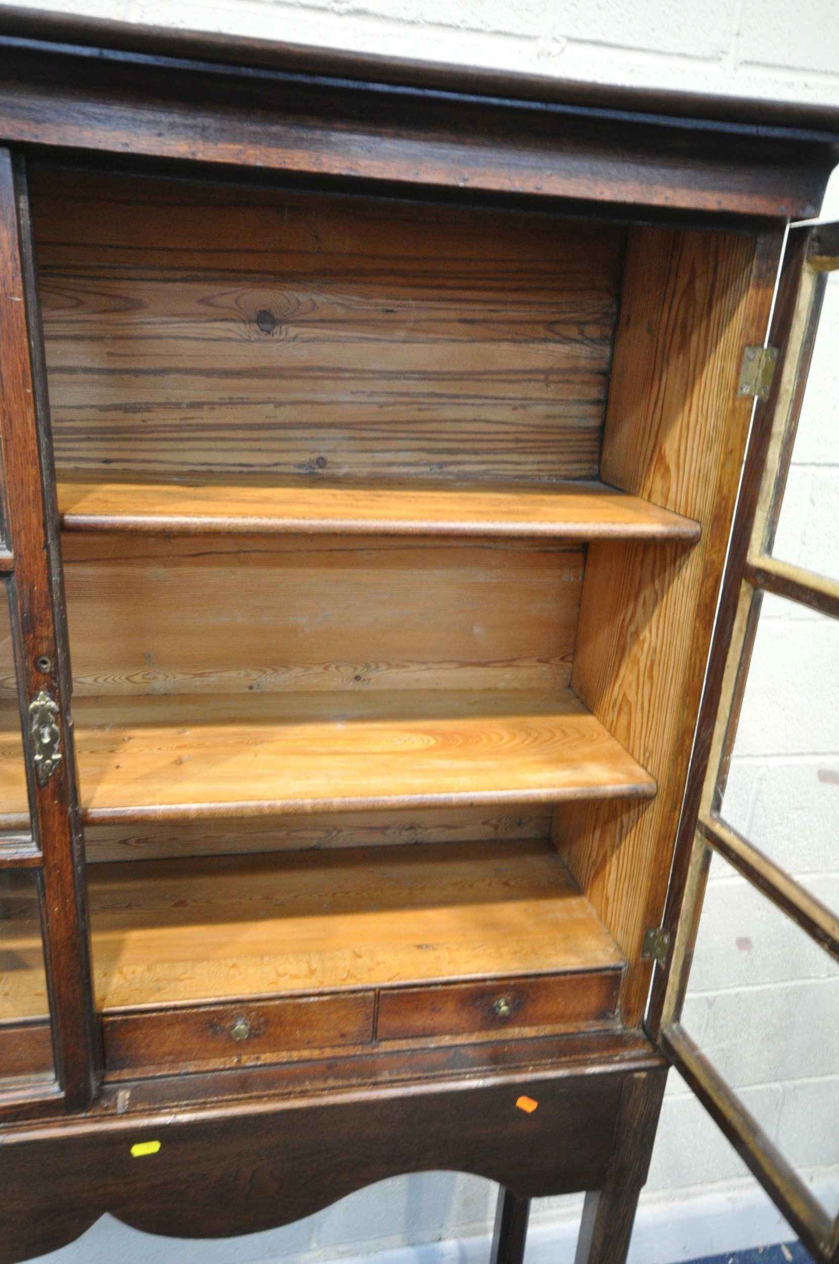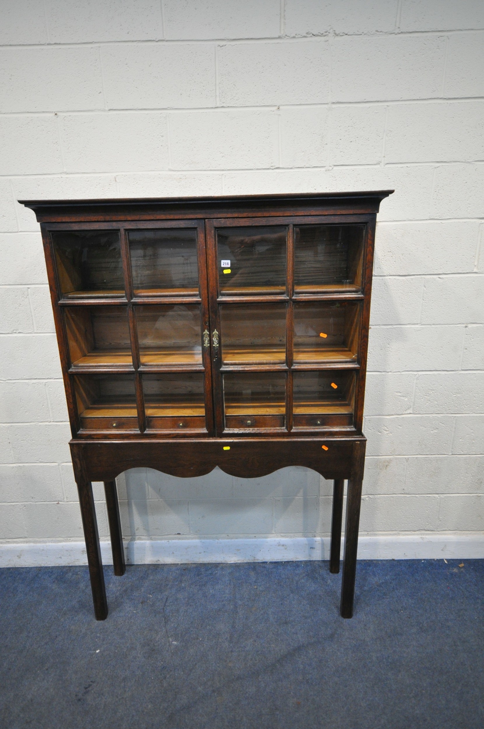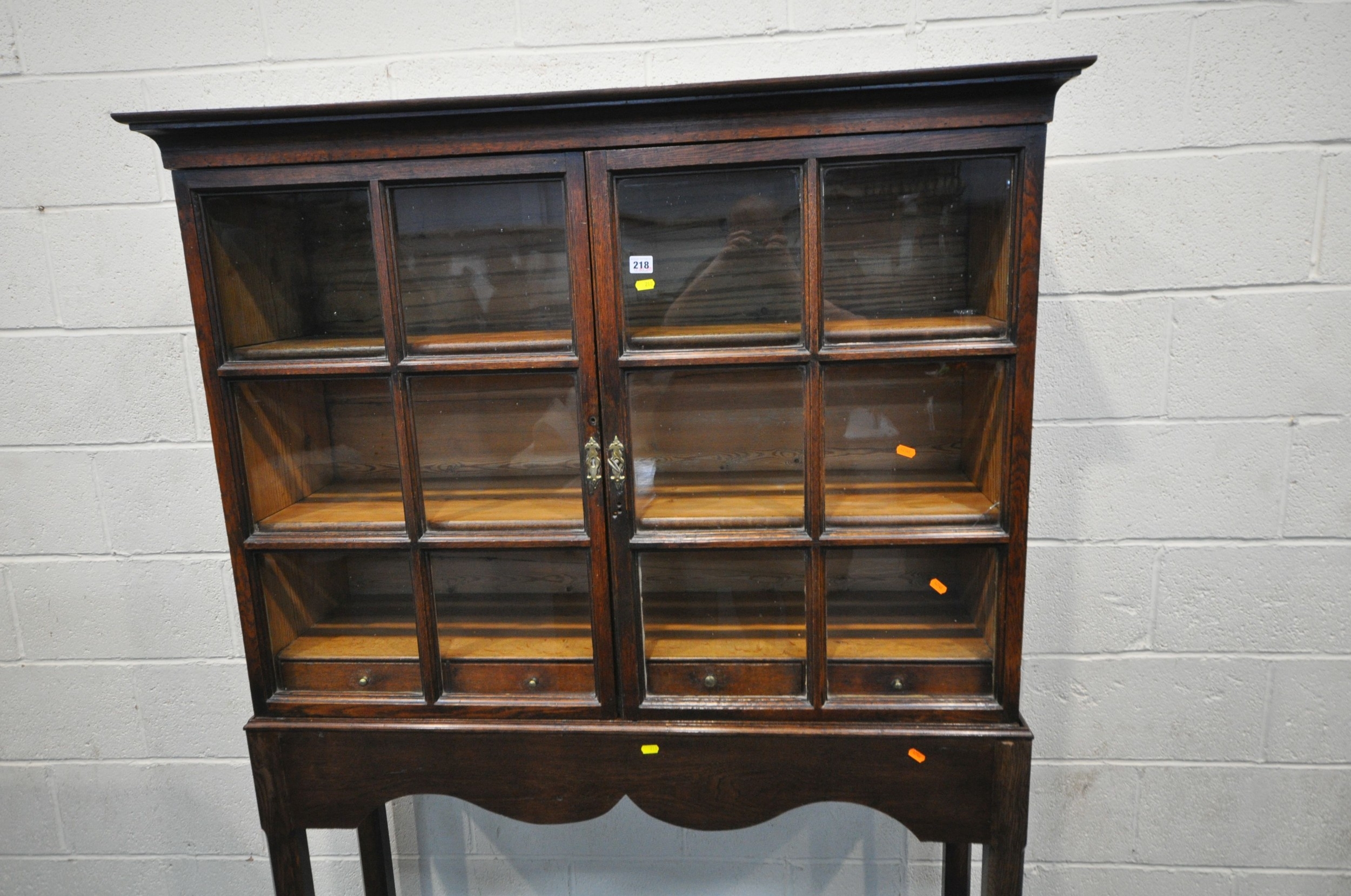 AN OAK CABINET ON STAND, the double glass doors enclosing two shelves and four drawers, width 125cm x depth 37cm x height 182cm x height of base 92cm, condition report: incorporating older timbers, one key, one glass pane cracked, other wear and usage
