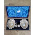 A box with a pair of Victorian silver salt bowls and spoons hallmarked Birmingham 1899