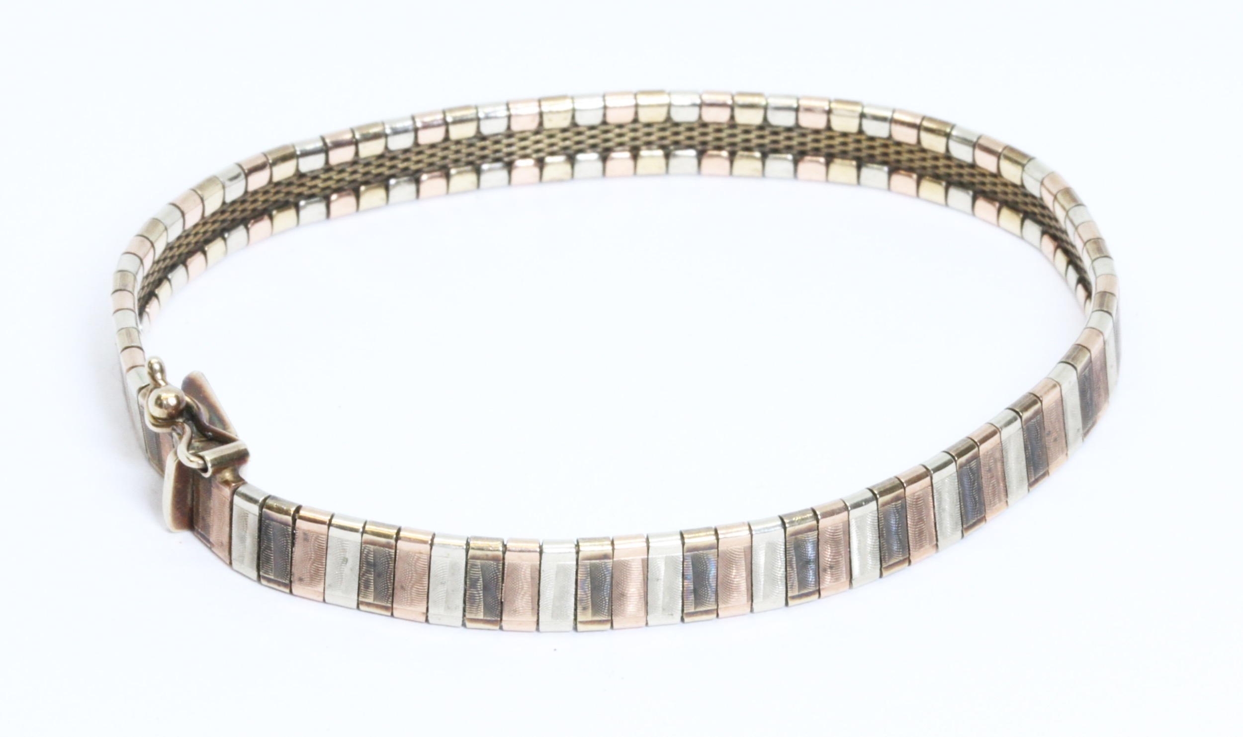 A three colour bracelet, marked '375', length 18cm, weight 13.5g, 10% buyer's premium (inclusive of VAT), normal online bidding fees apply.