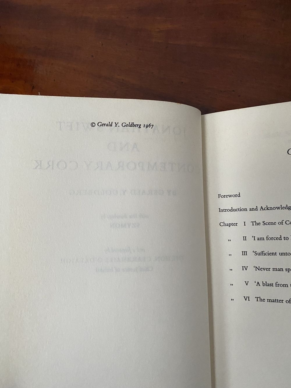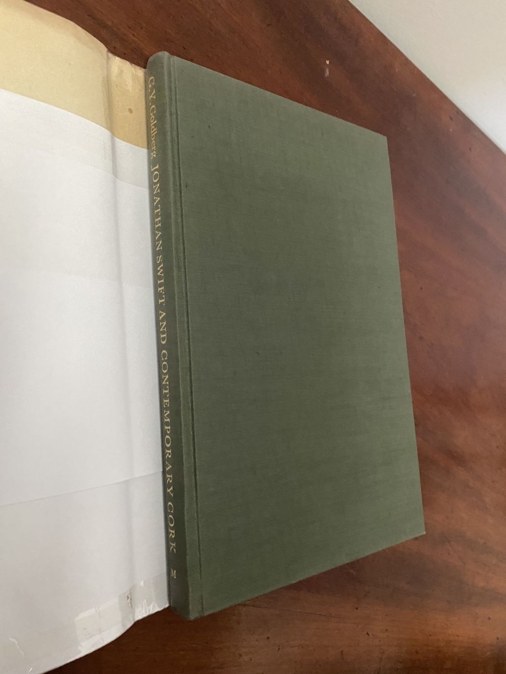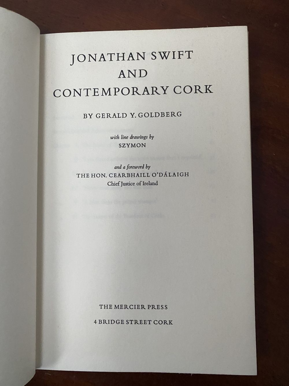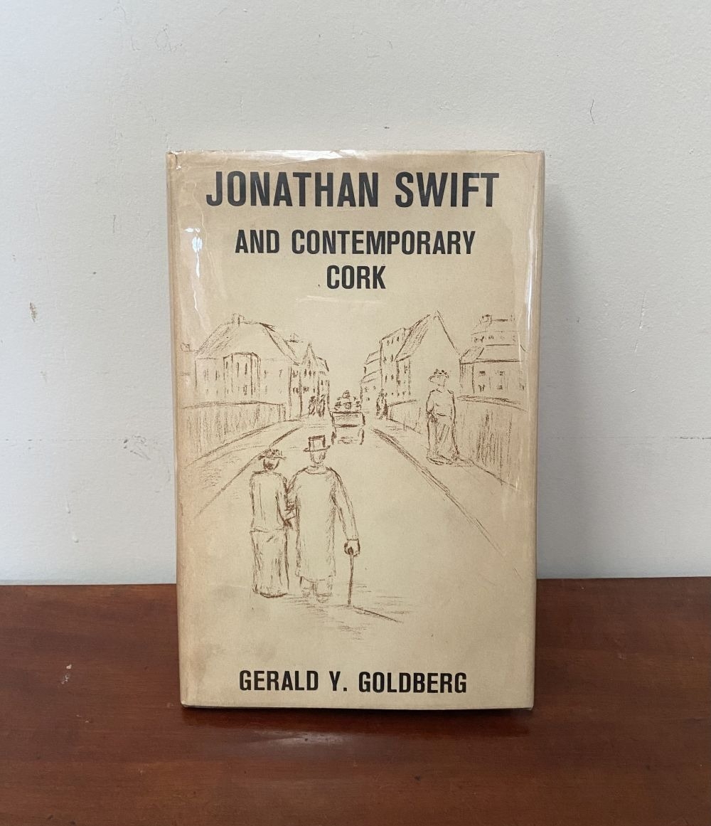 A FIRST EDITION BOOK OF IRISH INTEREST, Gerald Y. Goldberg, ‘Jonathan Swift and Contemporary Cork’, with line drawings by Szymon. Published The Mercier Press 4 Bridge Street Cork 1967. Hardback with protective sleeve. Rare book, now out of print. Condition as photographed.
