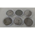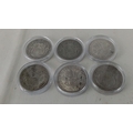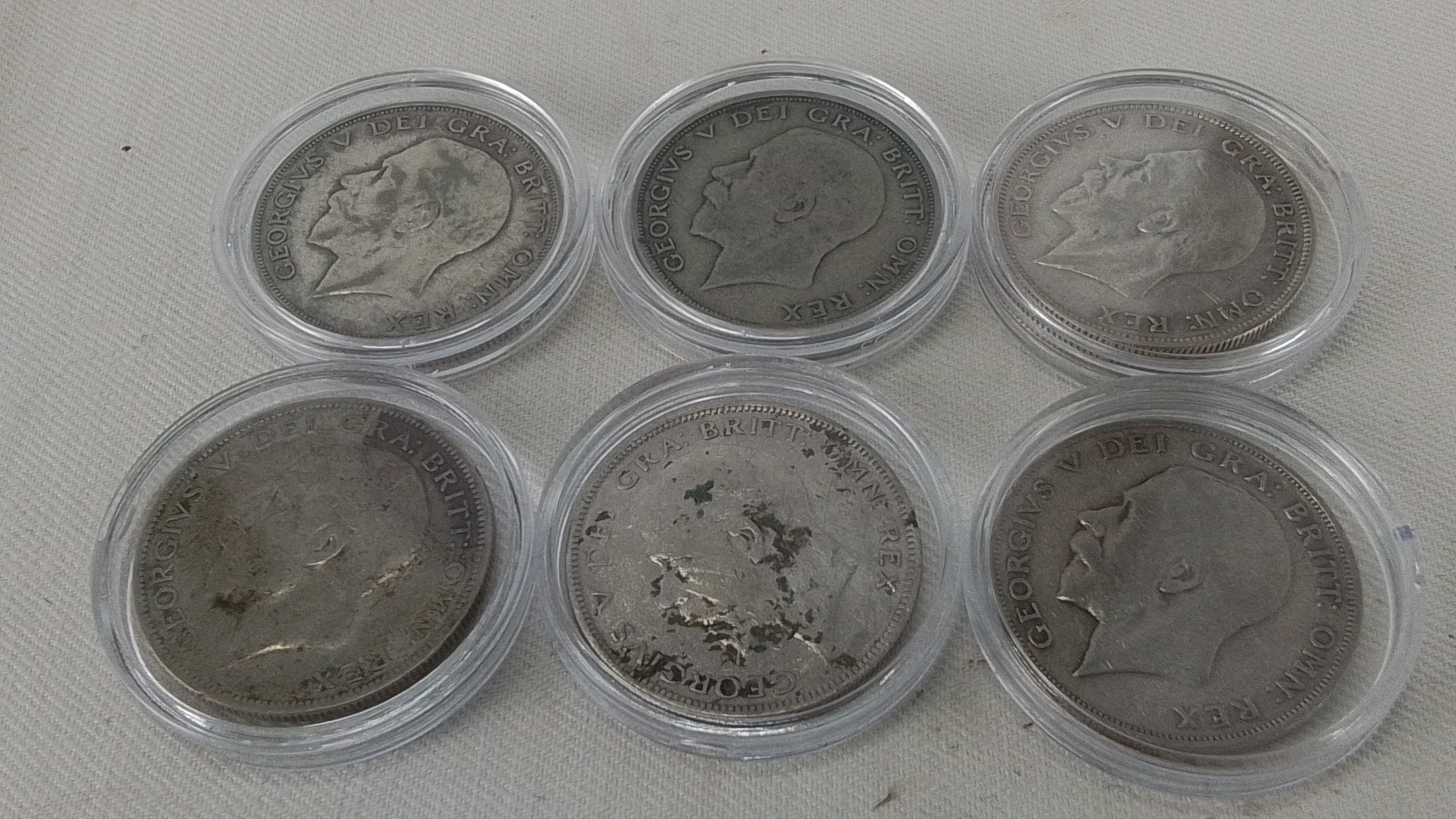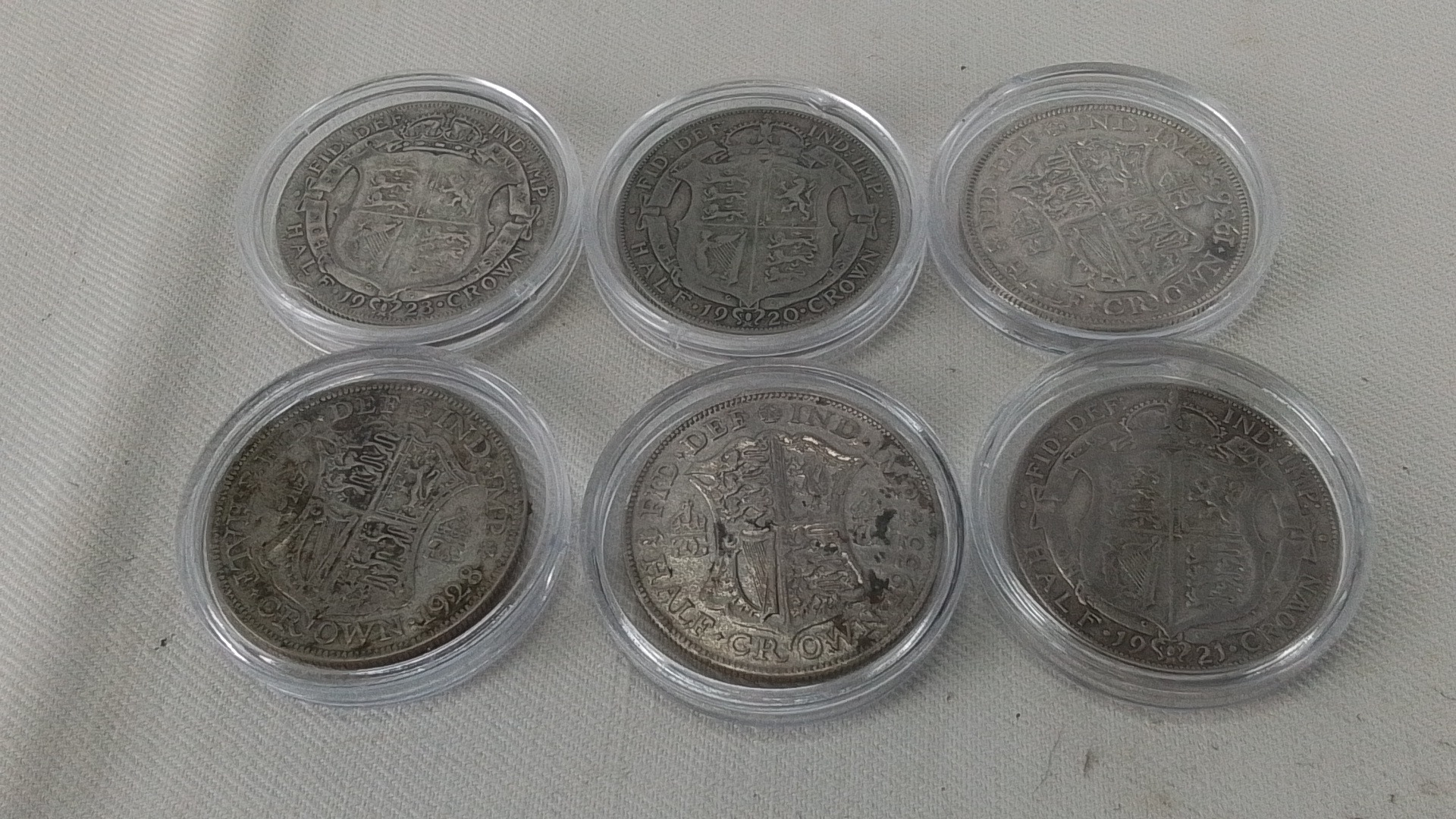 Set of 6 George V British silver half-crowns, in clear coin capsules, comprising 1920, 1921, 1923, 1928, 1933 and 1936 issues, shield reverse and laureate head obverse.
