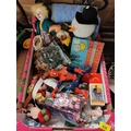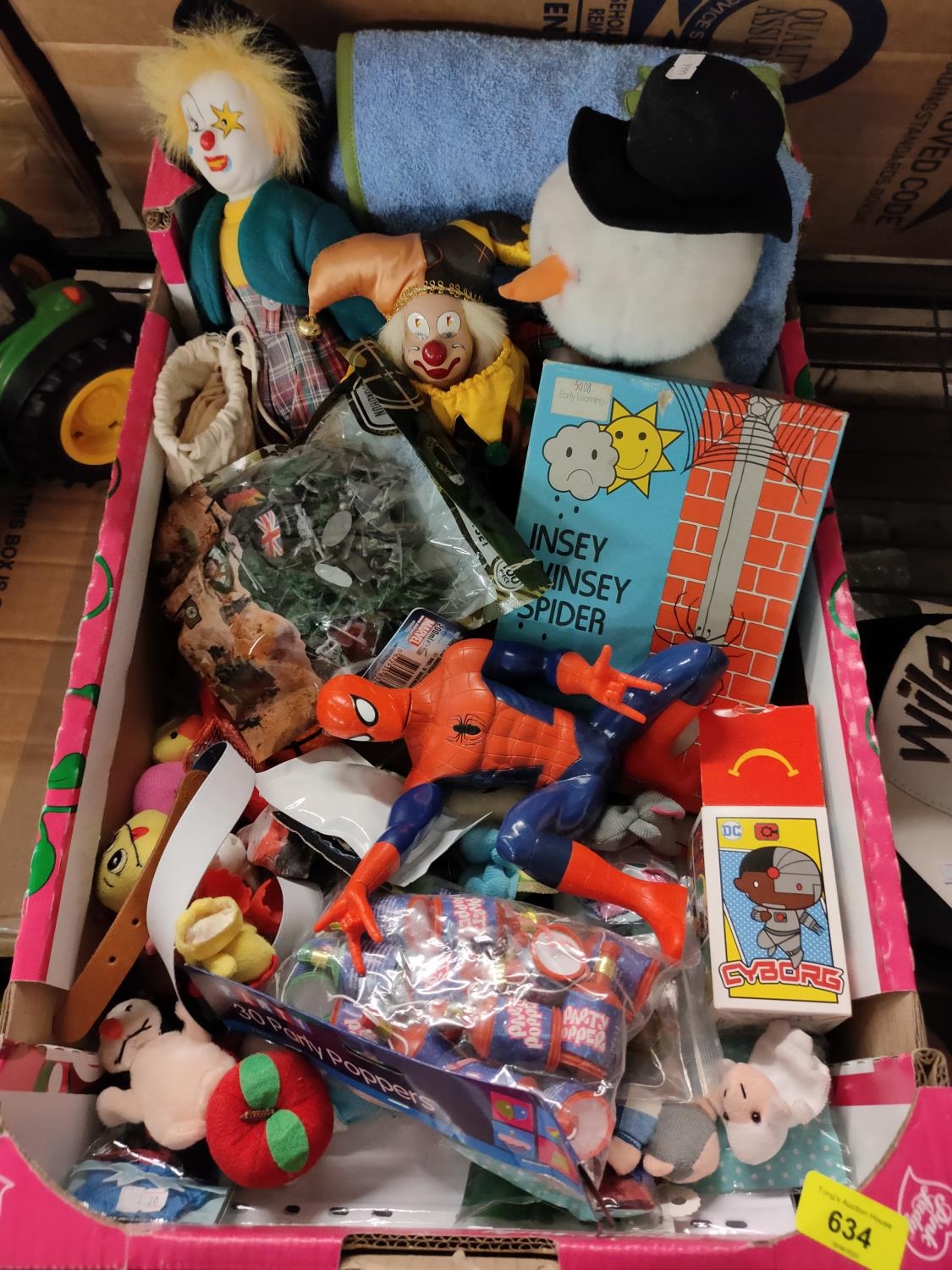 Collection of children’s toys including soft toys, soldiers playset, Spider-Man and party poppers