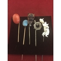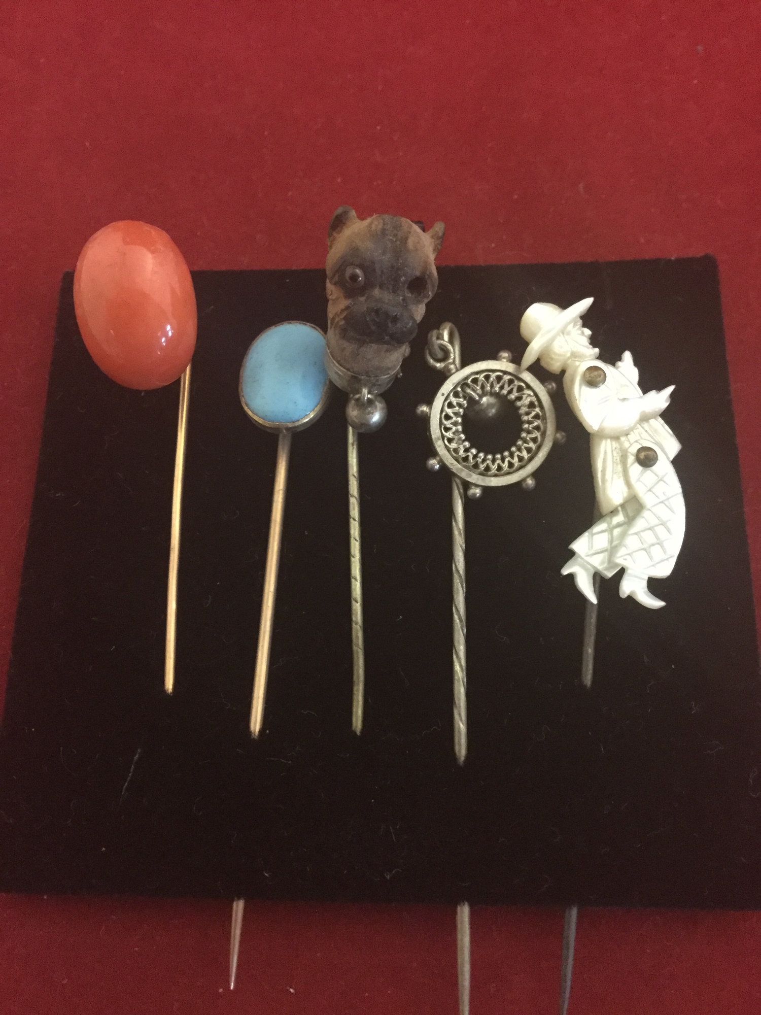 to include examples set with articulated mother-of-pearl figure, dog's head, coral etc -