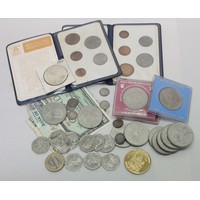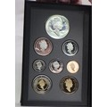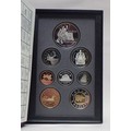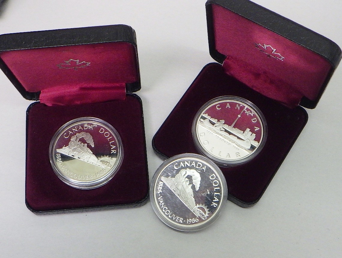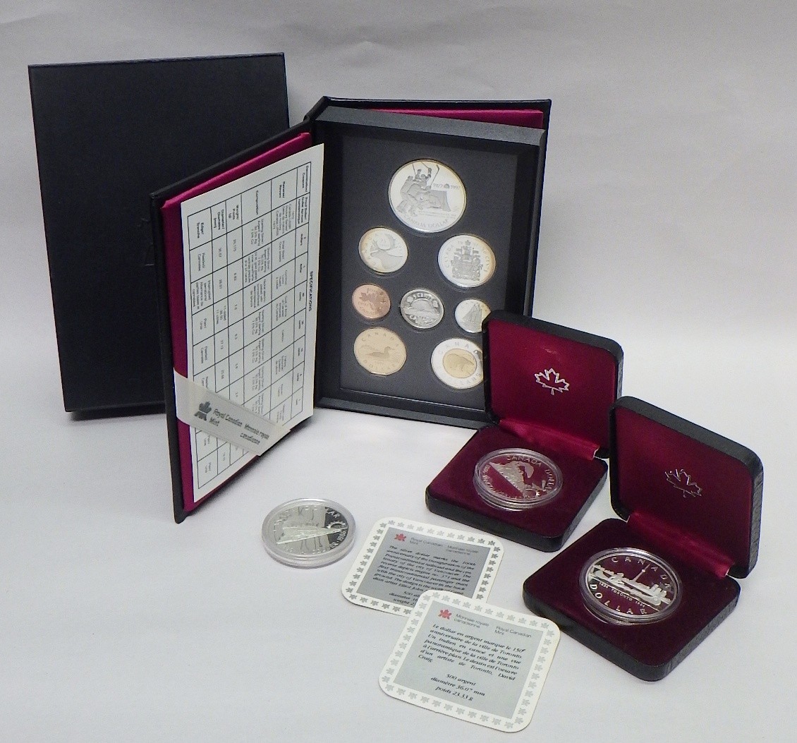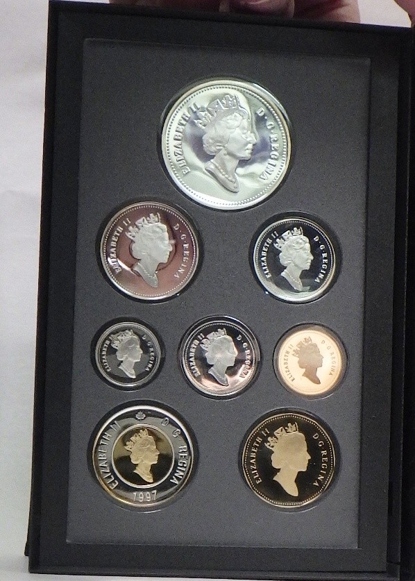 A Canadian 1997 cased coin set comprising a silver proof $1, a silver polar bear $2, a base metal loon $1, a silver coat of arms 50c, a silver caribou 25c, a silver schooner10c, a silver beaver 5c, a base metal 1c; three Canada commemorative dollar coins, each believed .500 silver.