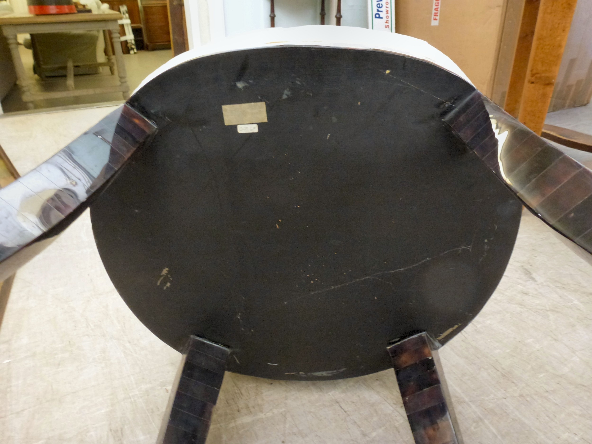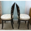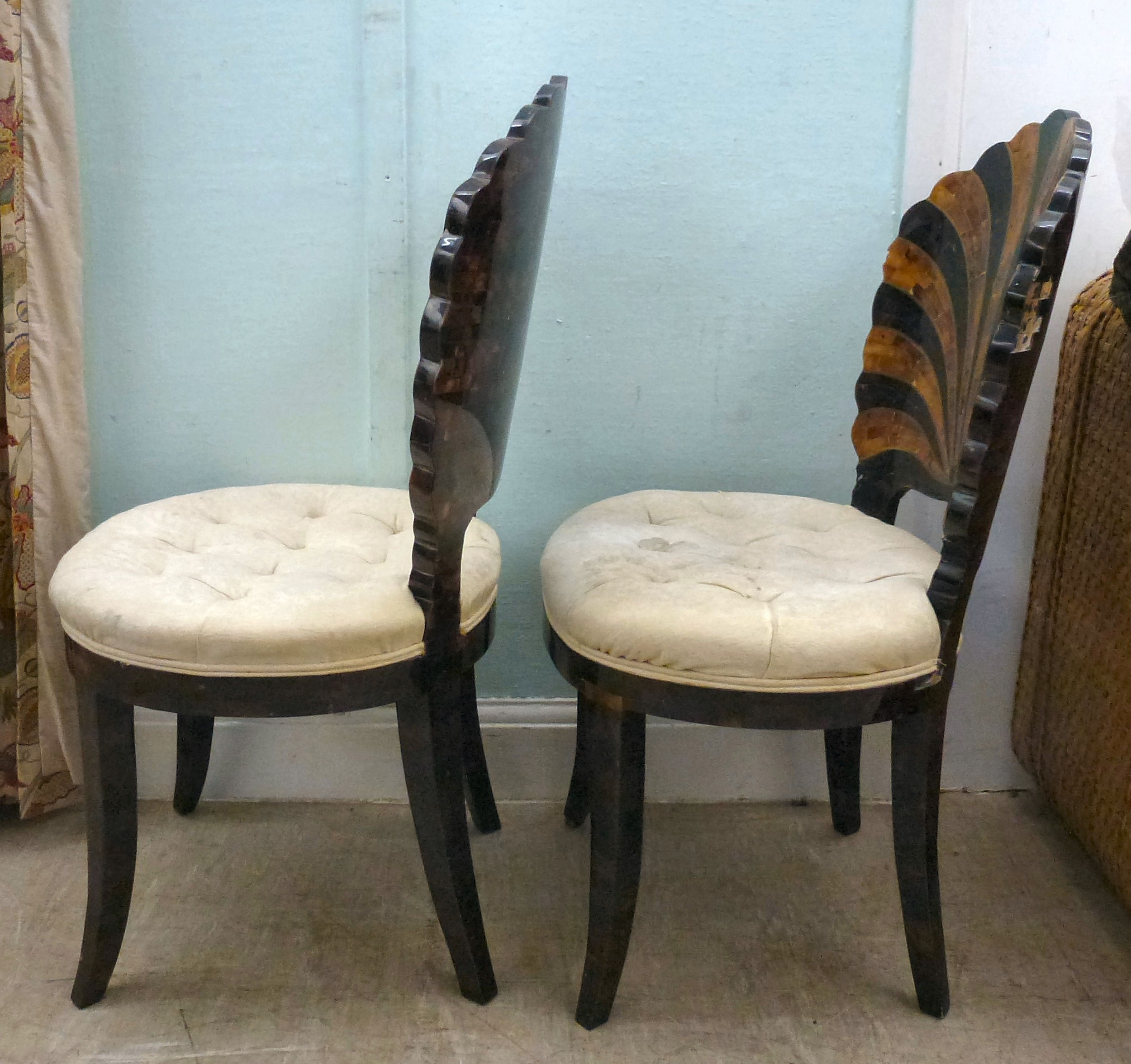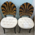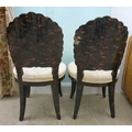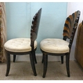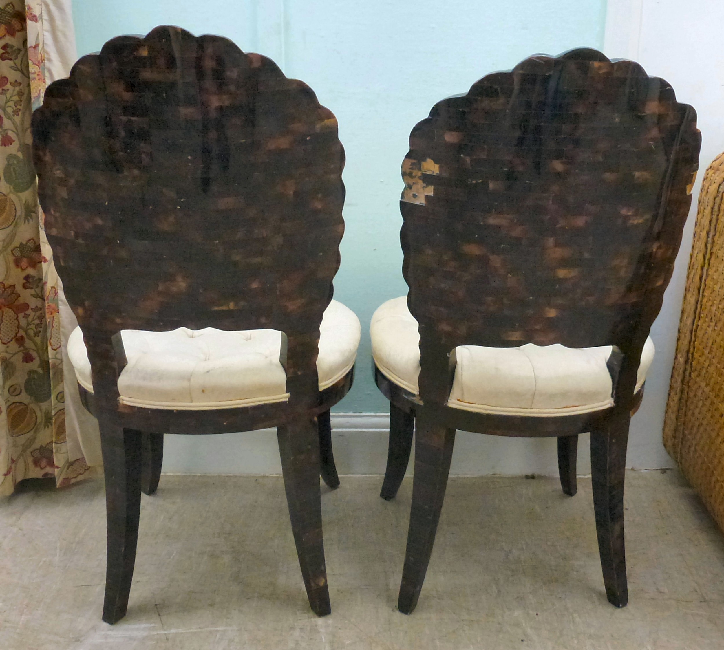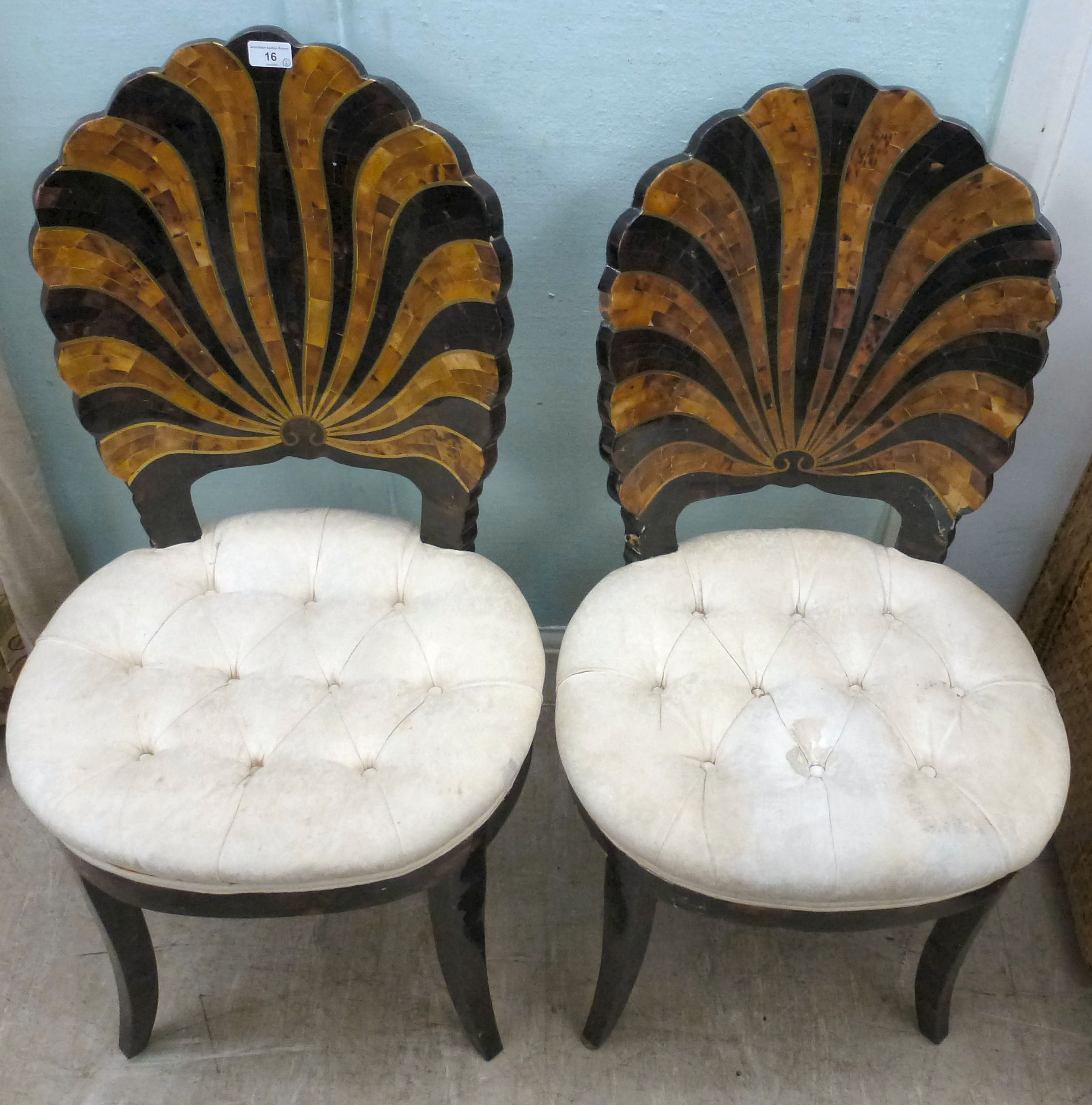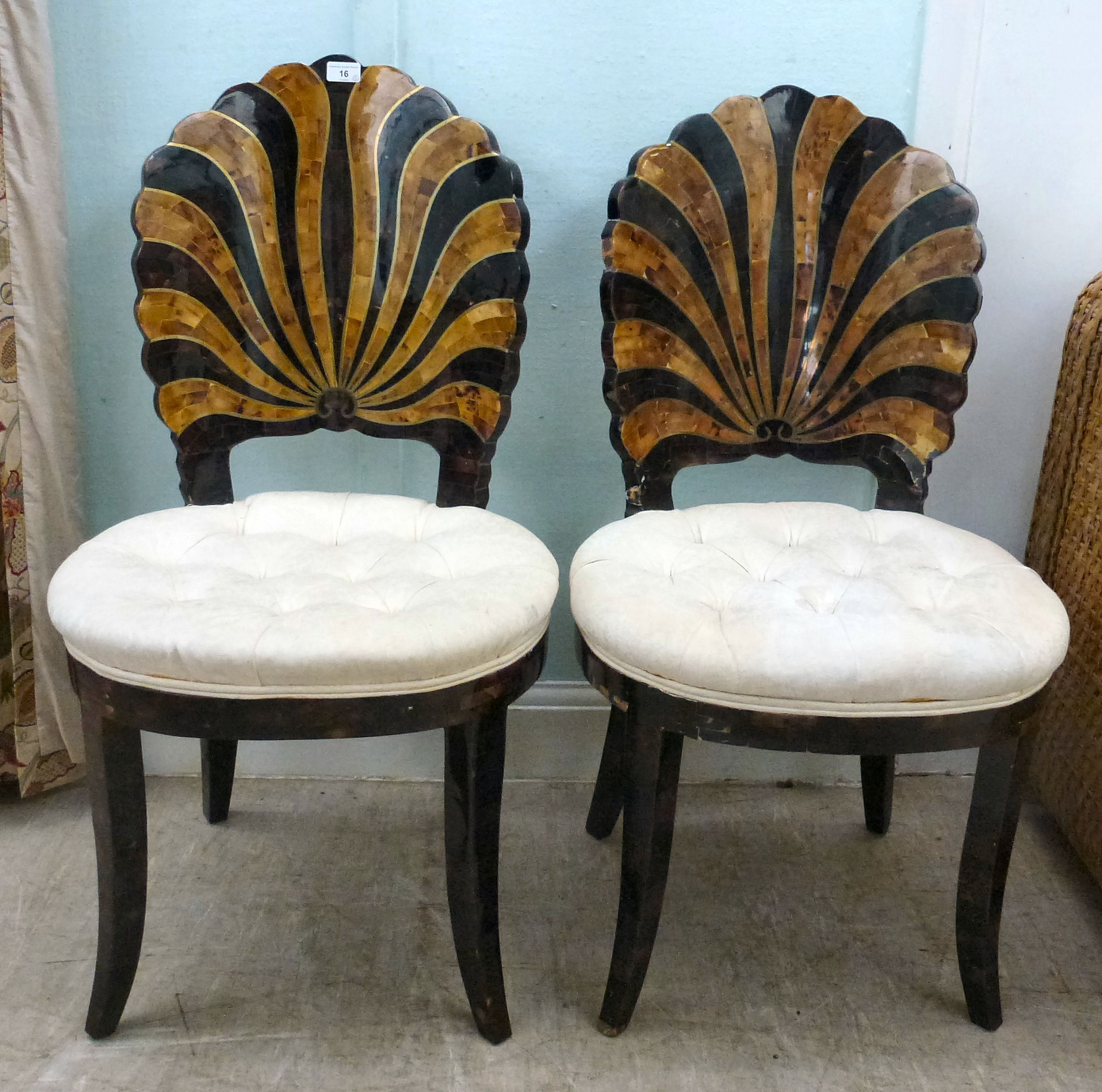 A pair of modern brass inlaid, faux tortoiseshell veneered chairs, the backs of shell design, upholstered in white fabric, raised on sabre legs