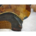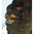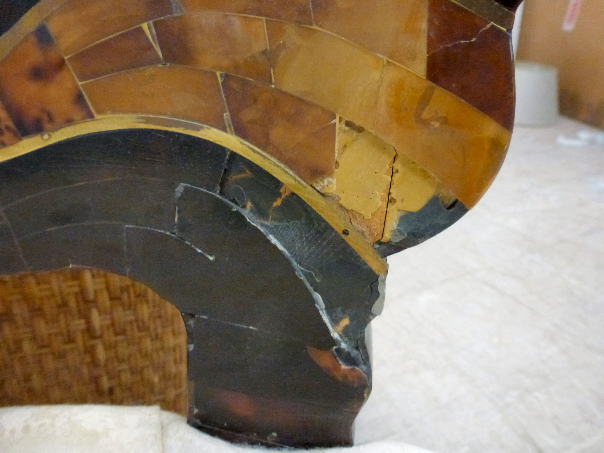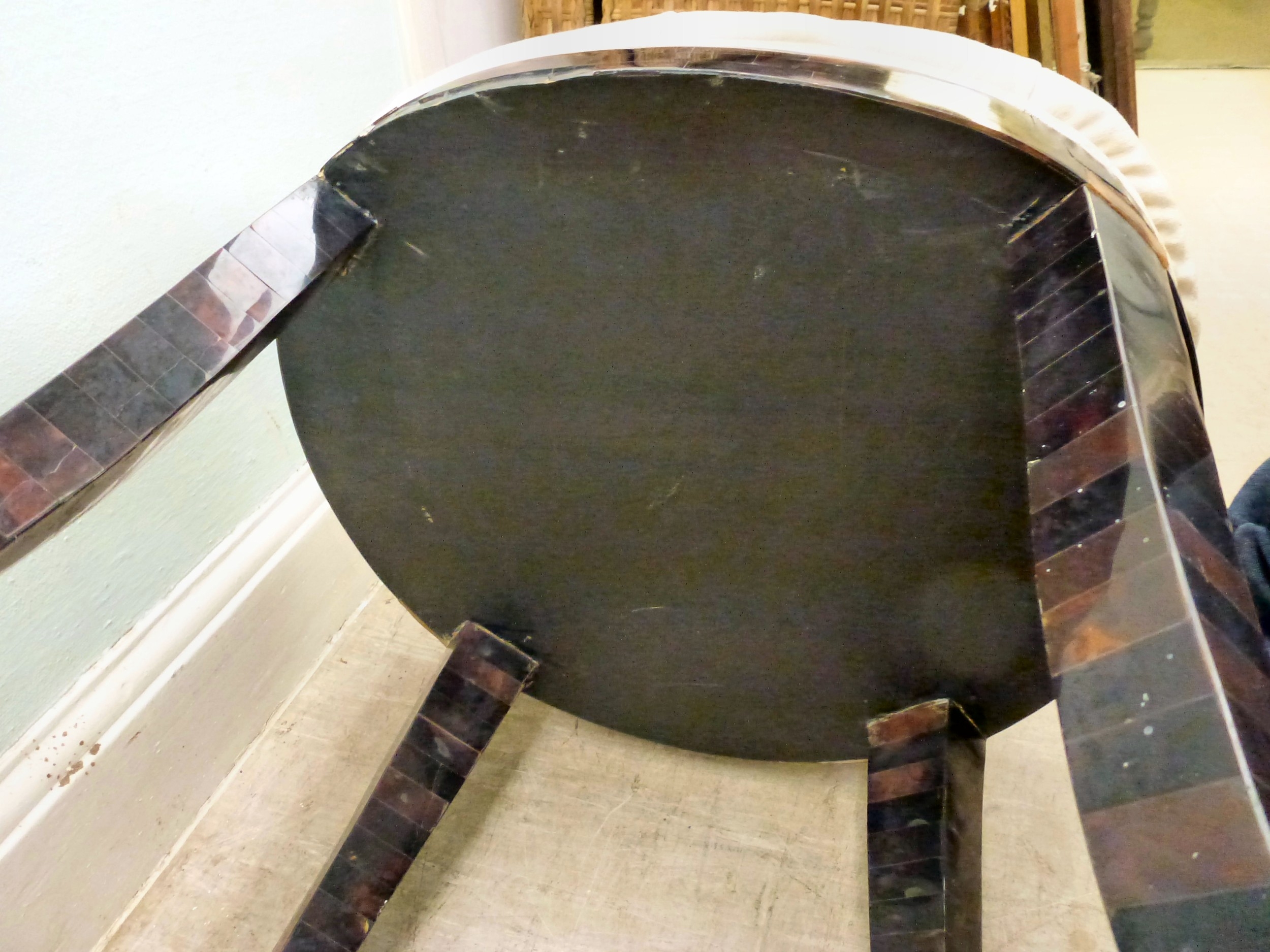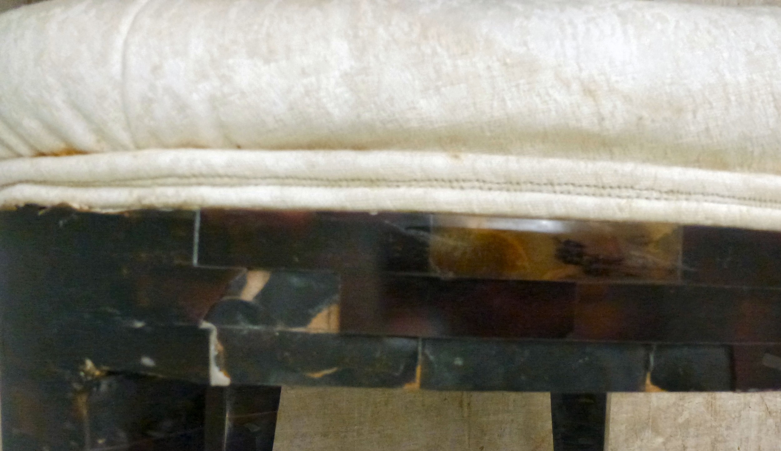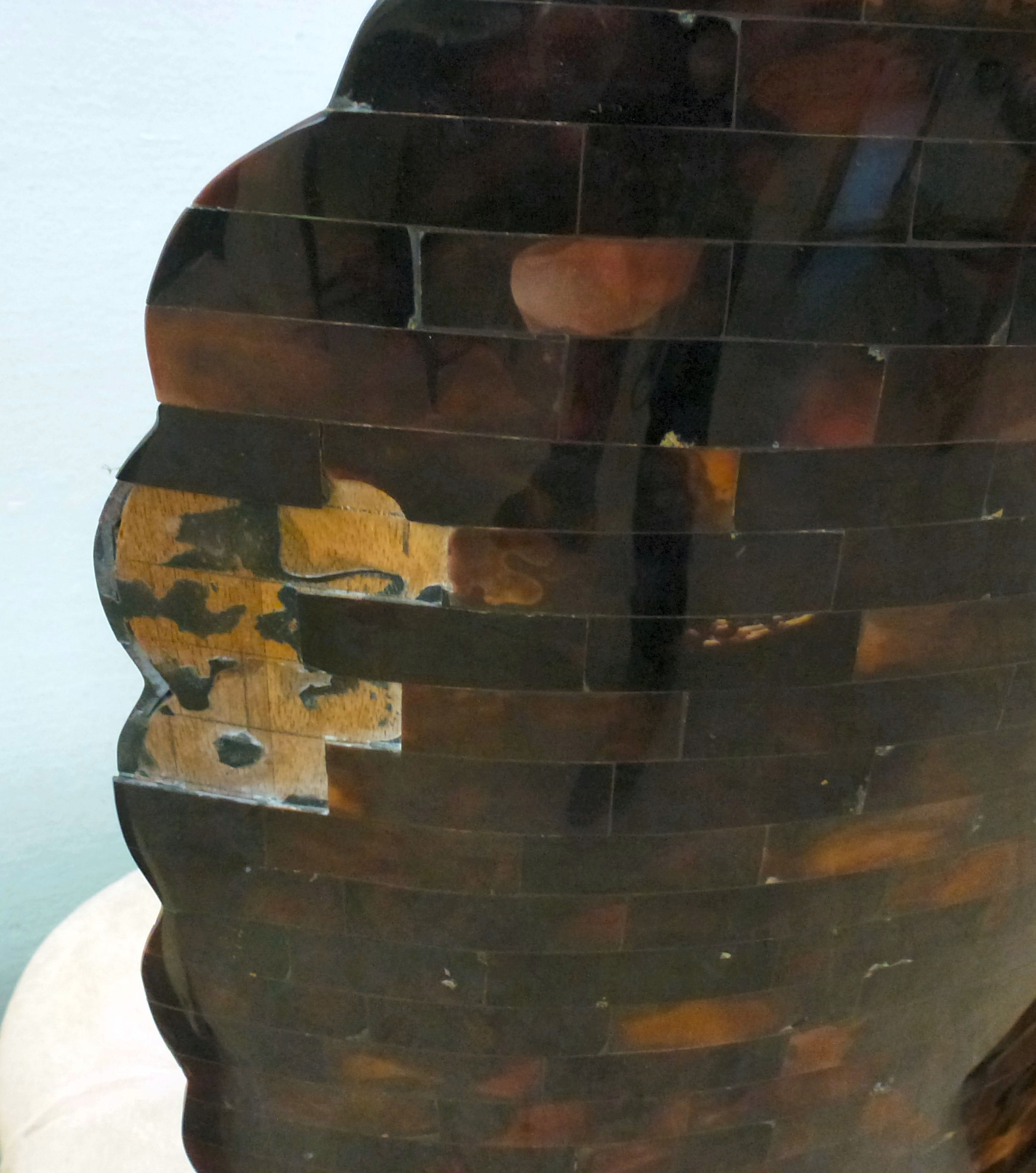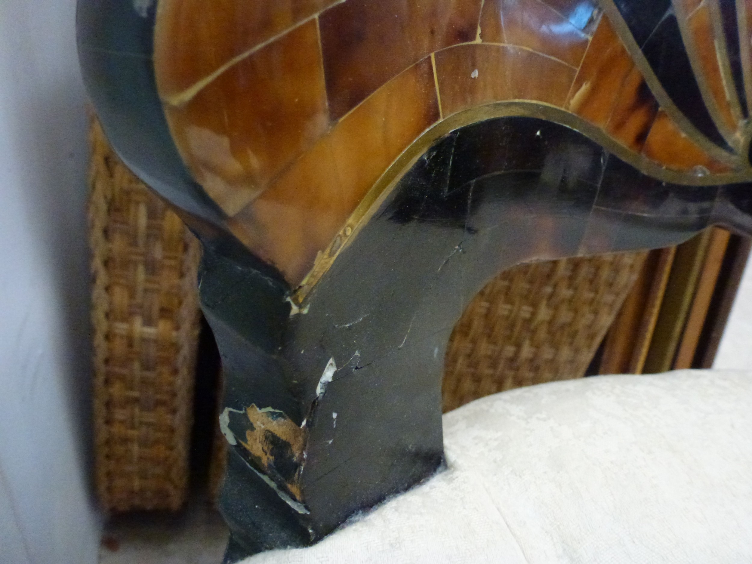 A pair of modern brass inlaid, faux tortoiseshell veneered chairs, the backs of shell design, upholstered in white fabric, raised on sabre legs