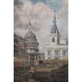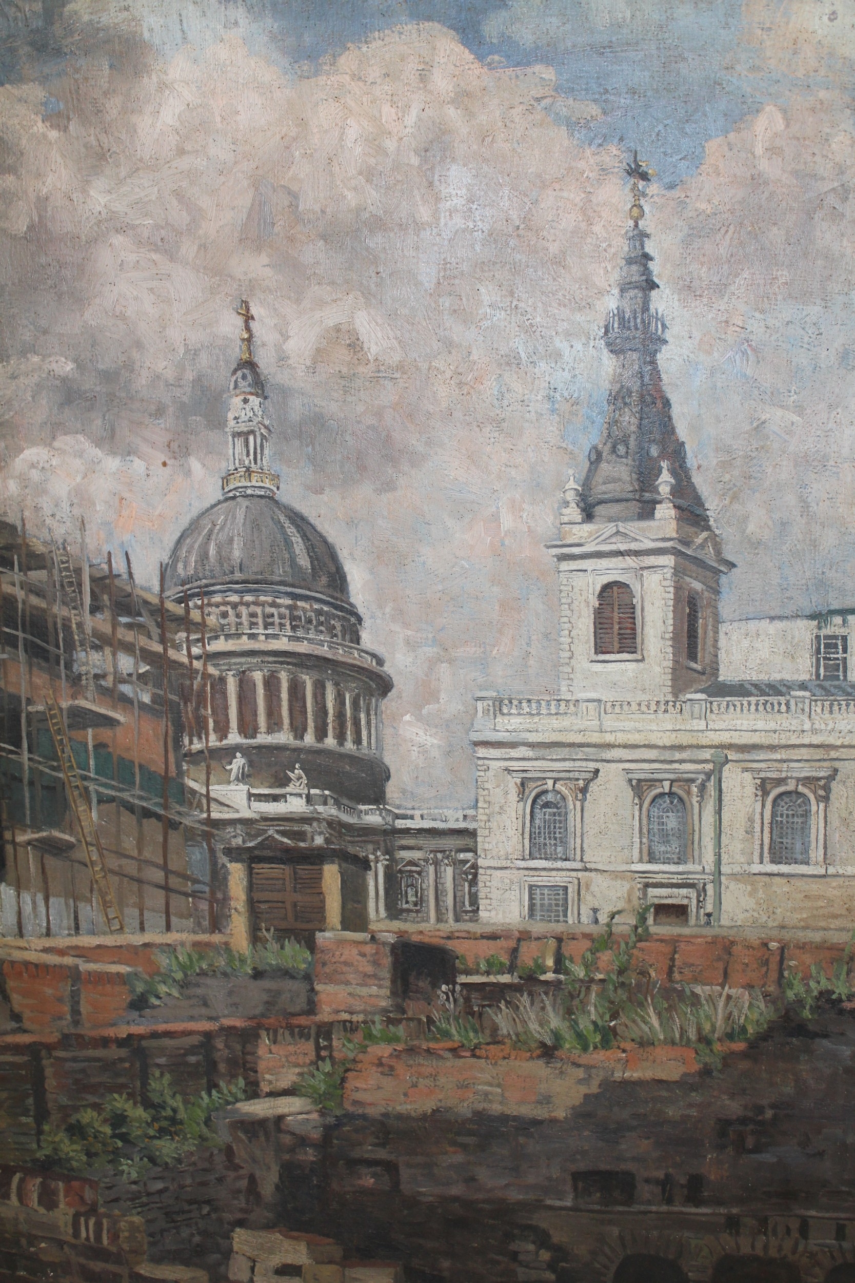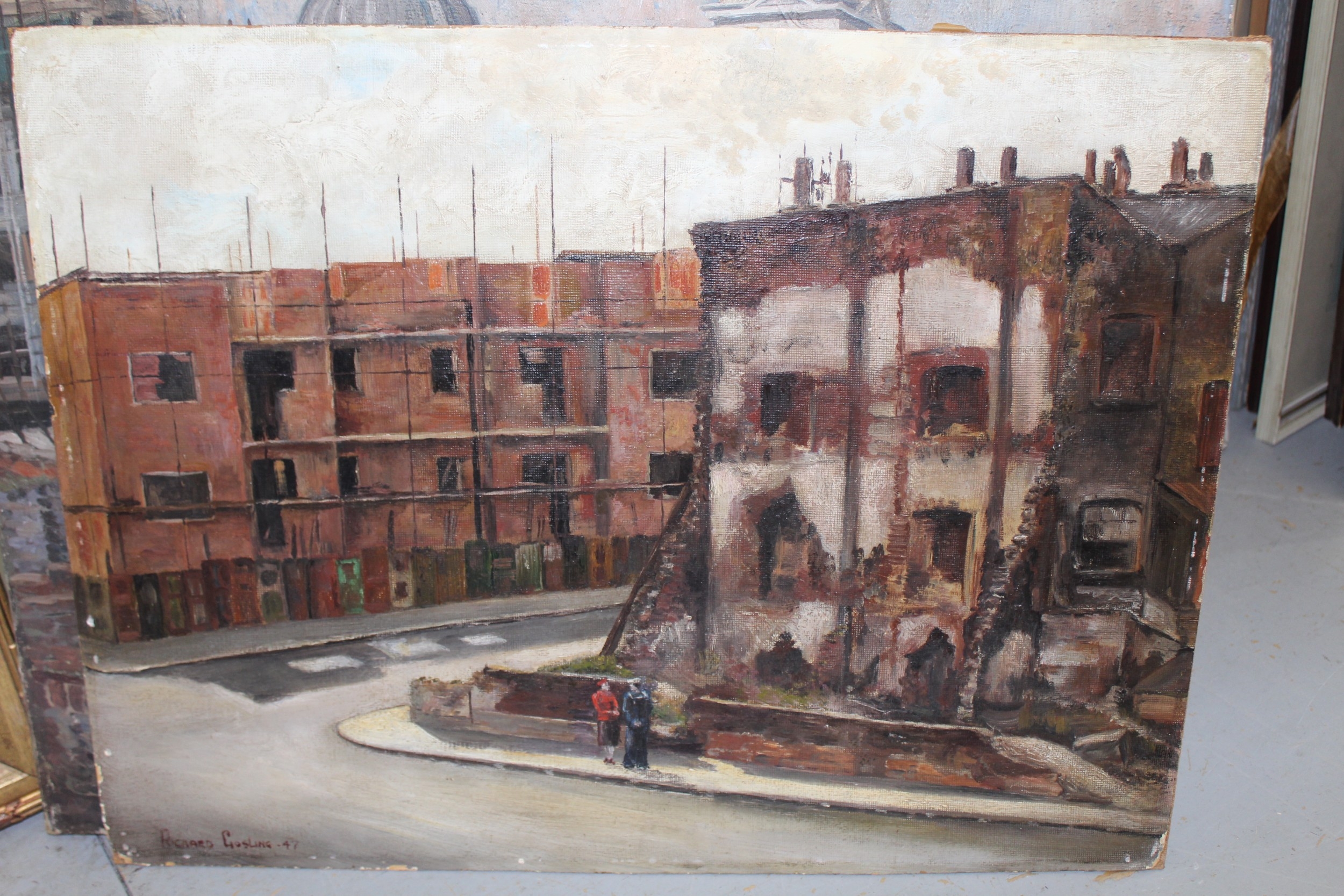 Two unframed oils, view of St. Paul's, signed P. Willis and study of figures in a bomb damaged street, signed Richard Gosling, largest 76 x 63cm