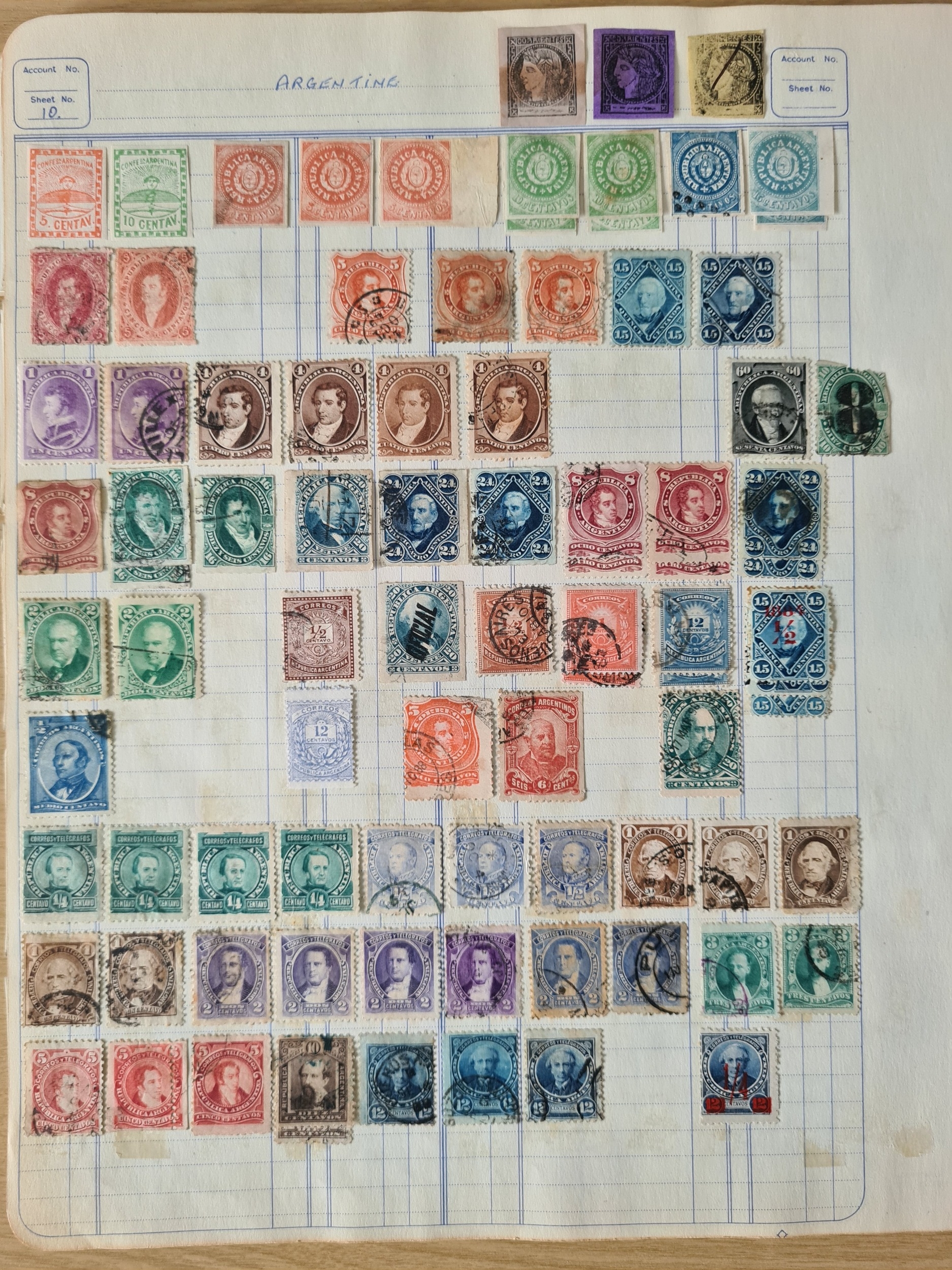 ARGENTINA - Collection of many 100s early to modern mint & used stamps on large old time ledger pages unpicked with good range of different issues including issues from 1858-1980s dozens of defins and commems, Buenos Aires imperfs (8, taken 'as is'), few Corrientes, Rivadavia 5c red (2), 1890s defins to 1p, 1911 Ploughman to 1p, few officials etc. Ideal to fill those gaps. 100s.