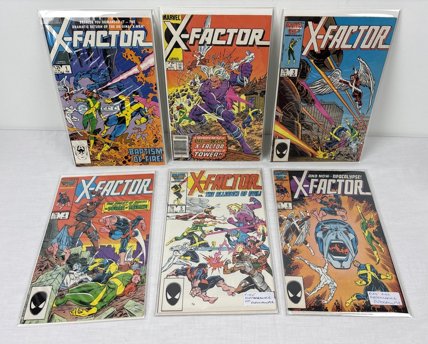 Issues #1-6 of X-Factor comic book by Marvel Comics, 1986. Featuring 1st appearances of X-Factor Team, Russell 'Rusty' Collins (Firefist), Cameron Hodge, Artie Maddicks (Auther Maddicks), Tower (Edward Pasternak), Frenzy (Joanna Cargill), Alliance of Evil, Stinger (Wendy Sherman), Timeshadow and Apocalypse (En Sabah Nur). As well as 2nd appearance of Cable (Nathan Summers) as a baby. All issues are bagged & carded.