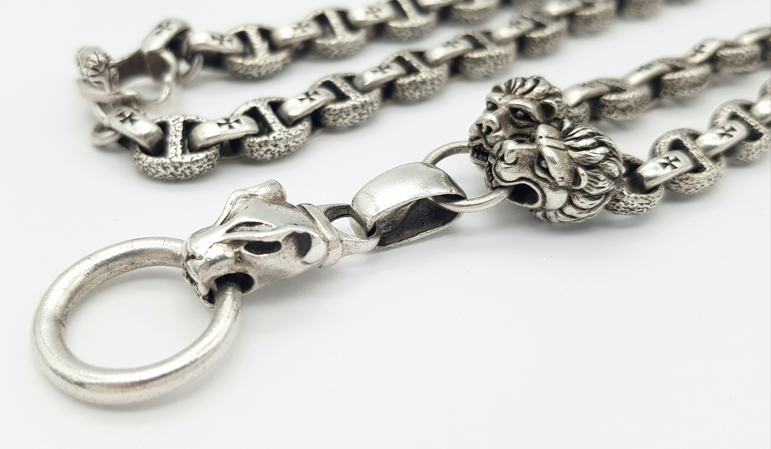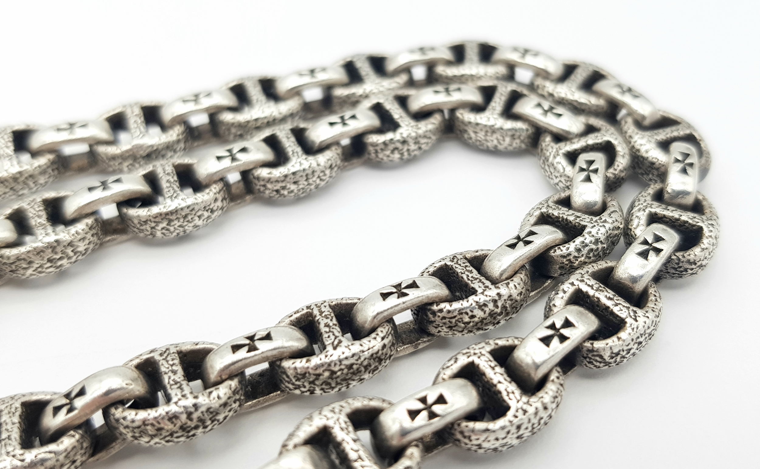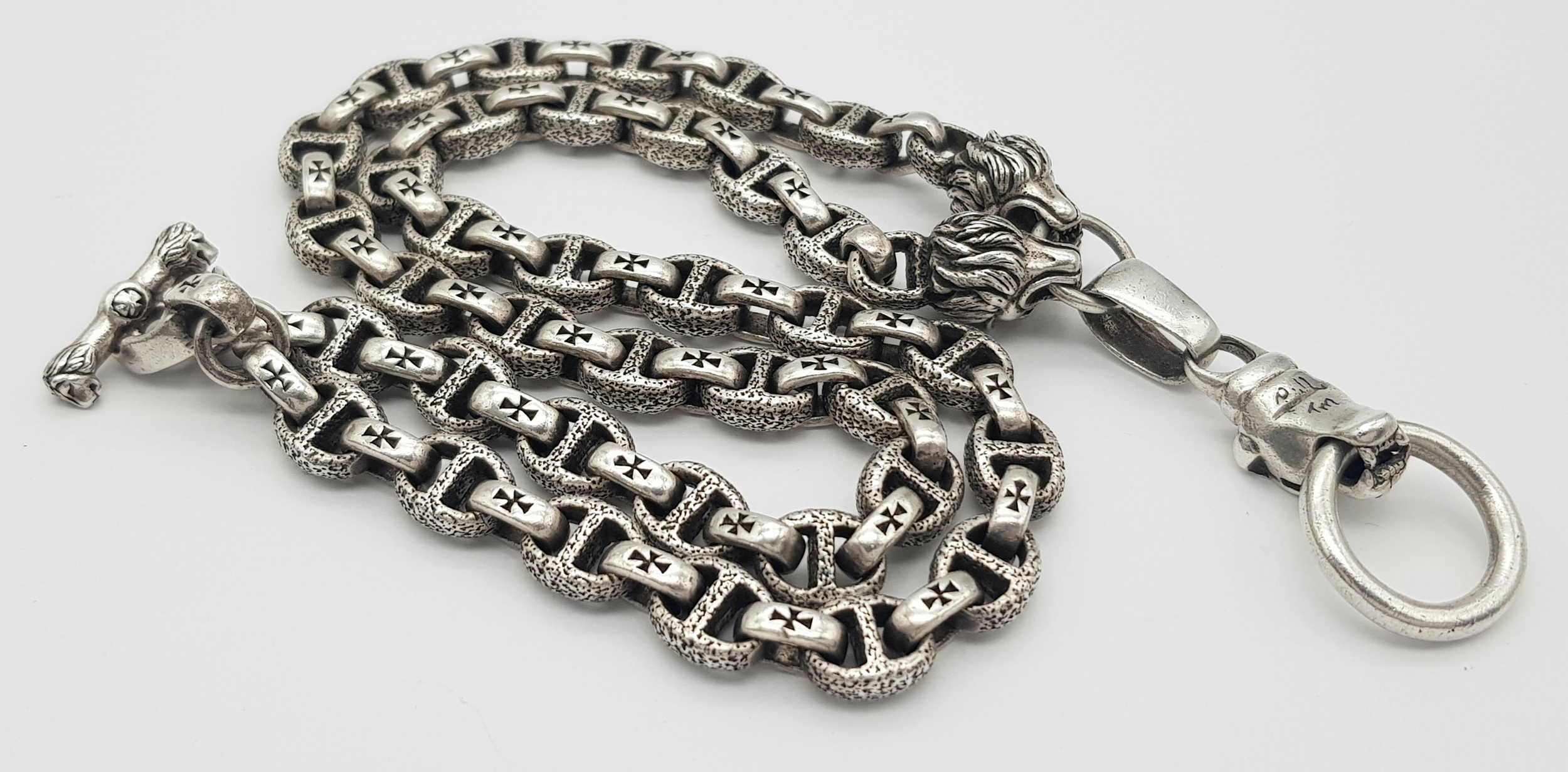 A STERLING SILVER, PANTHERS HEAD, ANCHOR LINK NECKLACE, WITH SADDLE T BAR CLASP. 22 INCHES LONG, TOTAL WEIGHT 133.5G. 10037