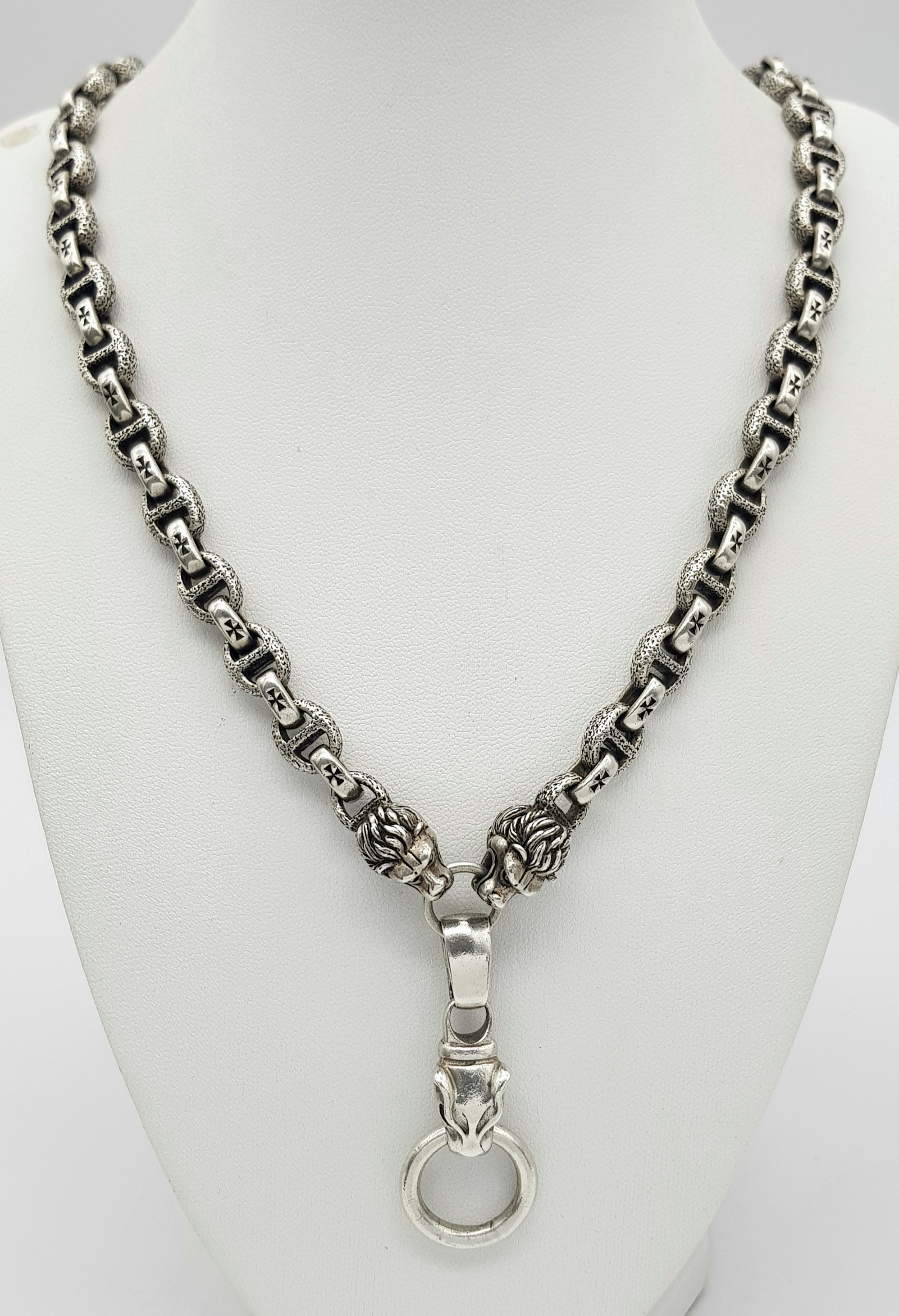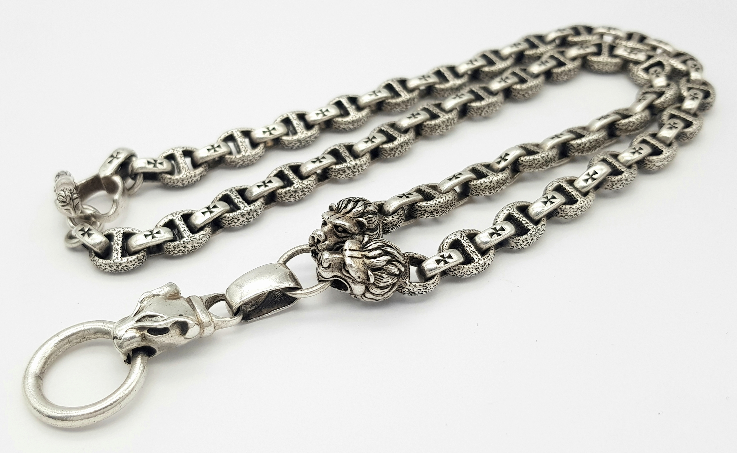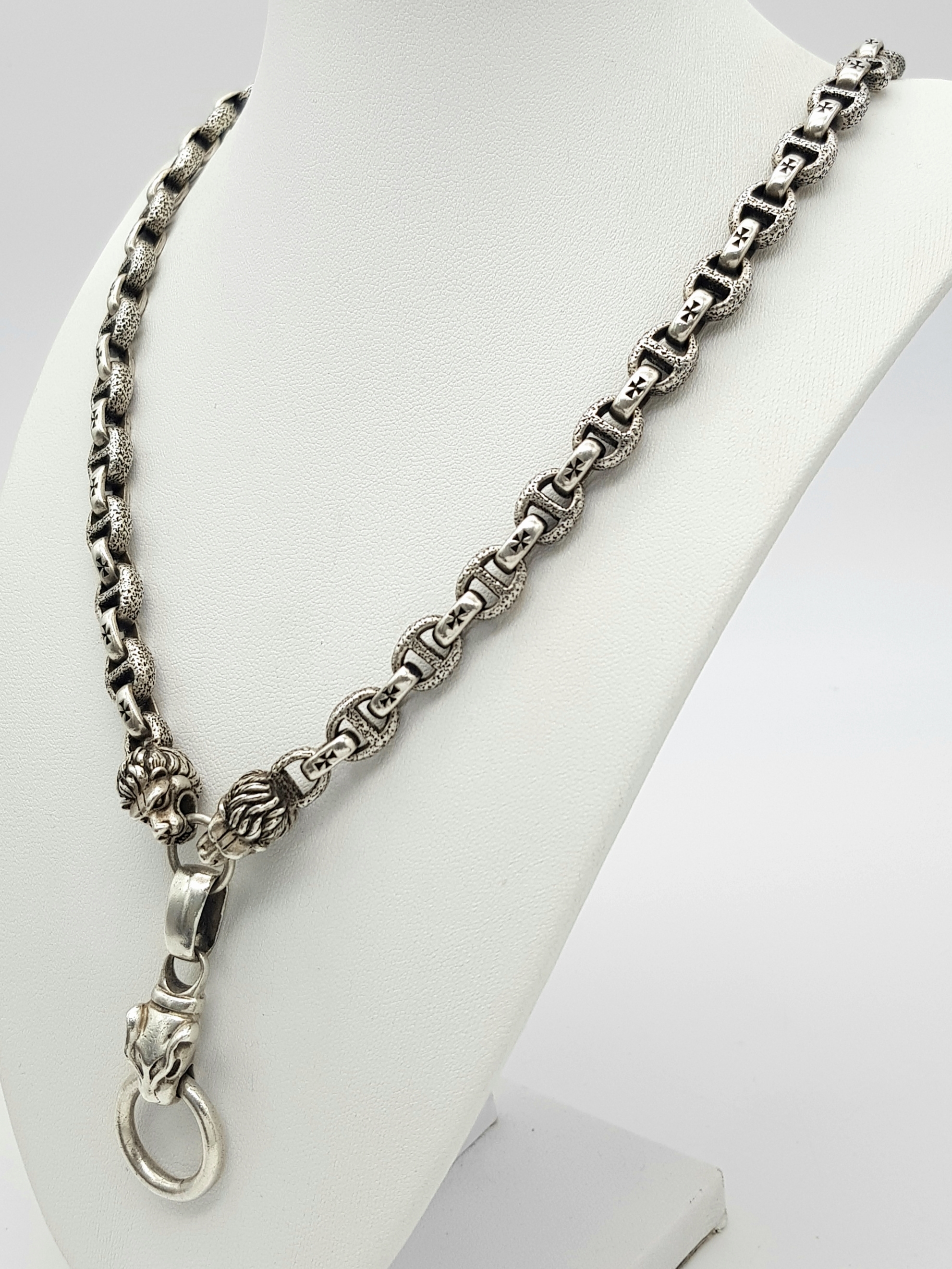 A STERLING SILVER, PANTHERS HEAD, ANCHOR LINK NECKLACE, WITH SADDLE T BAR CLASP. 22 INCHES LONG, TOTAL WEIGHT 133.5G. 10037