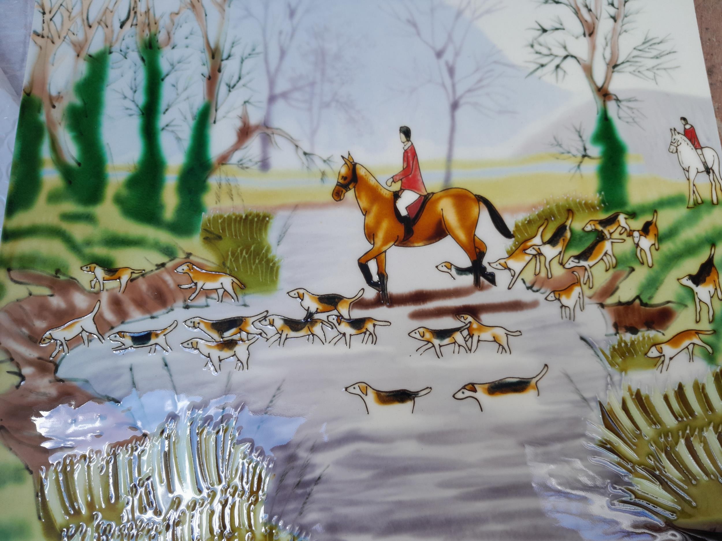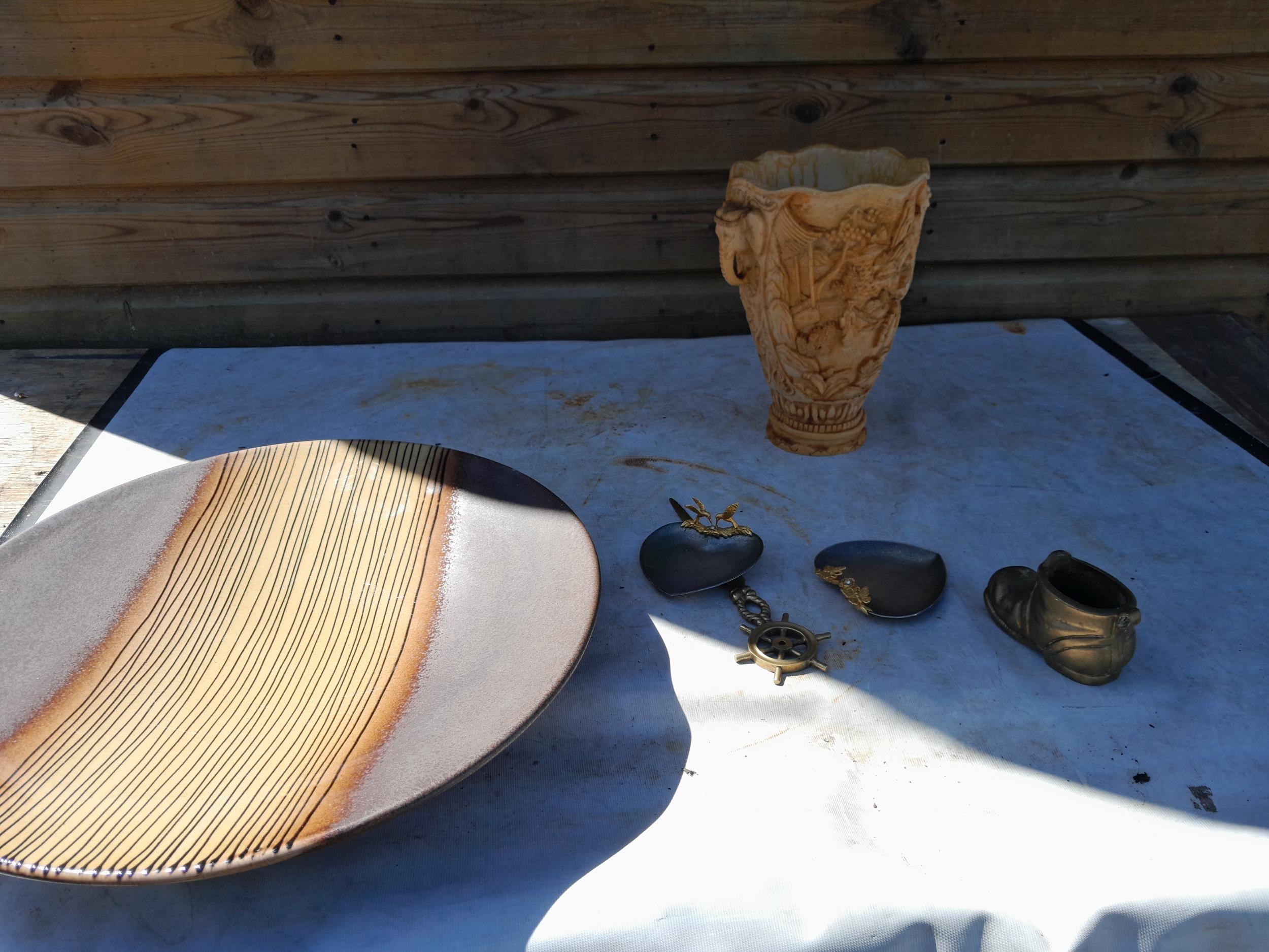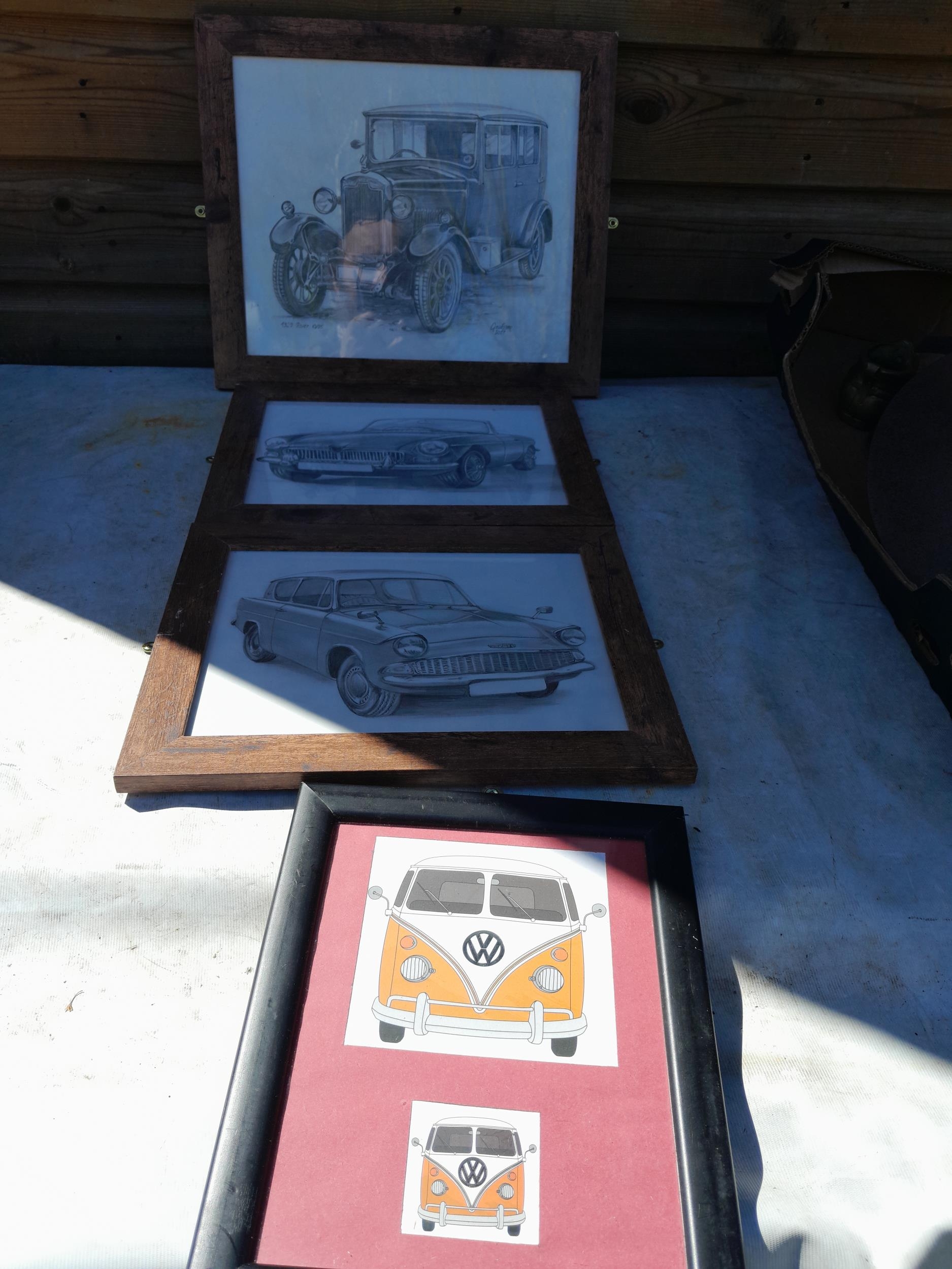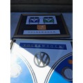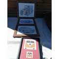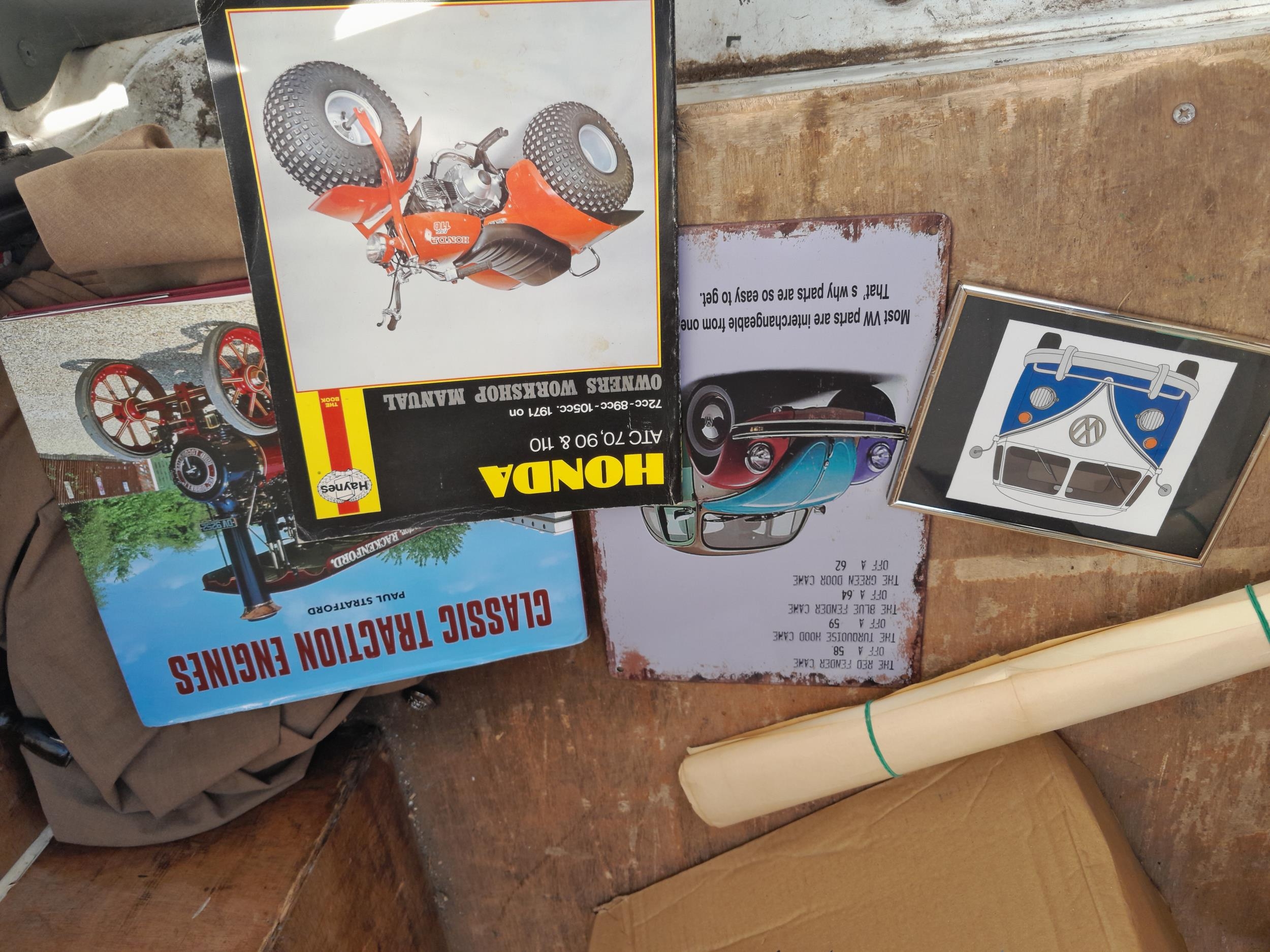 Box of oddments : tin sign modern, resin ornament, car related manuals, prints, African walking stick, ceramic picture , note glaze chip etc.