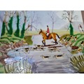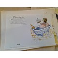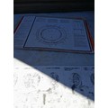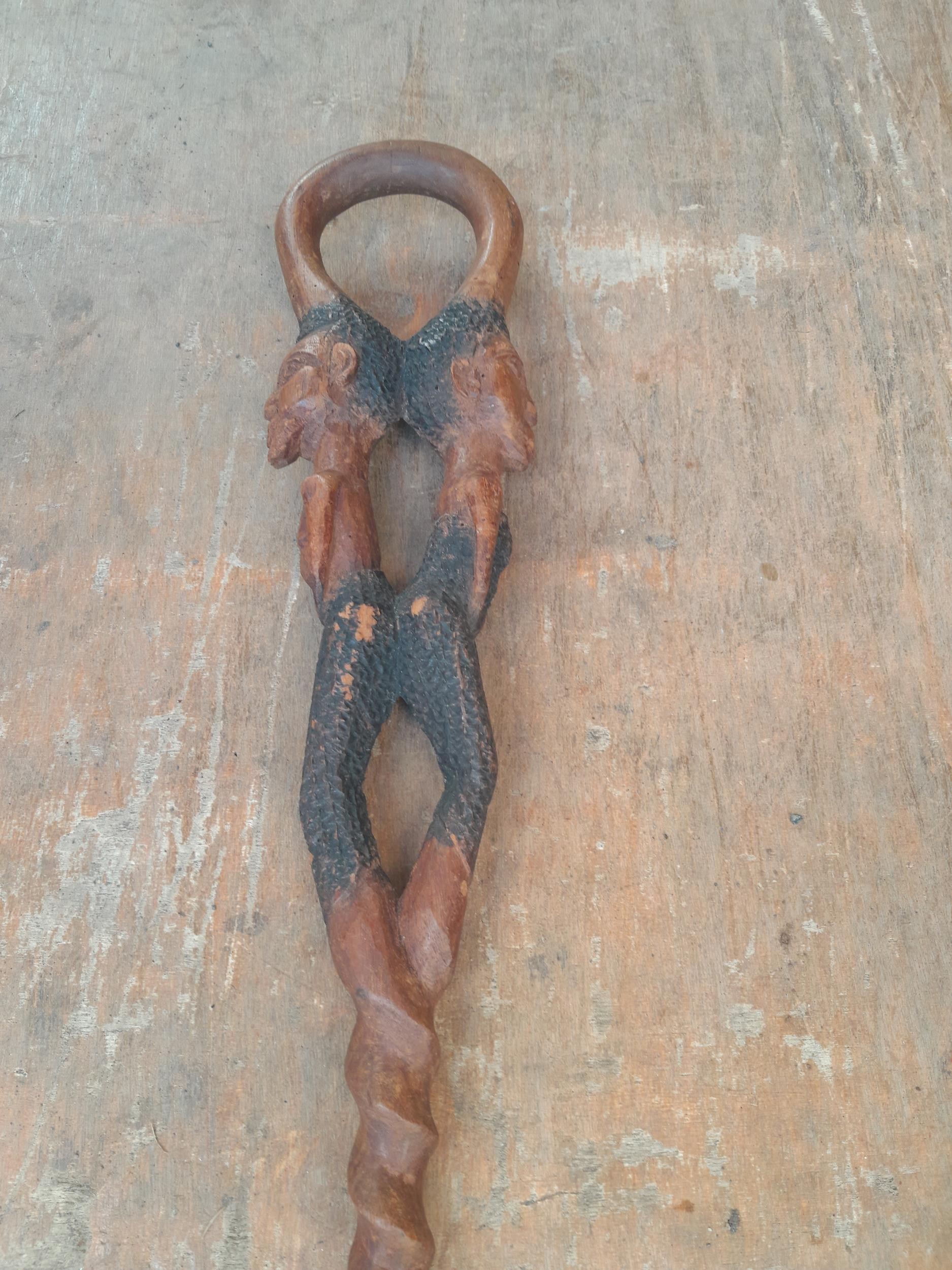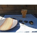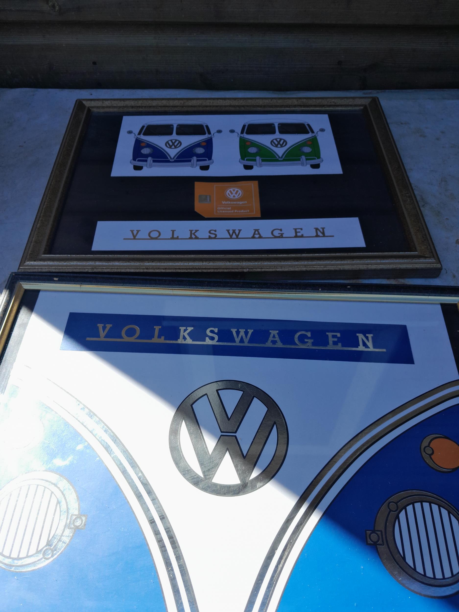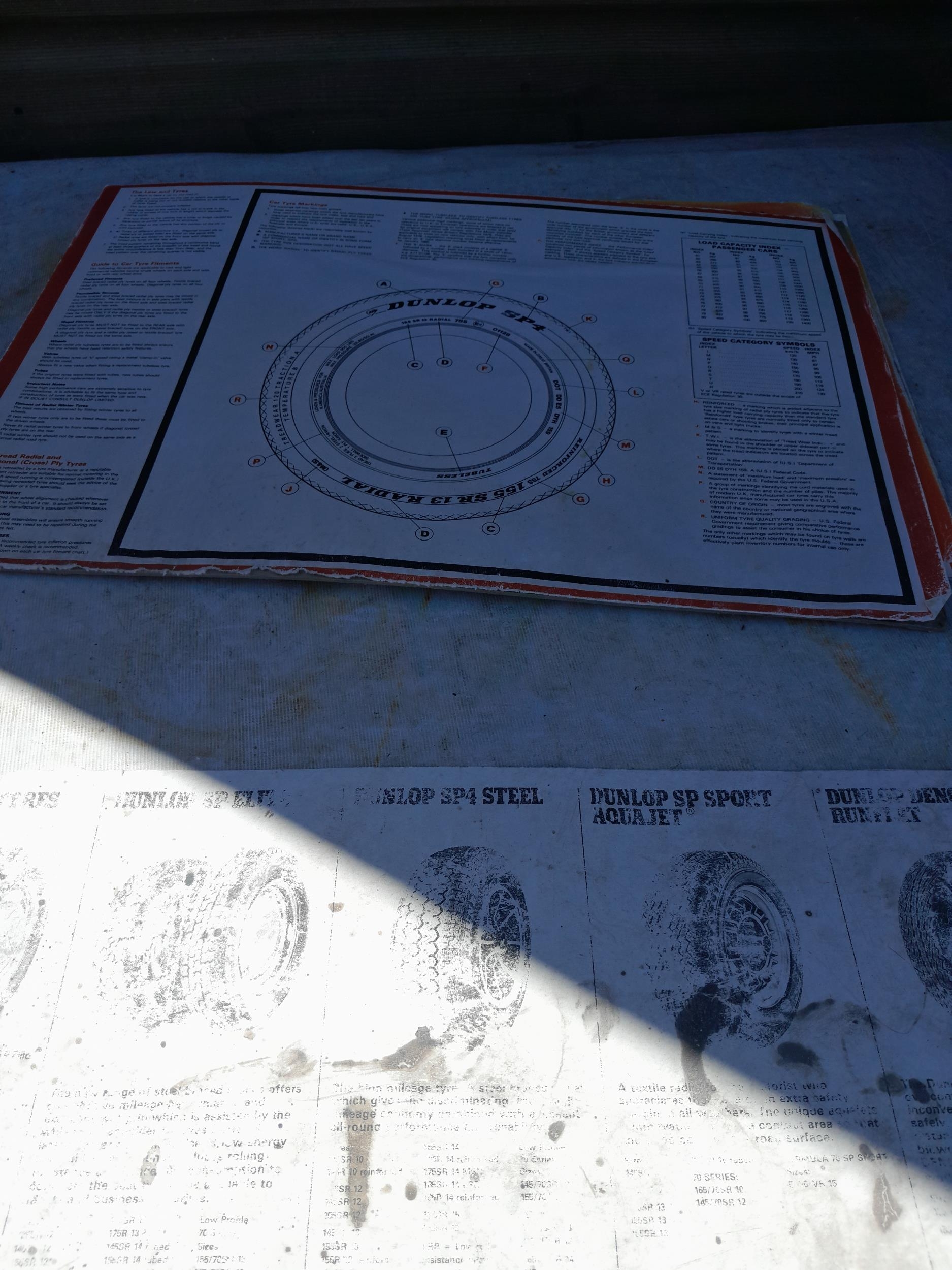 Box of oddments : tin sign modern, resin ornament, car related manuals, prints, African walking stick, ceramic picture , note glaze chip etc.