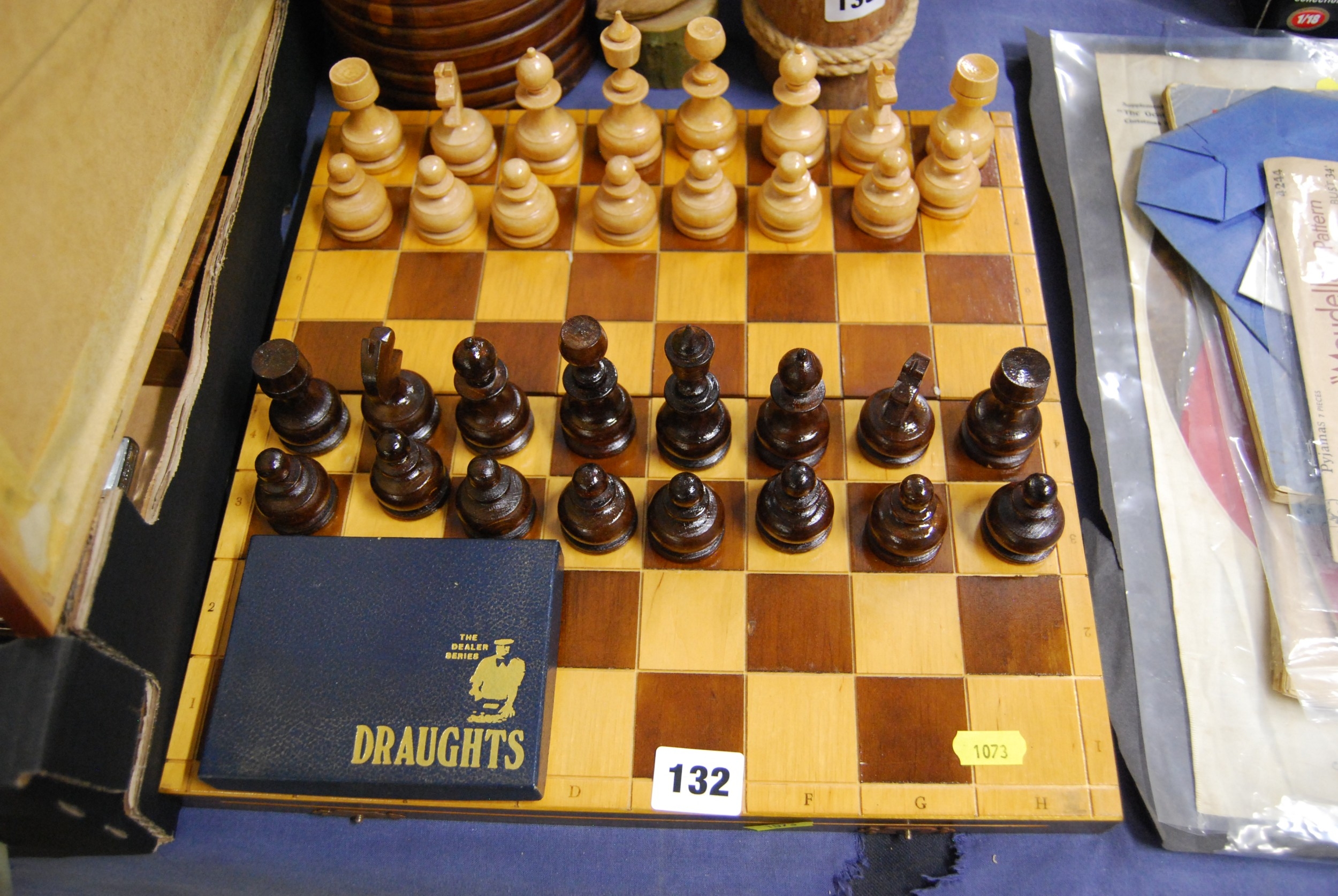 CARVED WOODEN CHESS SET, DOMINO SET AND BOARD