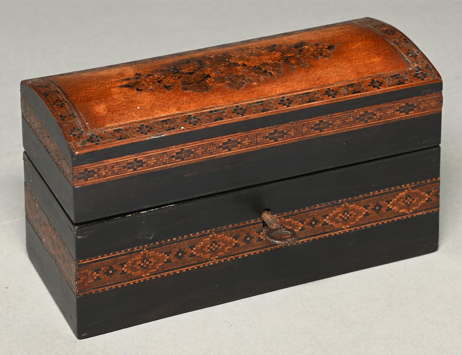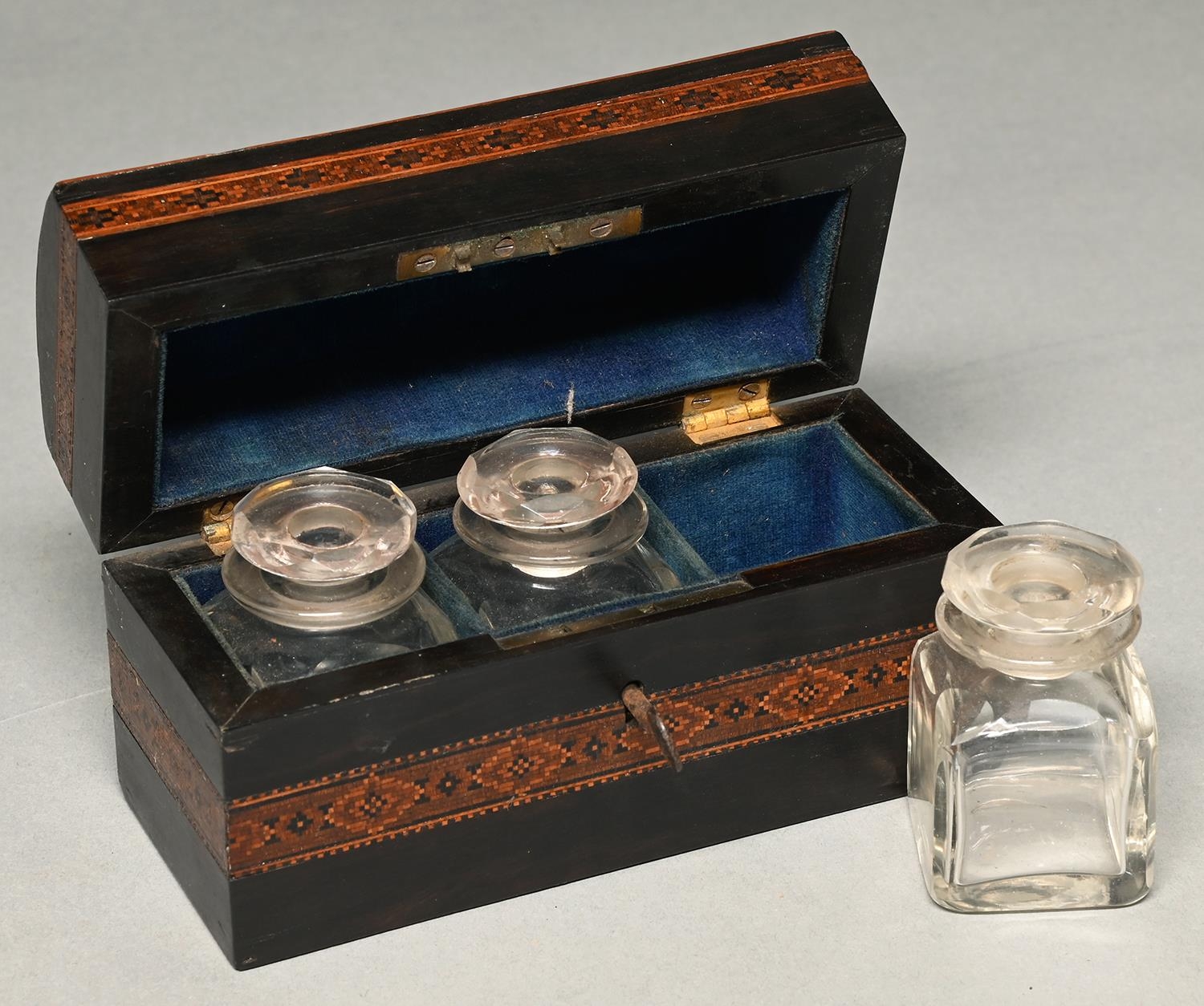 A Victorian Tunbridge ware scent casket, mid 19th c, the coffered lid decorated with flowers, the velvet lined interior retaining the three glass bottles and stoppers, 14cm l