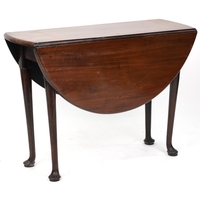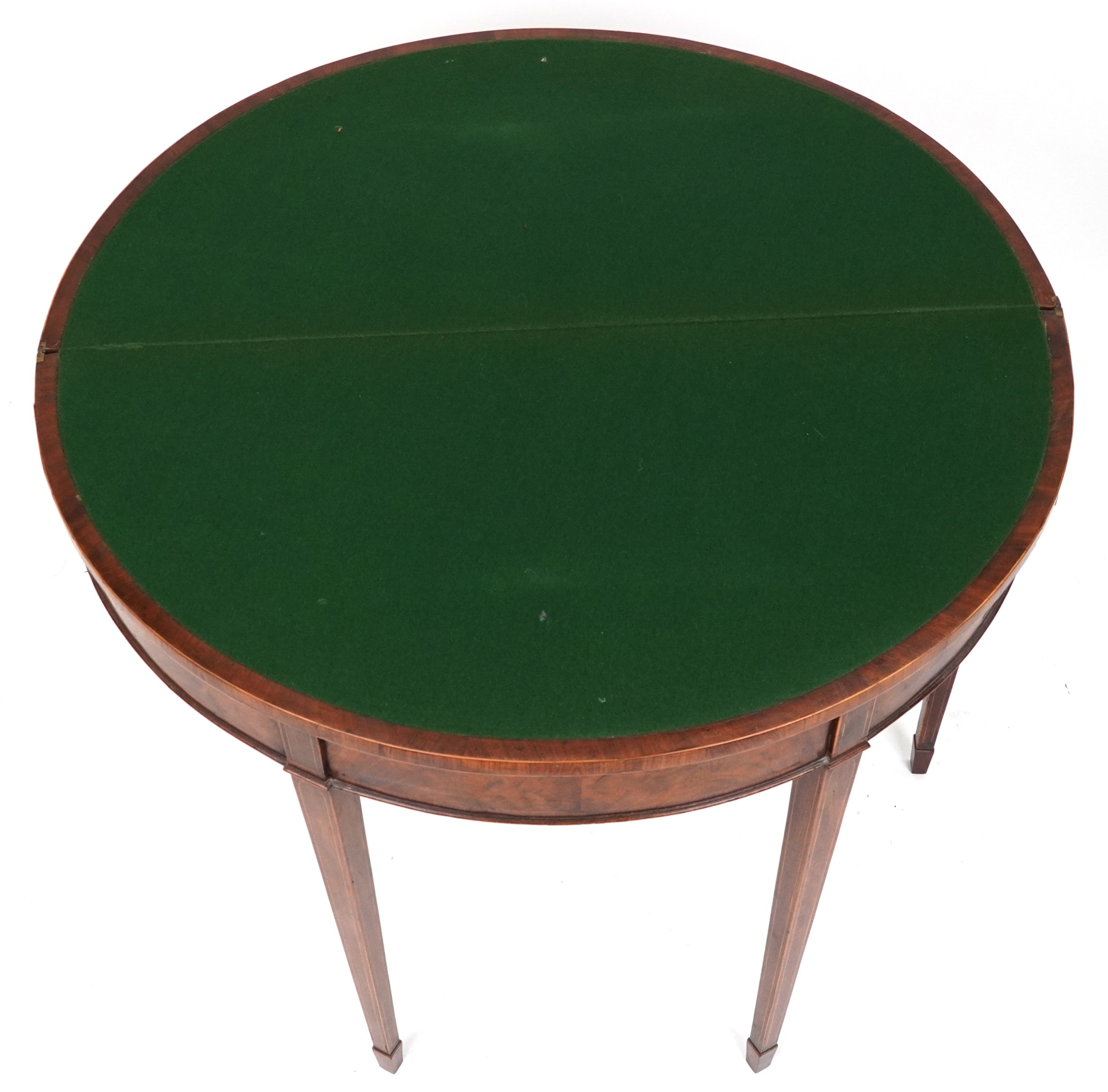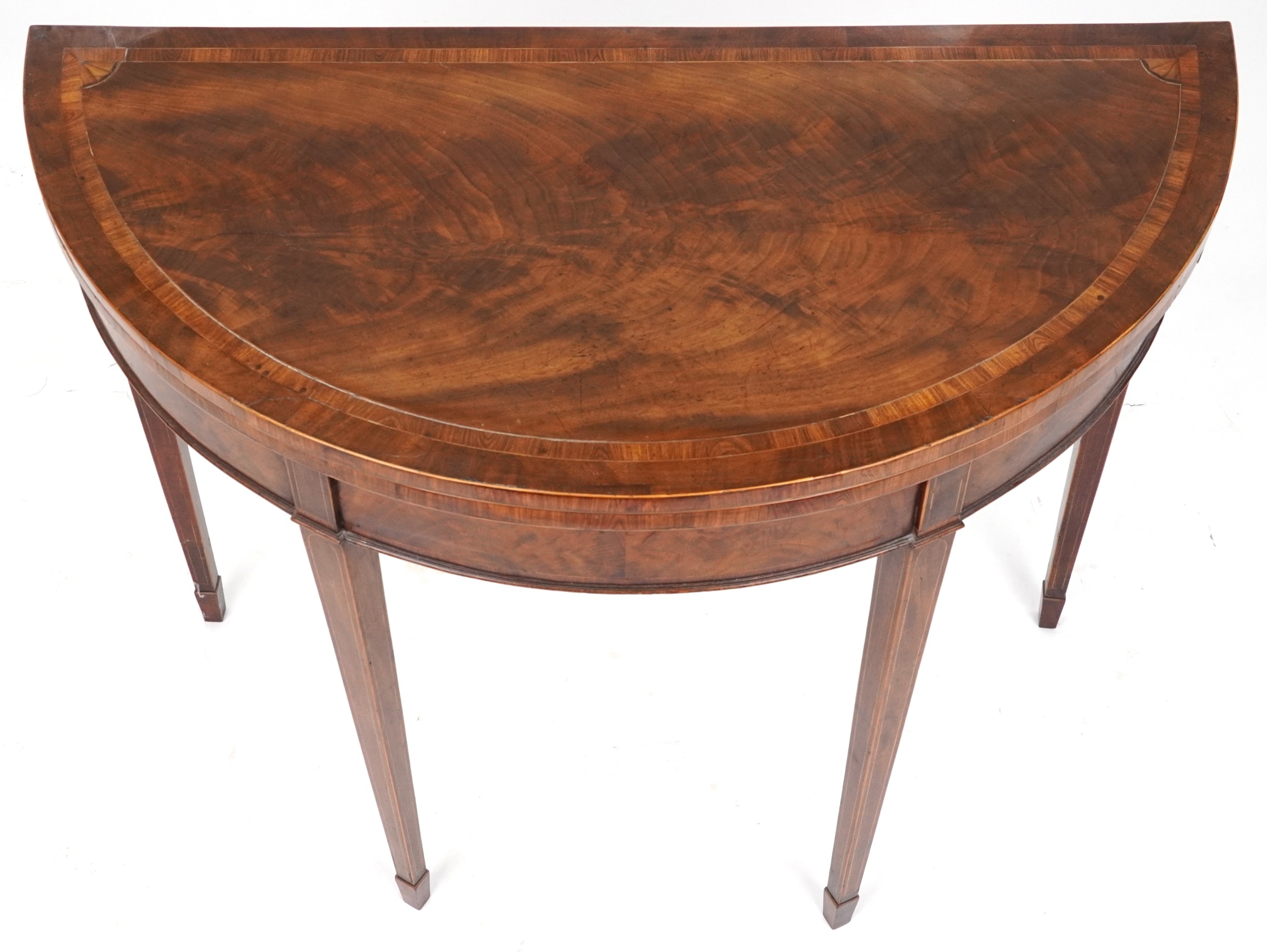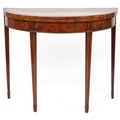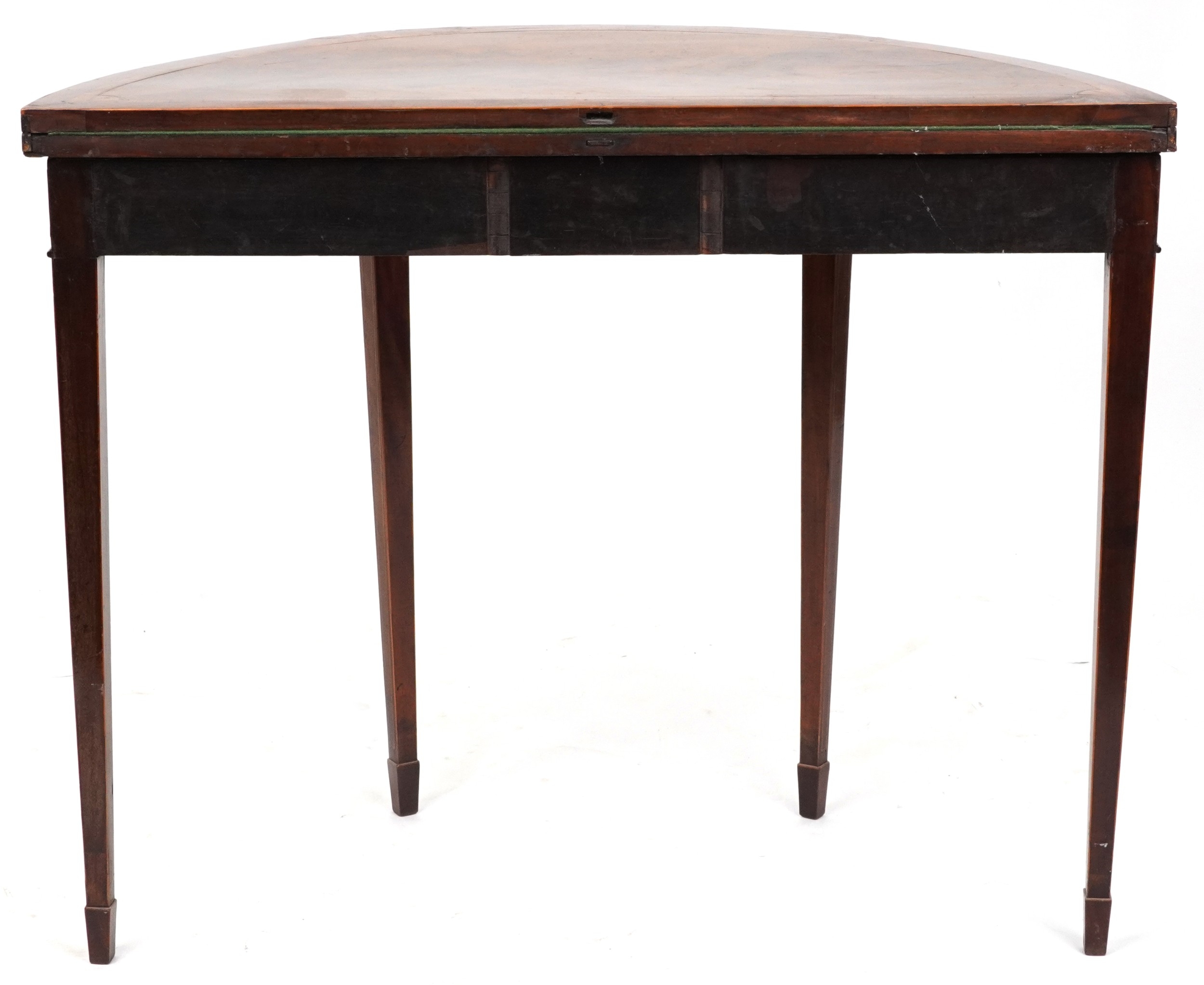 A late George III mahogany demi lune fold over card table raised on square tapering legs, 73cm H x 91cm W x 45cm D.