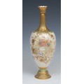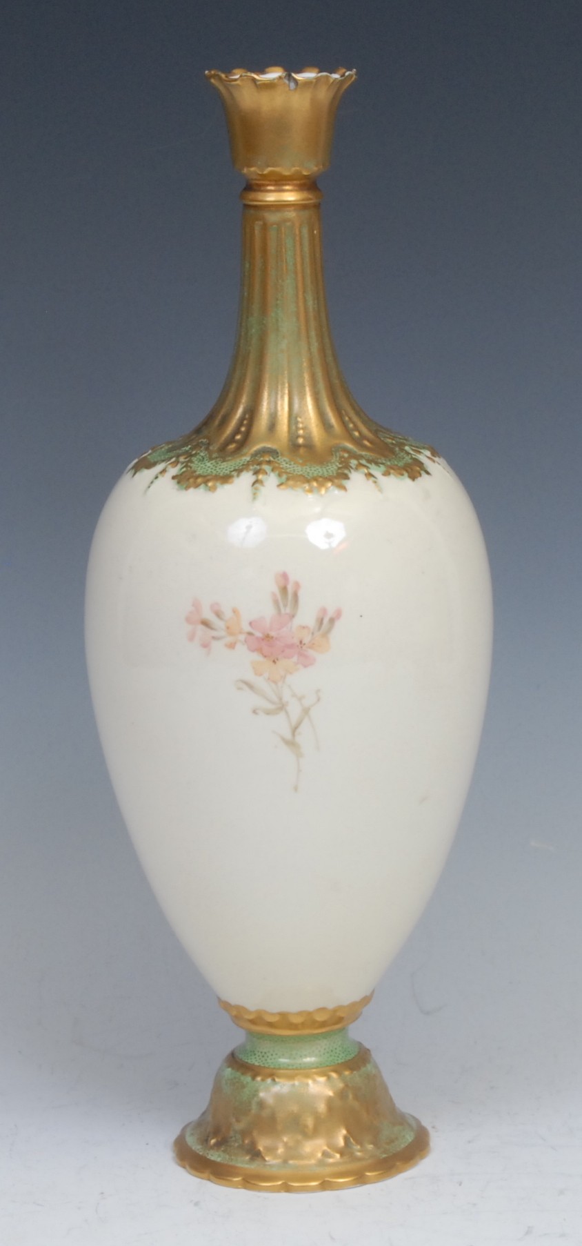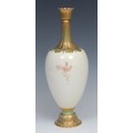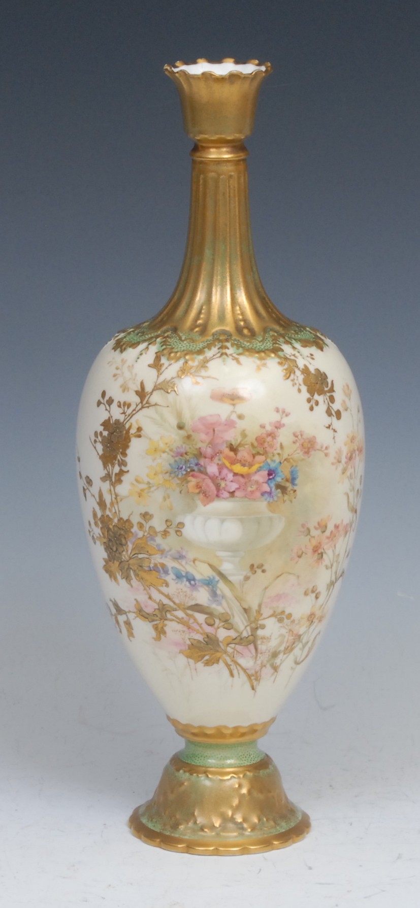 A Royal Crown Derby ovoid pedestal vase, painted with an urn of flowers, picked out in gilt on a blush ground, 31cm high, printed mark