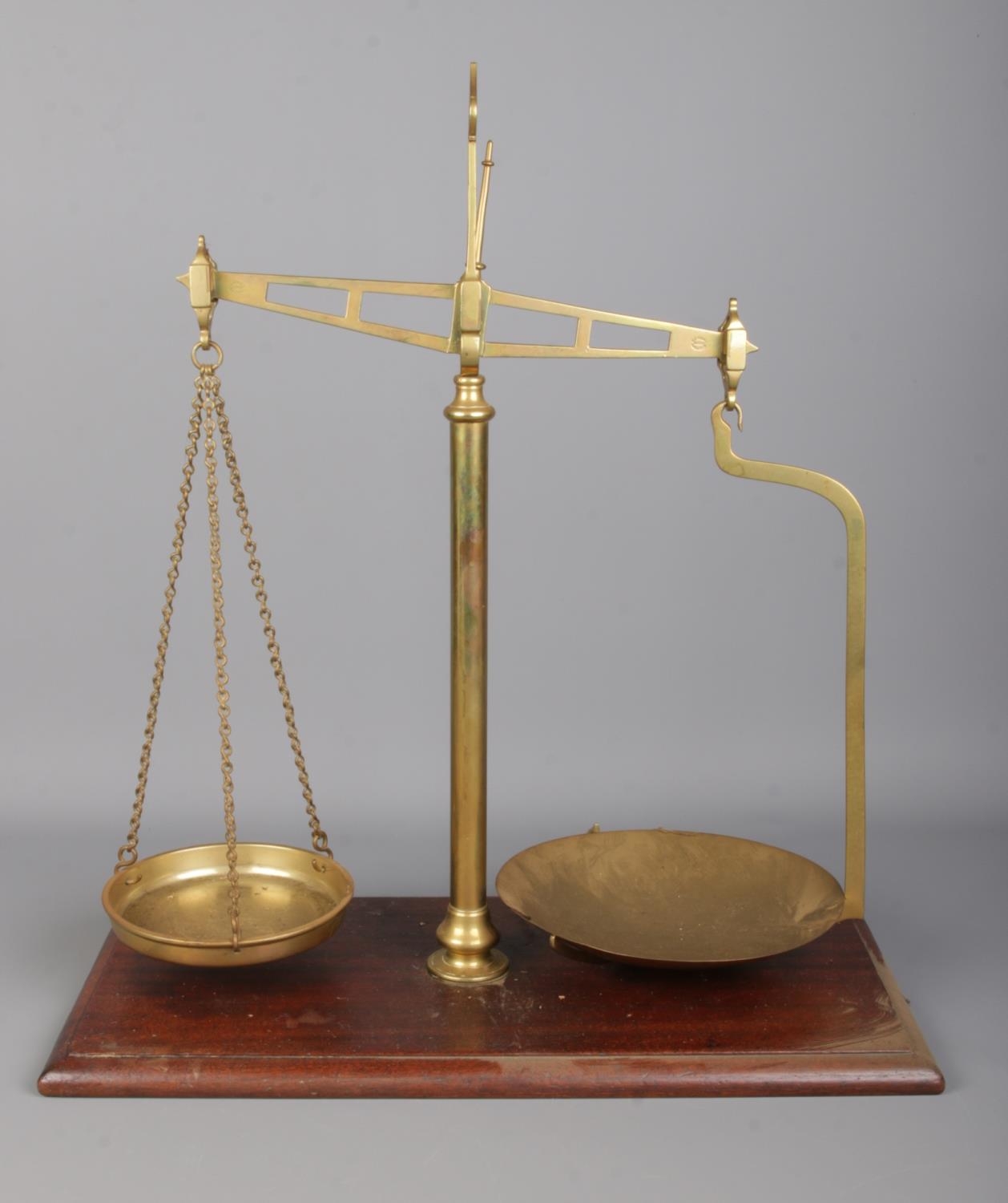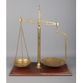 A set of brass balance scales on wooden base. The frame stamped for Parnall & Sons, Bristol.