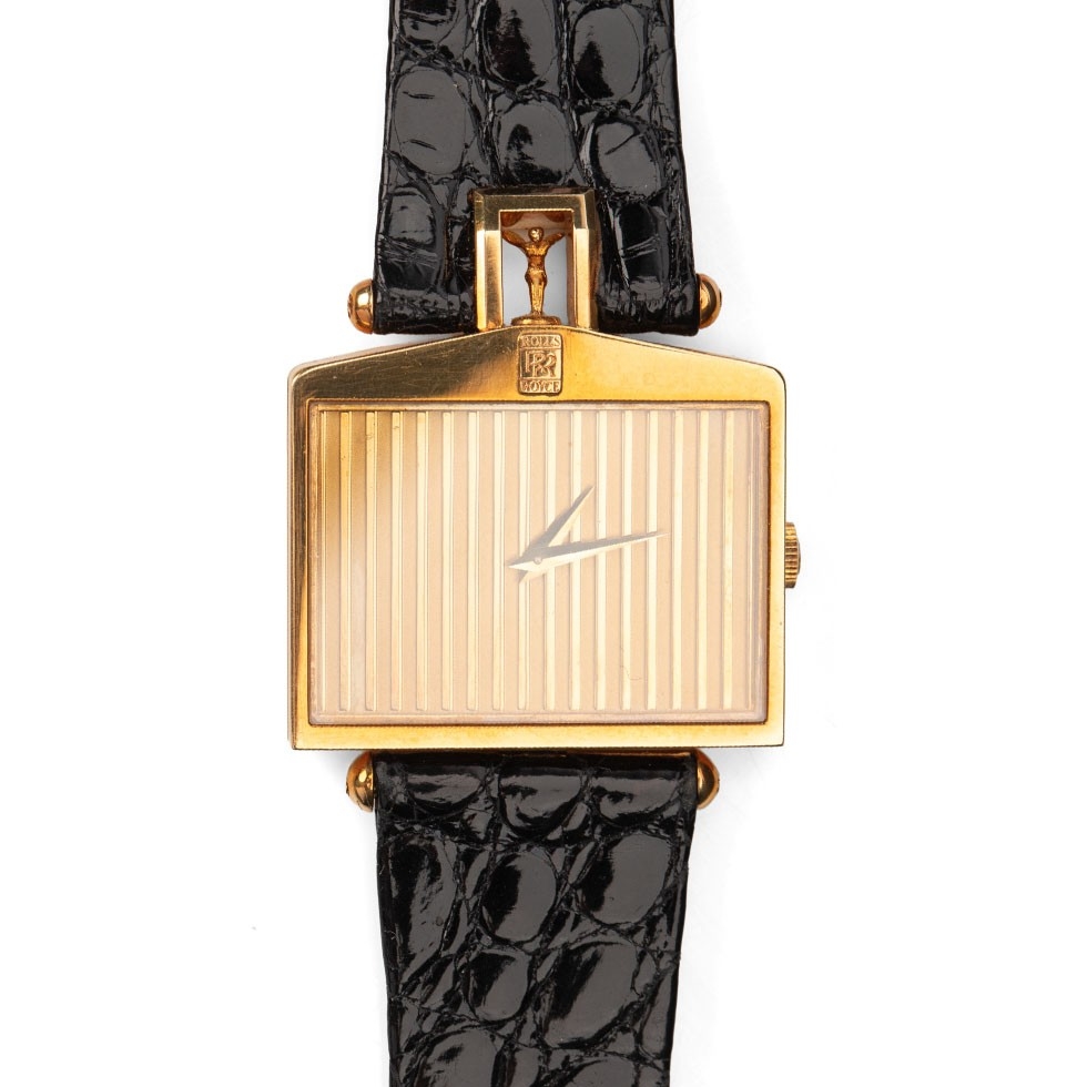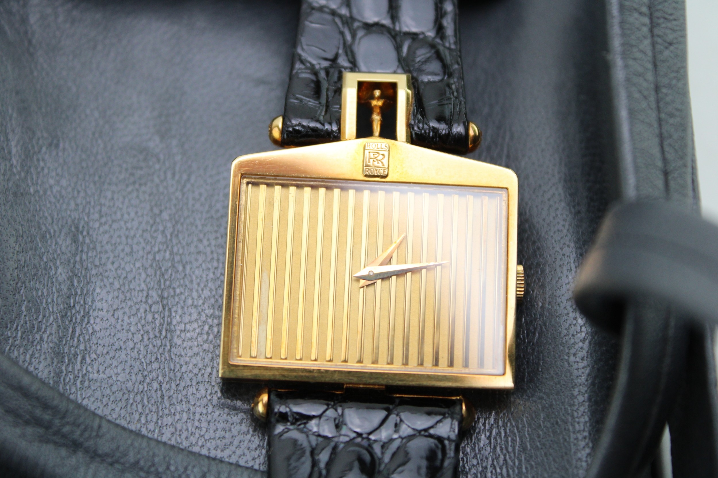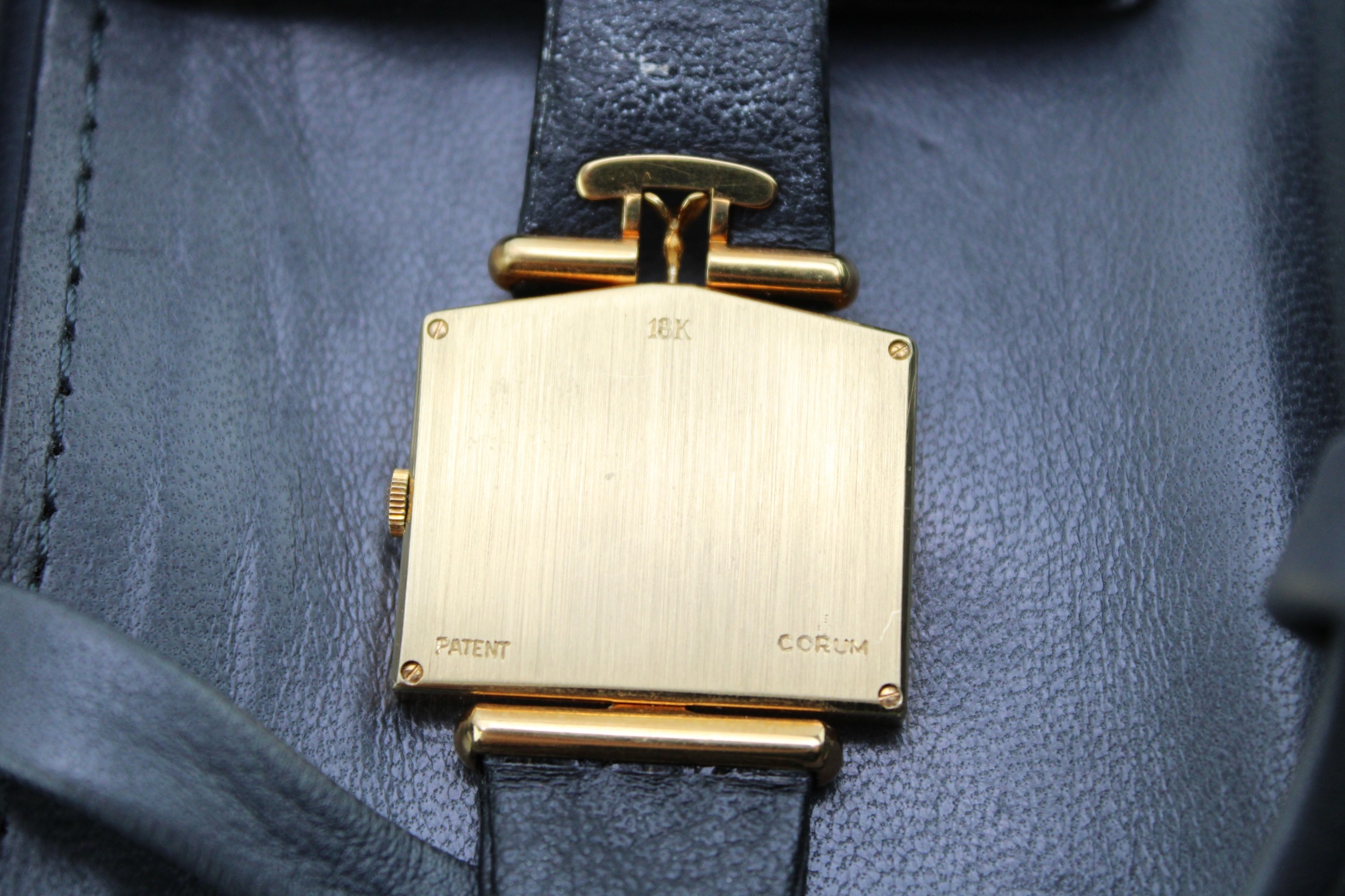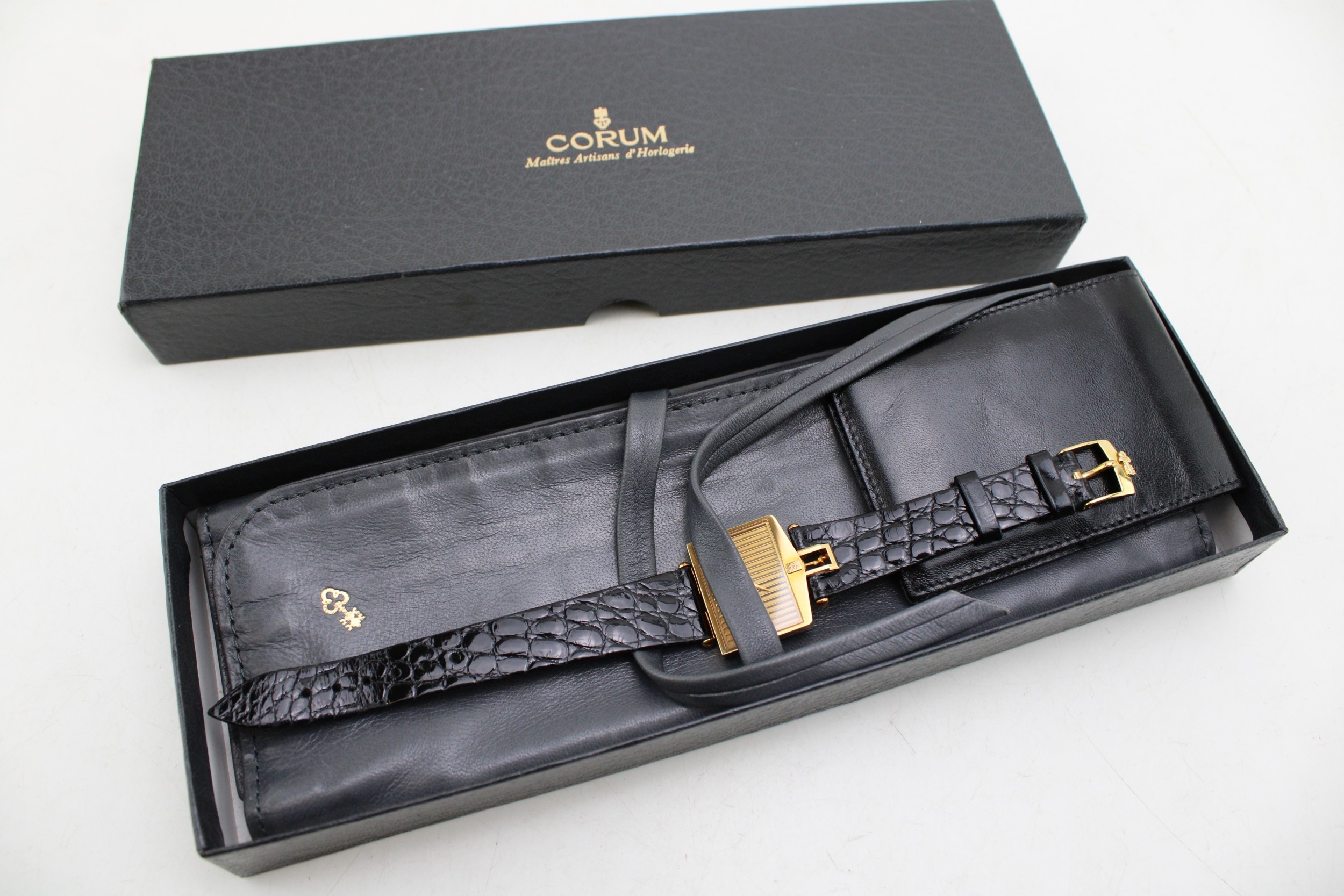 A gentleman's 18ct gold Corum Rolls Royce Spirit of Ecstasy dress watch, modelled as a Rolls Royce radiator grill, surmounted by a miniature Spirit of Ecstasy figure inside top lug, above Rolls Royce emblem, Corum key logo to the crown, the brushed back stamped 18K, Patent, Corum, with four screw fixings, quartz movement, on Corum black stamped faux crocodile strap with plated buckle, all marked Corum, complete with original booklet, guarantee, leather roll and box. Hands set appropriately, kept time for period observed. Back not removed, serial numbers are usually on movement or inside back cover.