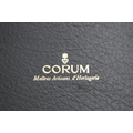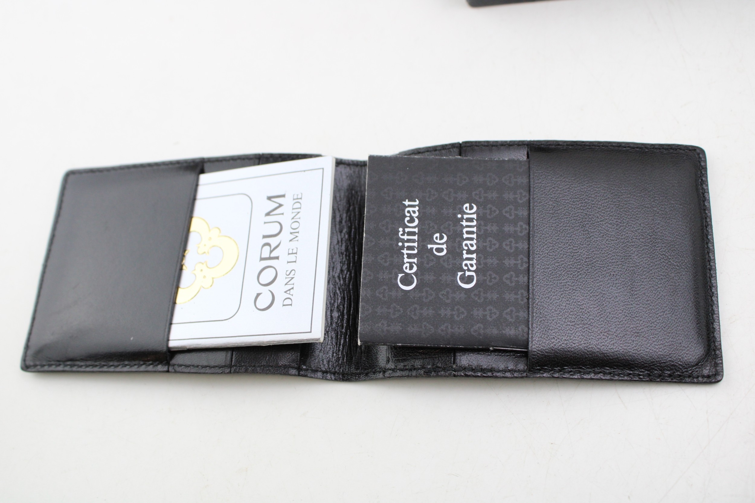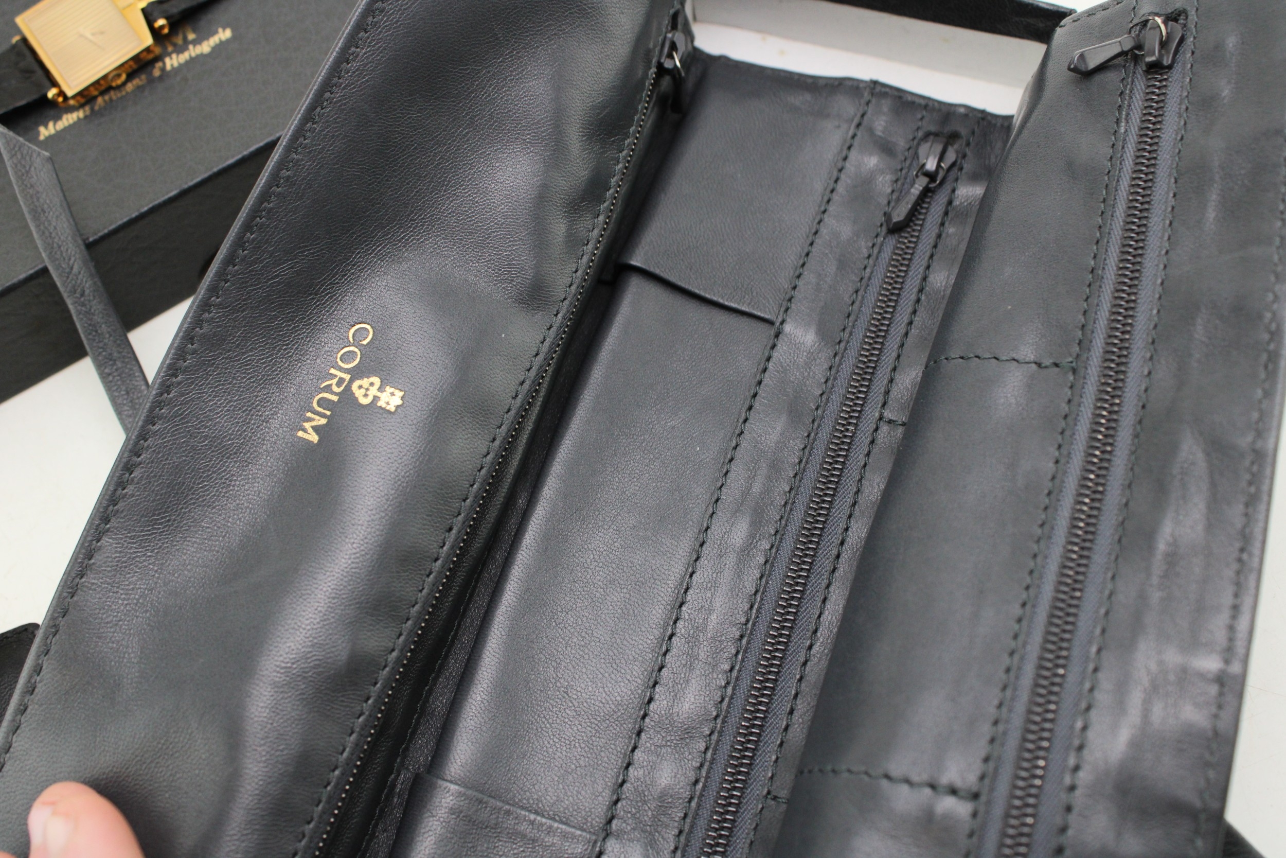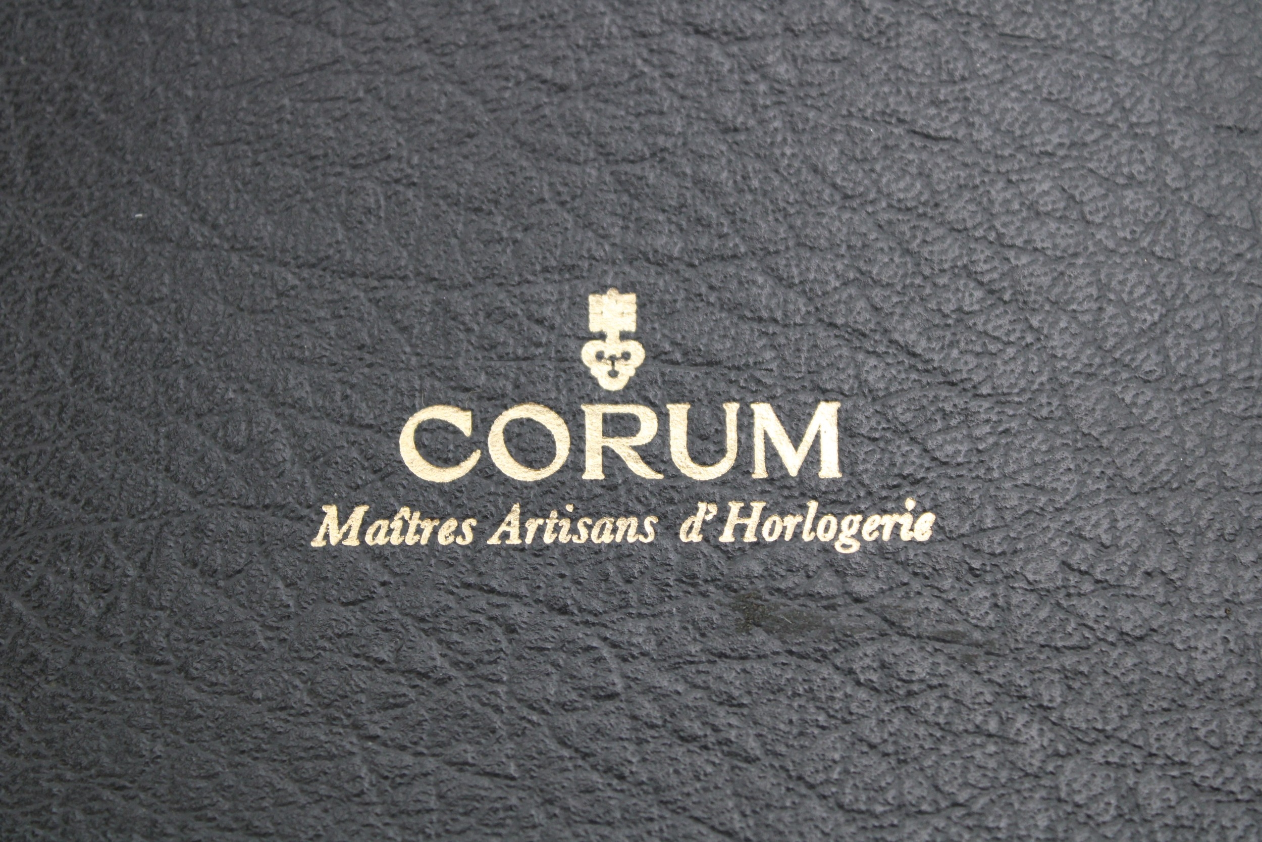 A gentleman's 18ct gold Corum Rolls Royce Spirit of Ecstasy dress watch, modelled as a Rolls Royce radiator grill, surmounted by a miniature Spirit of Ecstasy figure inside top lug, above Rolls Royce emblem, Corum key logo to the crown, the brushed back stamped 18K, Patent, Corum, with four screw fixings, quartz movement, on Corum black stamped faux crocodile strap with plated buckle, all marked Corum, complete with original booklet, guarantee, leather roll and box. Hands set appropriately, kept time for period observed. Back not removed, serial numbers are usually on movement or inside back cover.