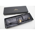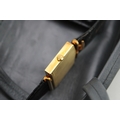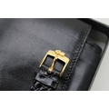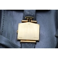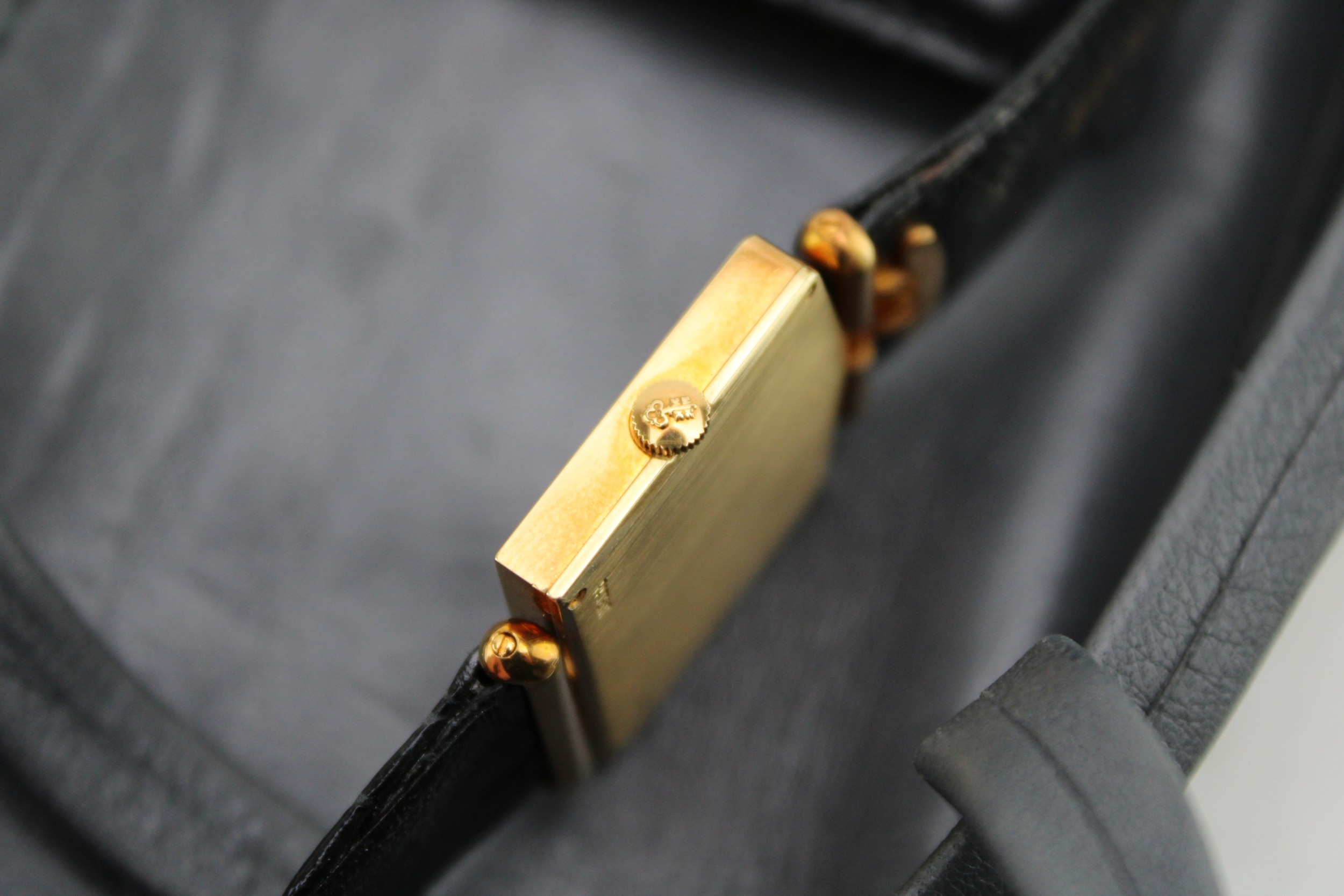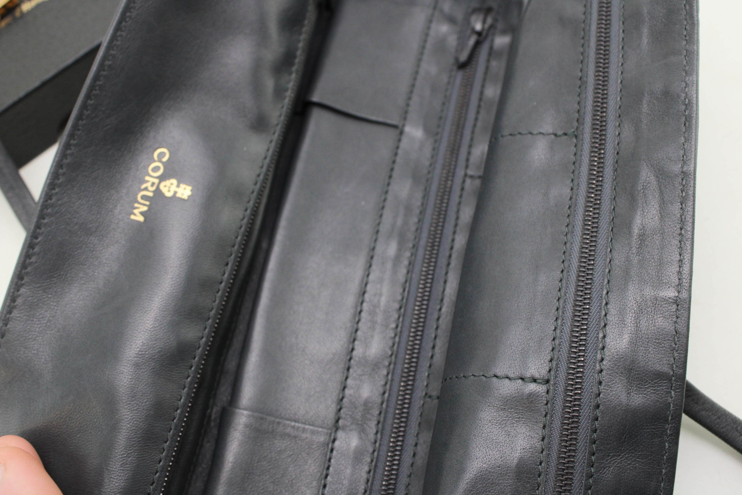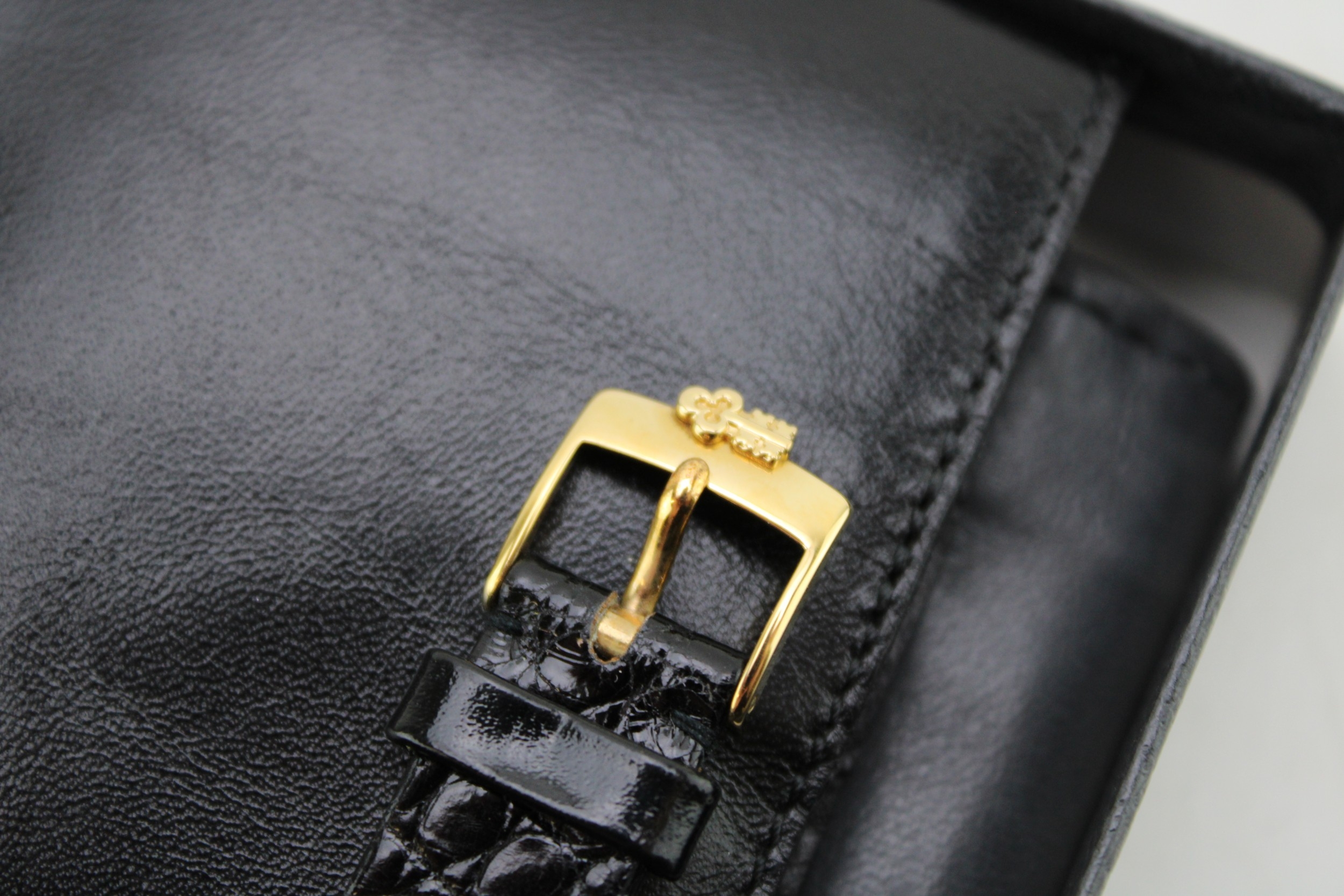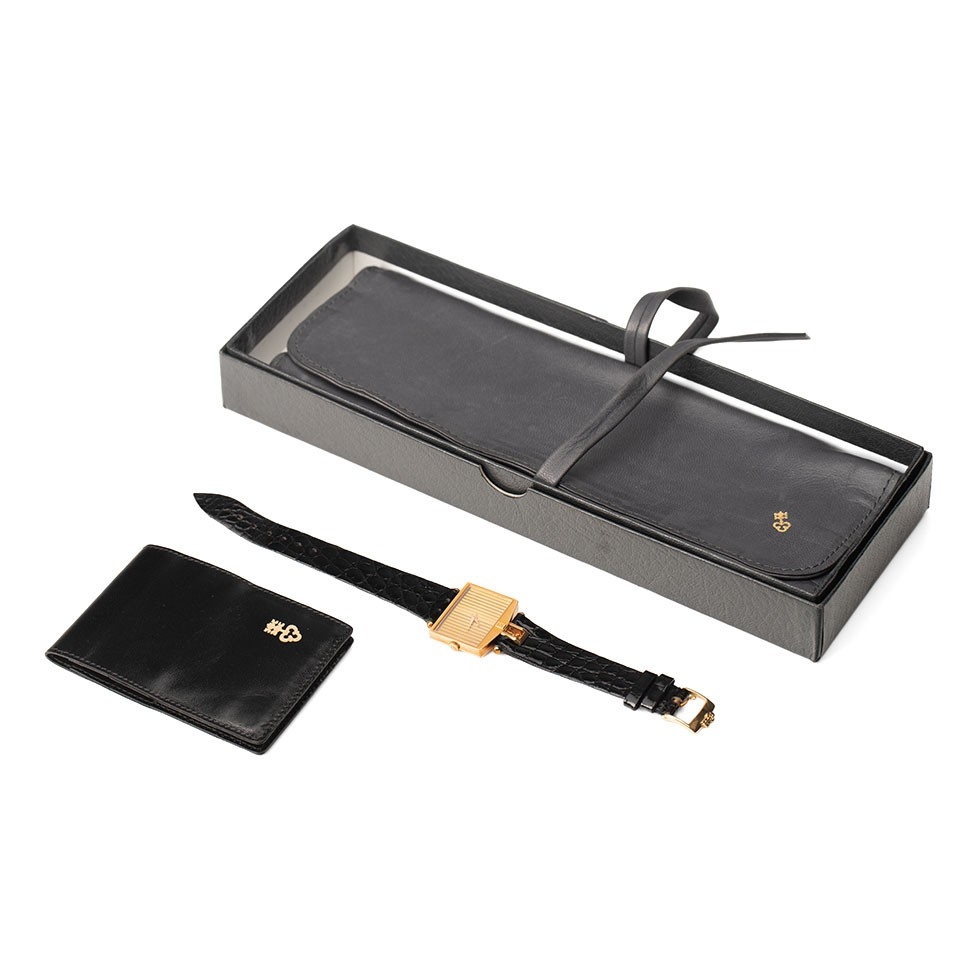 A gentleman's 18ct gold Corum Rolls Royce Spirit of Ecstasy dress watch, modelled as a Rolls Royce radiator grill, surmounted by a miniature Spirit of Ecstasy figure inside top lug, above Rolls Royce emblem, Corum key logo to the crown, the brushed back stamped 18K, Patent, Corum, with four screw fixings, quartz movement, on Corum black stamped faux crocodile strap with plated buckle, all marked Corum, complete with original booklet, guarantee, leather roll and box. Hands set appropriately, kept time for period observed. Back not removed, serial numbers are usually on movement or inside back cover.