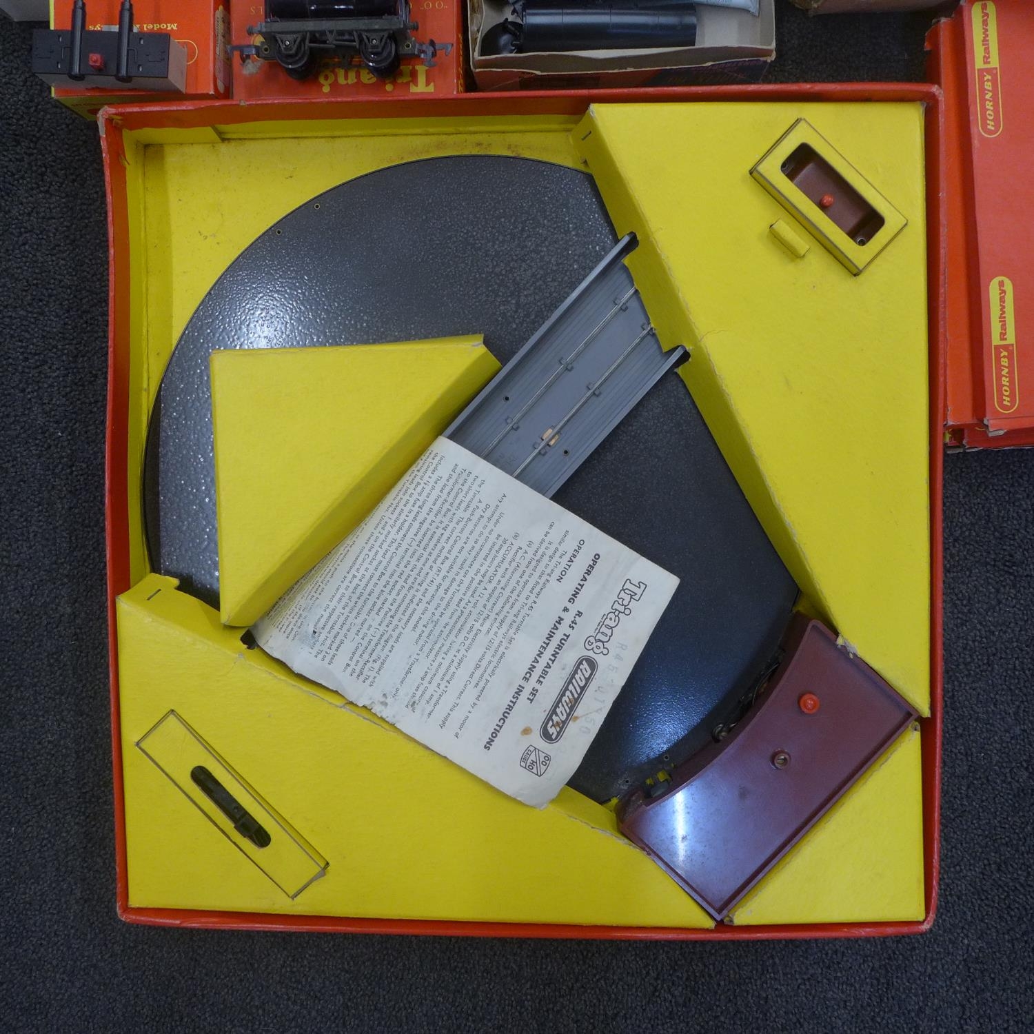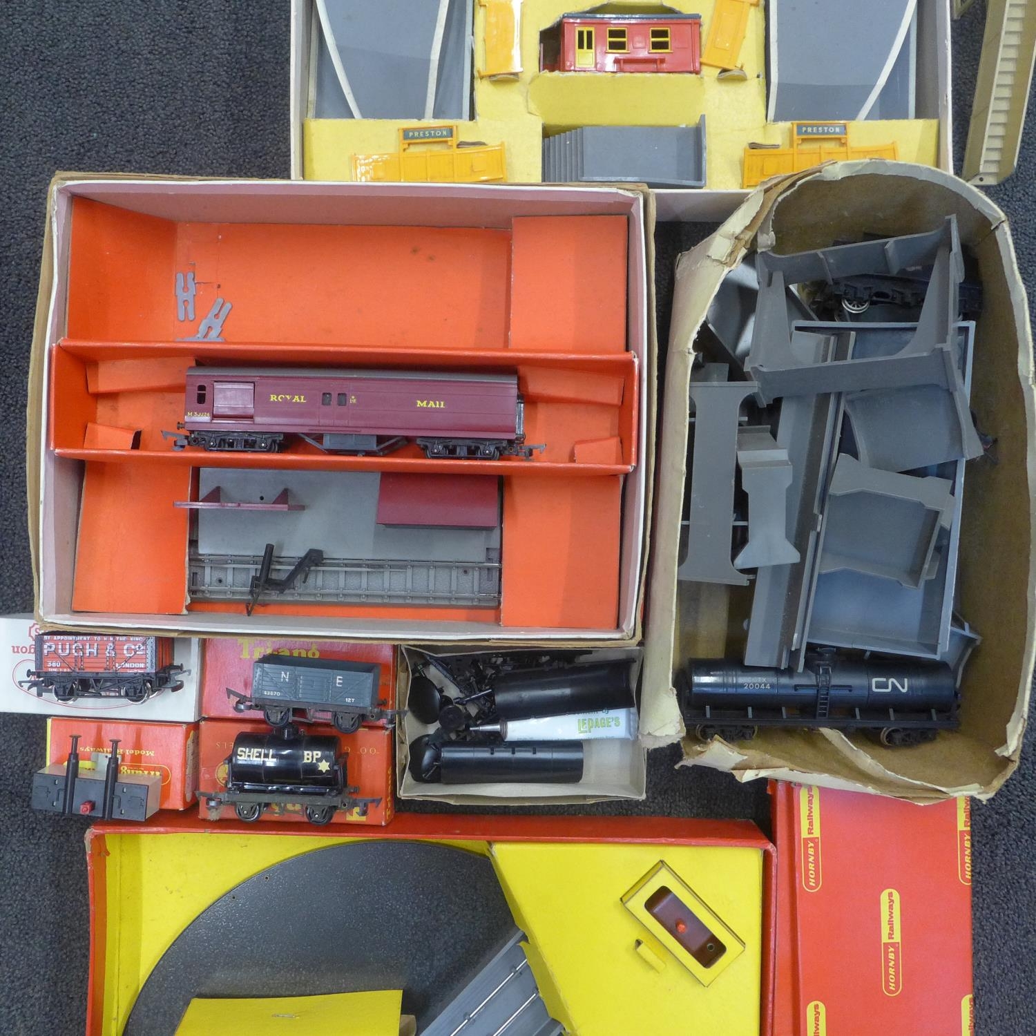 A collection of Tri-ang model railway including wagons, railway, a Mail Coach set, Station set, turntable set, etc.