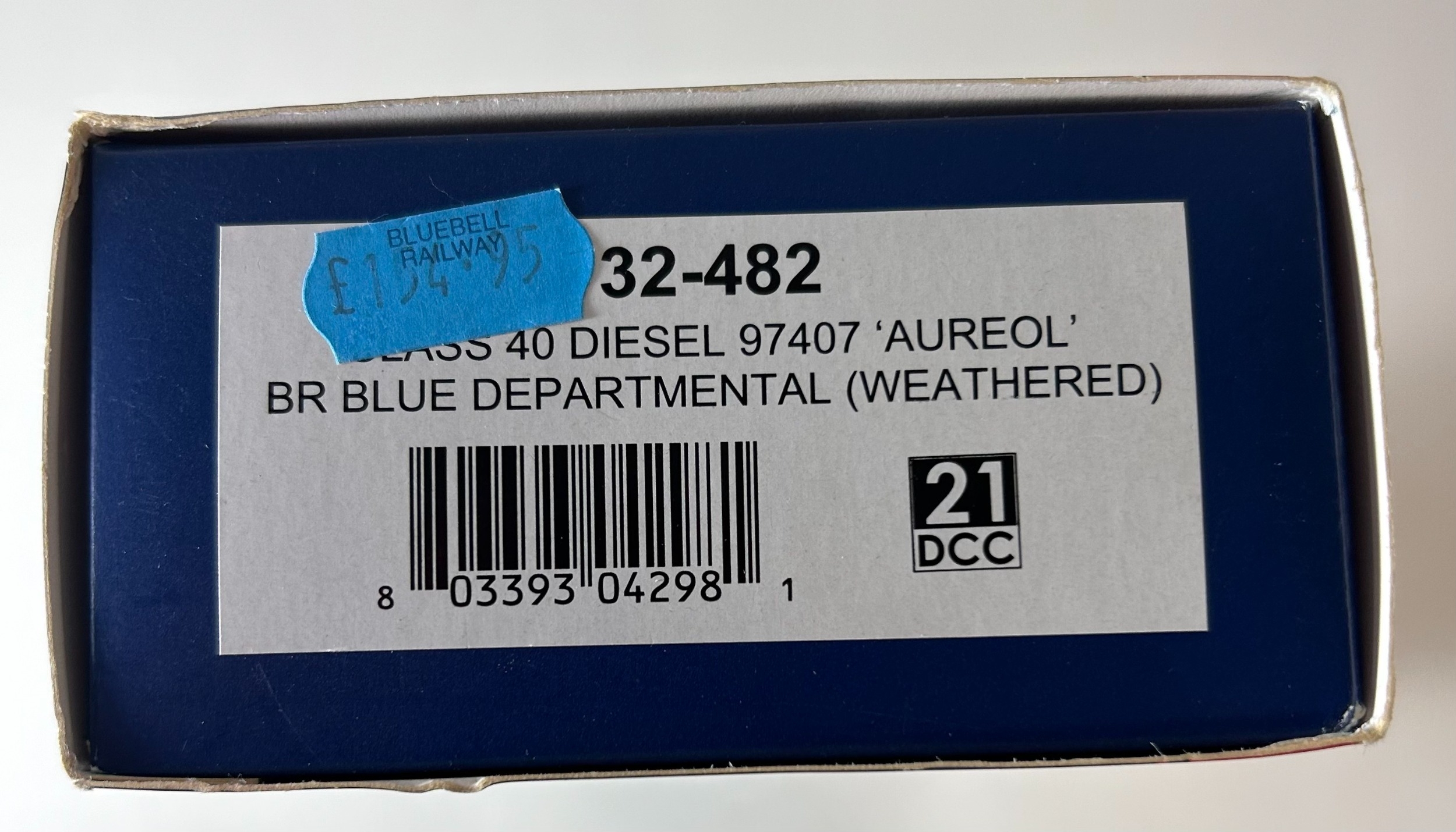 Bachmann Branch-Line OO Diesel-Electric Locomotive. Class 40 97407 'Aureol' (32-482). With 21DCC. In BR Blue Departmental Weathered livery. Boxed, minor wear/light fading to a small part of box. Contents looks to be as new.