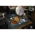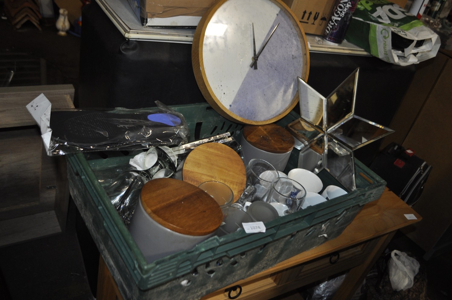 A LARGE CRATE OF HOUSEHOLD MISC INC LIDDED POTTERY STORAGE JARS, SLIM JIM DRINKING GLASSES, STAR MIRROR, CUT GLASS VASE AND WHISKY TUMBLER AND MORE