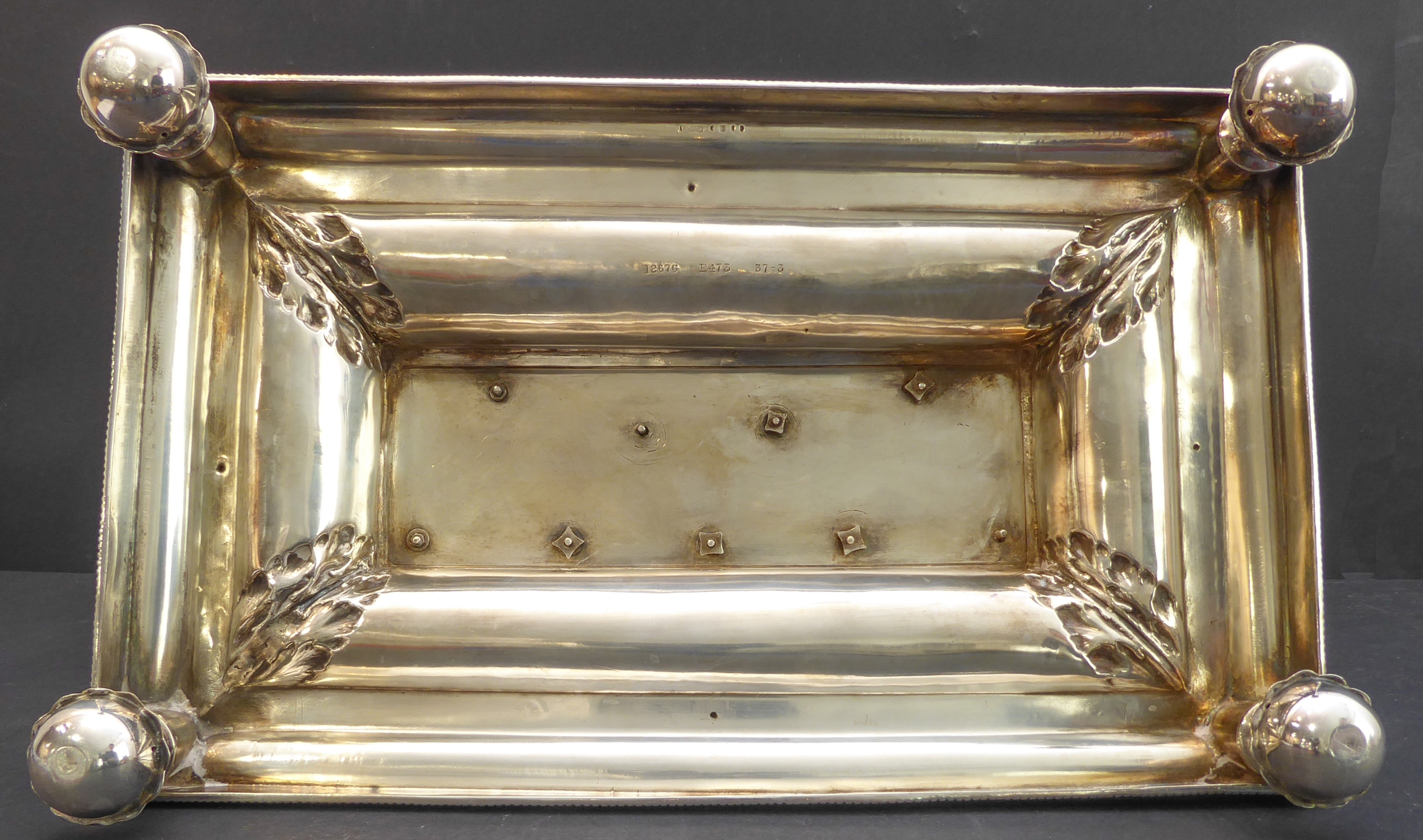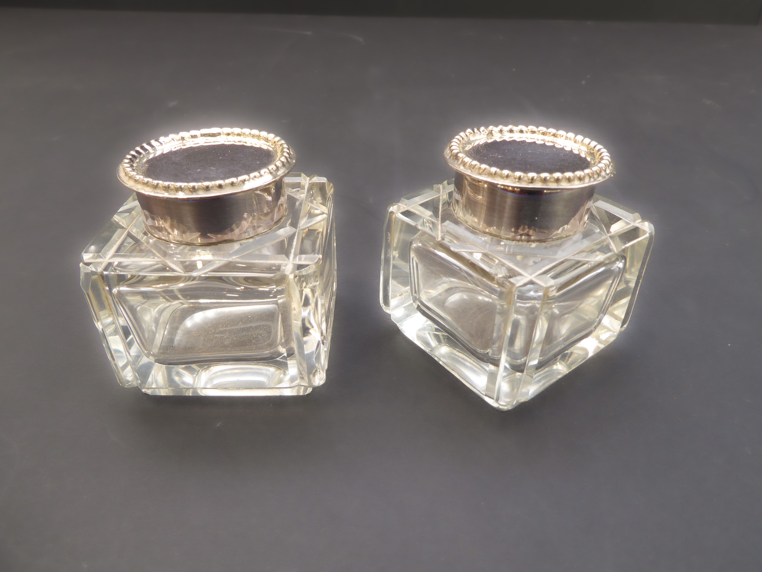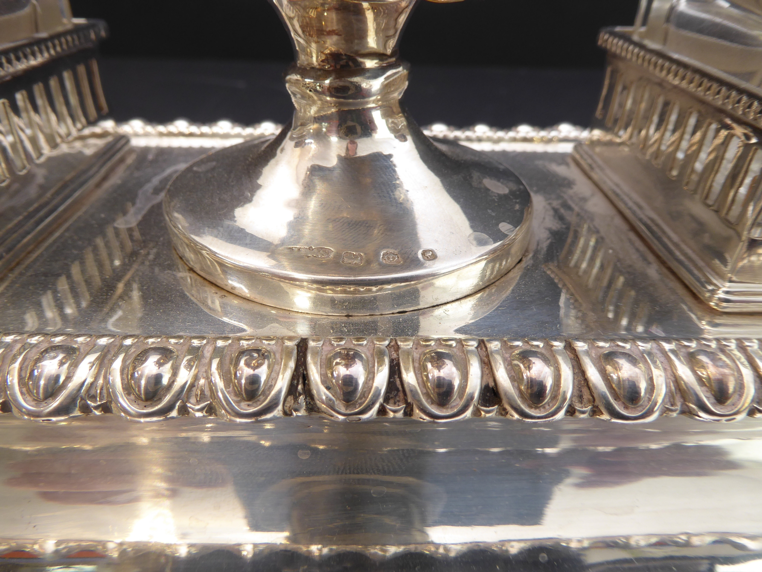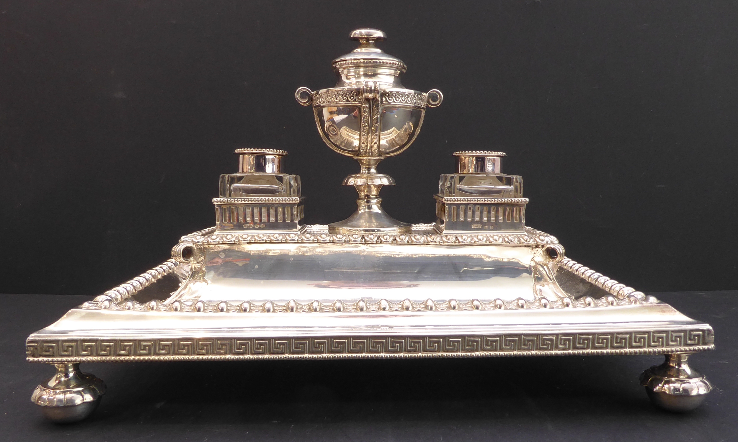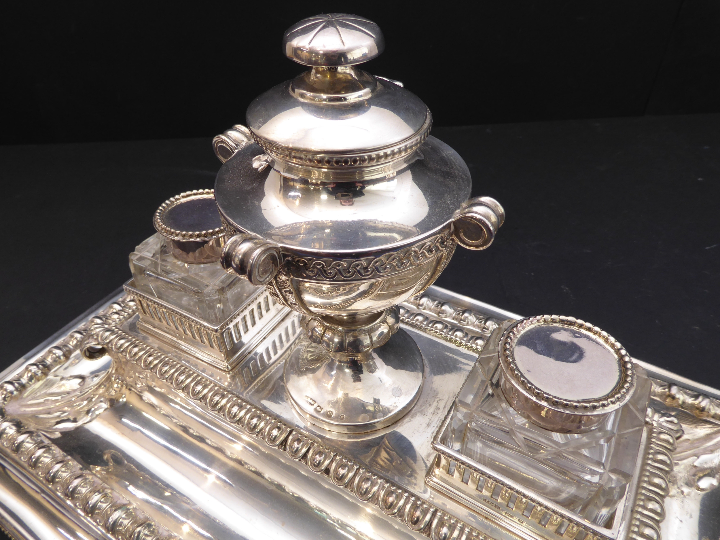 Good general condition with surface scratches and assay marks rubbed. No inscriptions, minor chips to glass inkwells on bases and 3 mm chip to top of one inkwell. No liner to central urn.