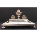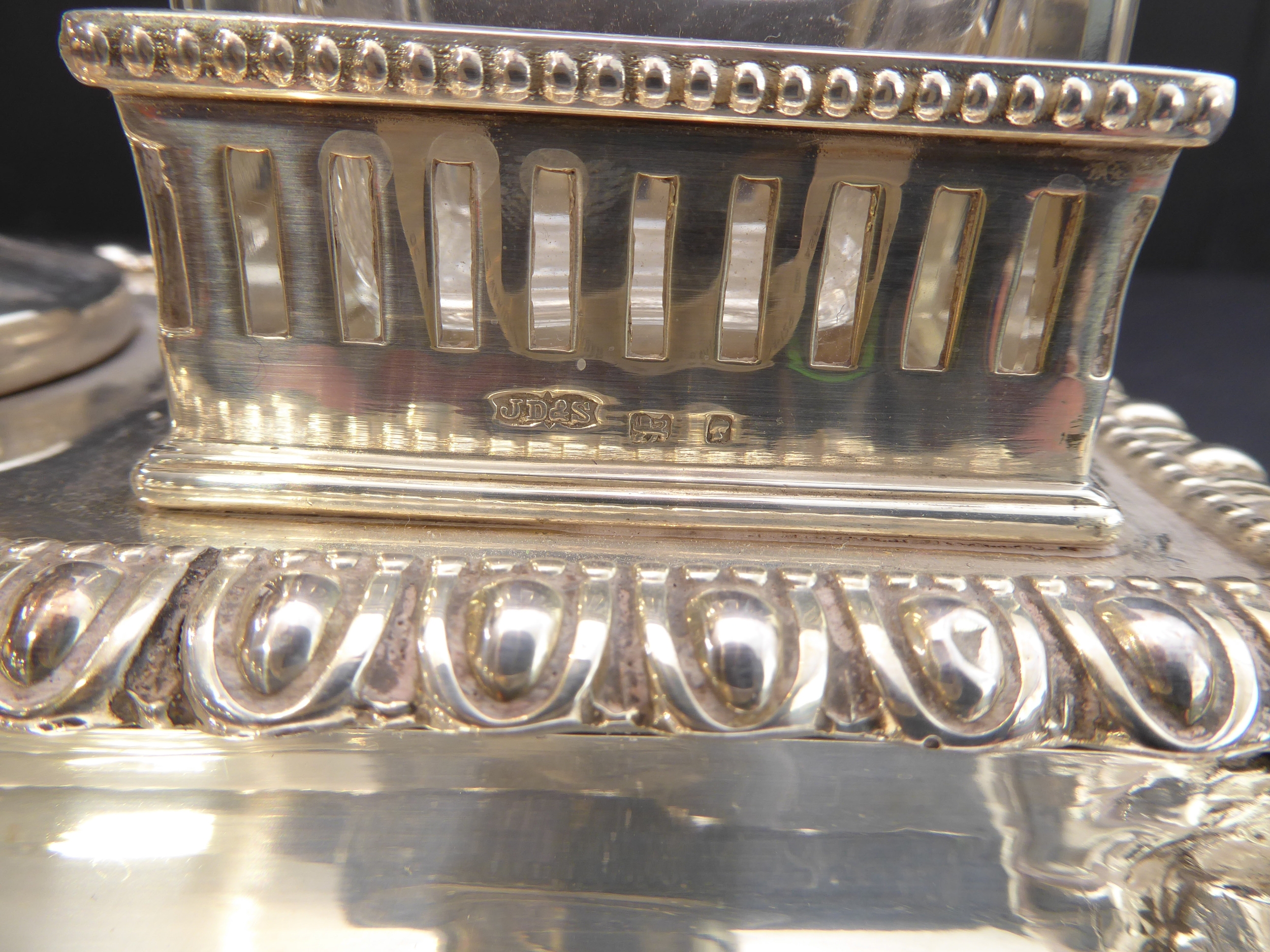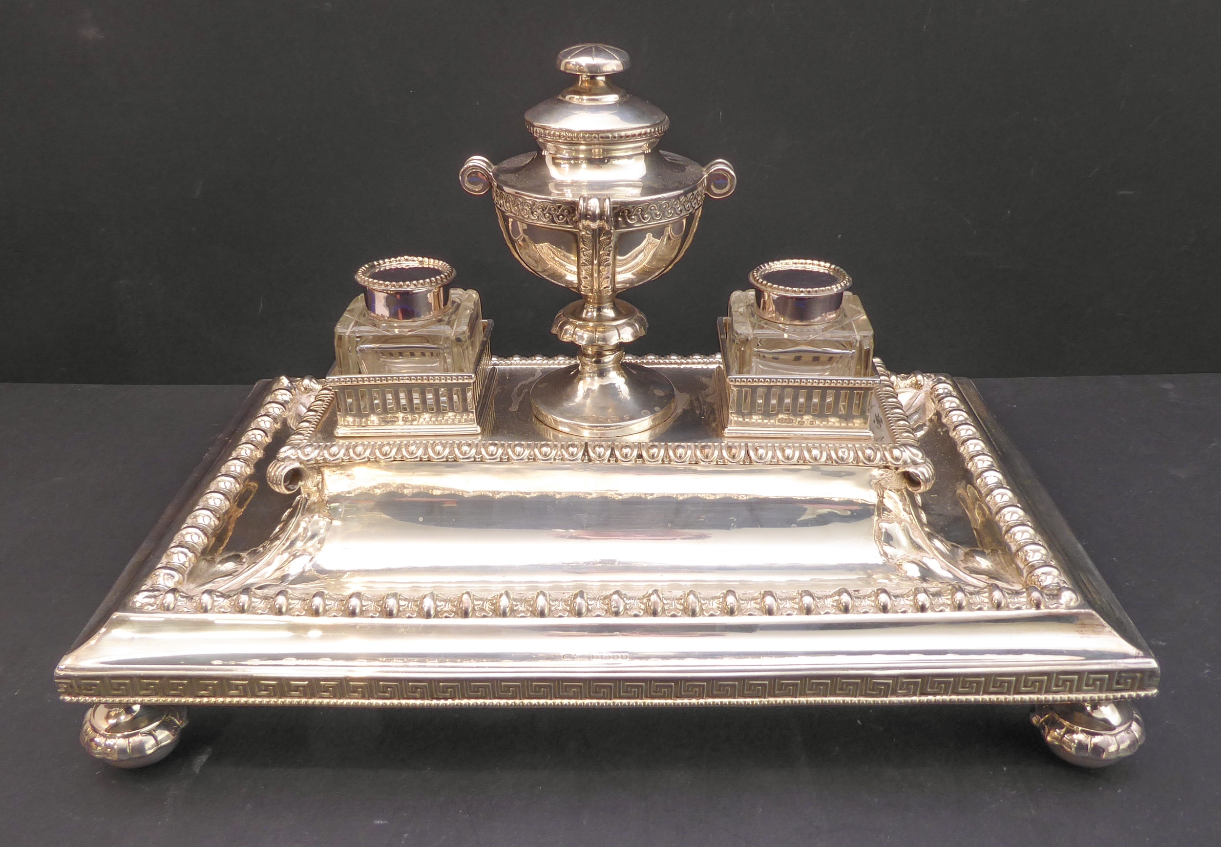 A very fine hallmarked-silver desk stand: having a central urn with circular hinged lid, flanked by two cut-glass inkwells with hinged silver-plated mounted covers, the three items raised on a higher raised plinth with egg & dark style moulding, down sweeping to pen trays below and the plinth style base with Greek key fret style border raised on four bun-style feet with lappet style capped tops, maker's mark JD&S, assayed Sheffield possibly 1880 (mark's rubbed) (32.5cm wide including bun feet x 19.5cm deep (also including bun feet) x approx. 20cm high to tip of urn, total weight of stand (not including cut-glass inkwell approx. 1071g)