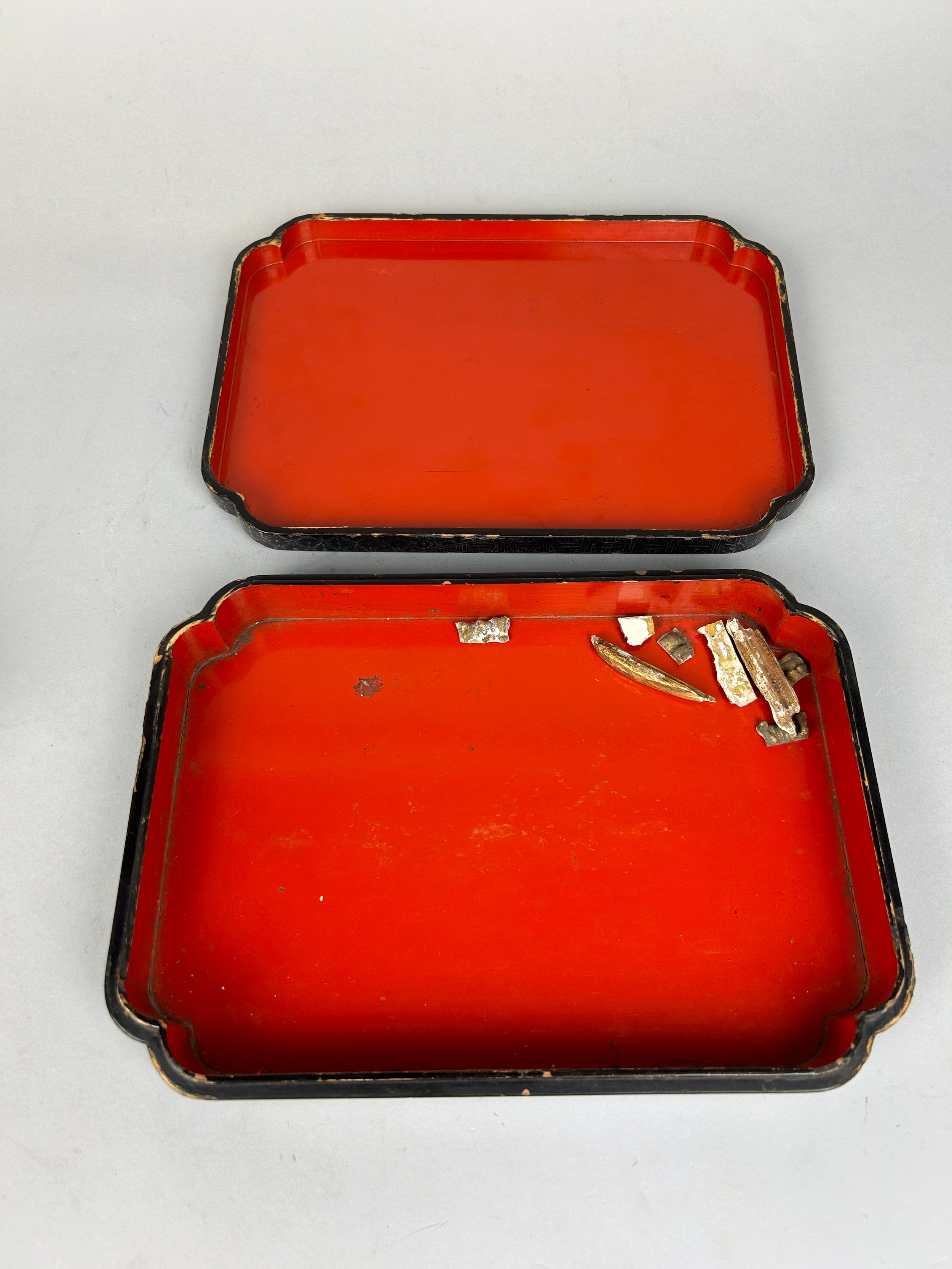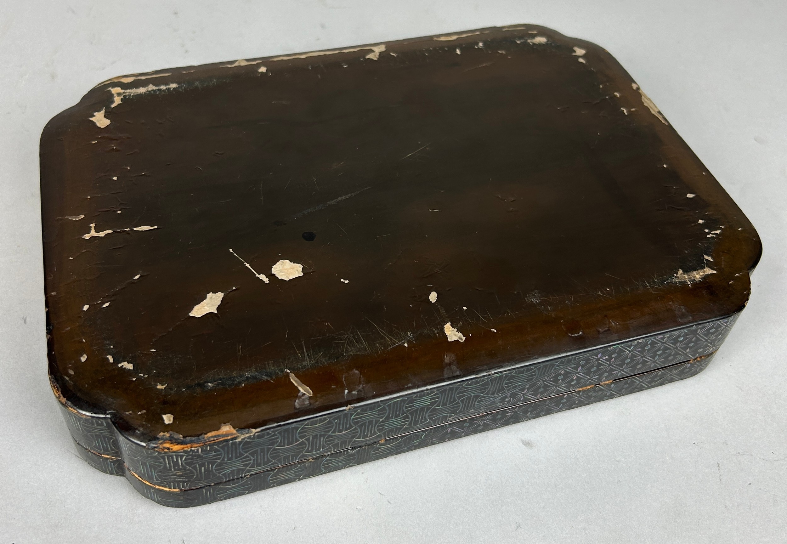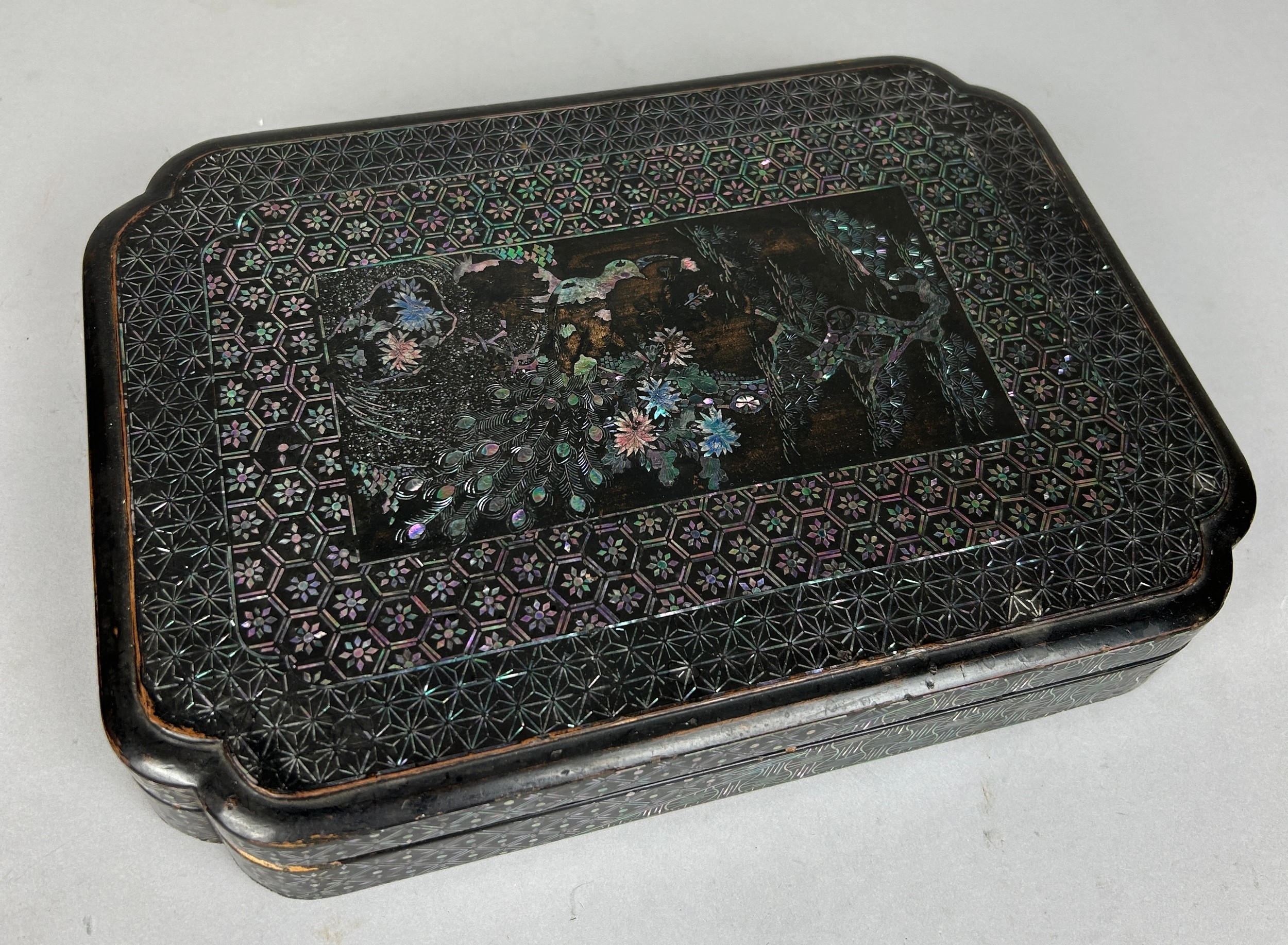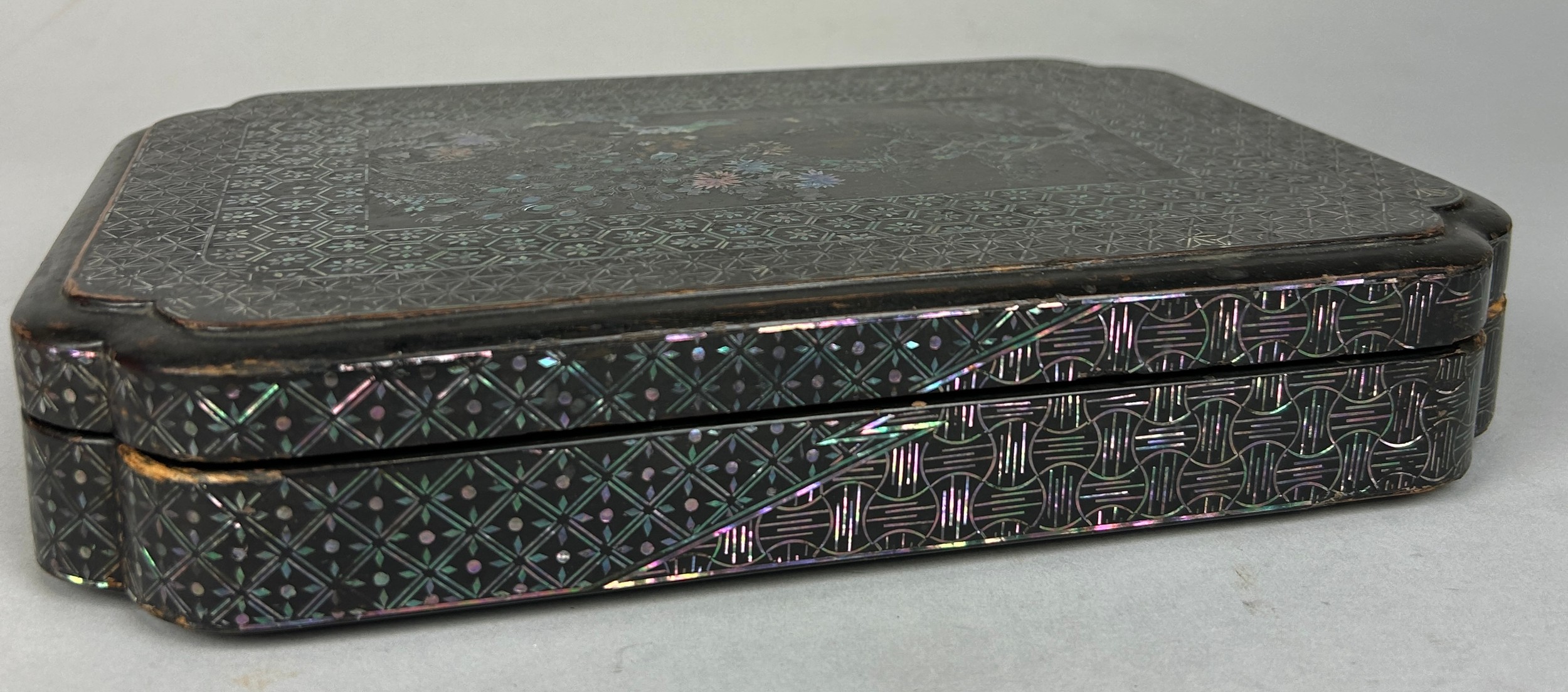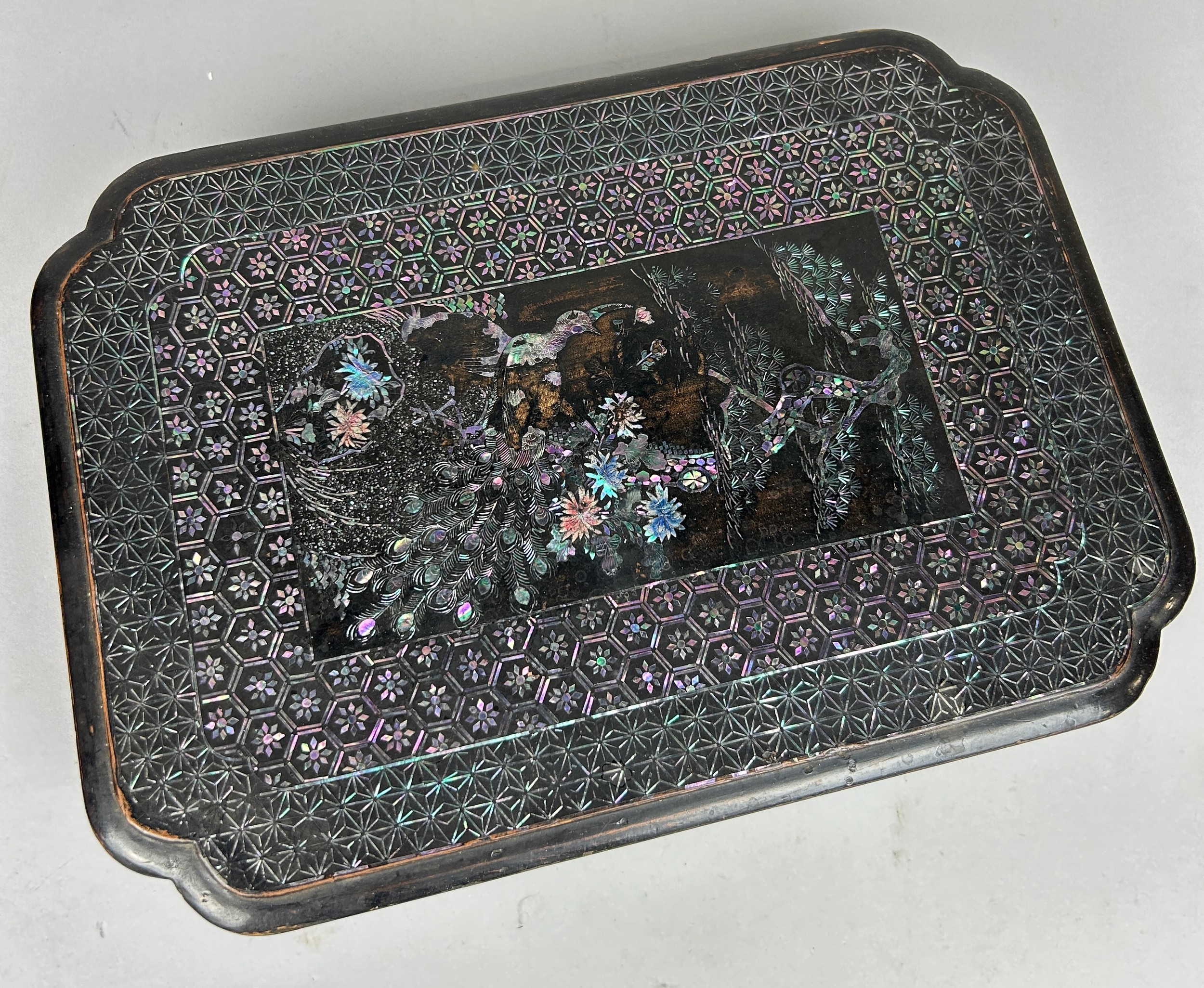 A CHINESE MOTHER OF PEARL AND LACQUERED BOX, 27cm x 18cm x 5cm