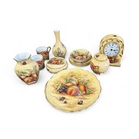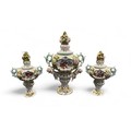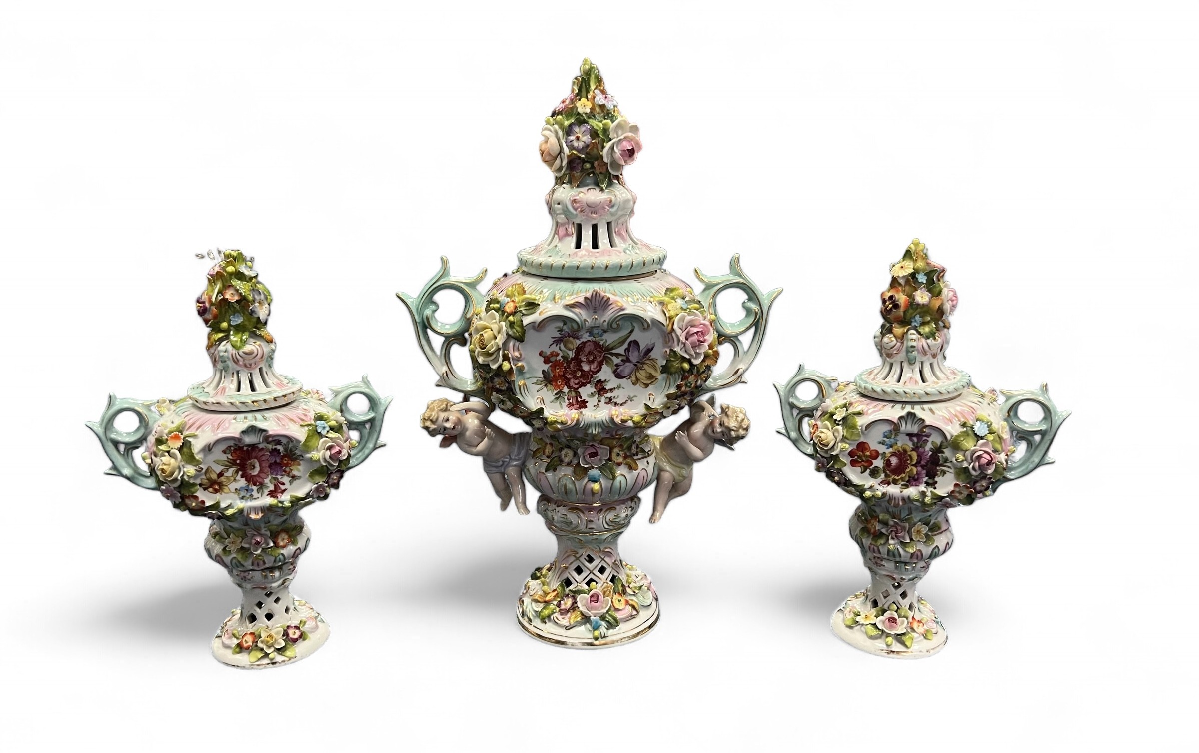 A trio of vases with Sitzendorf marks to base decorated in relief with floral designs and cherubs. Heights 34cm and two smaller 25cm each. Qty 3