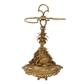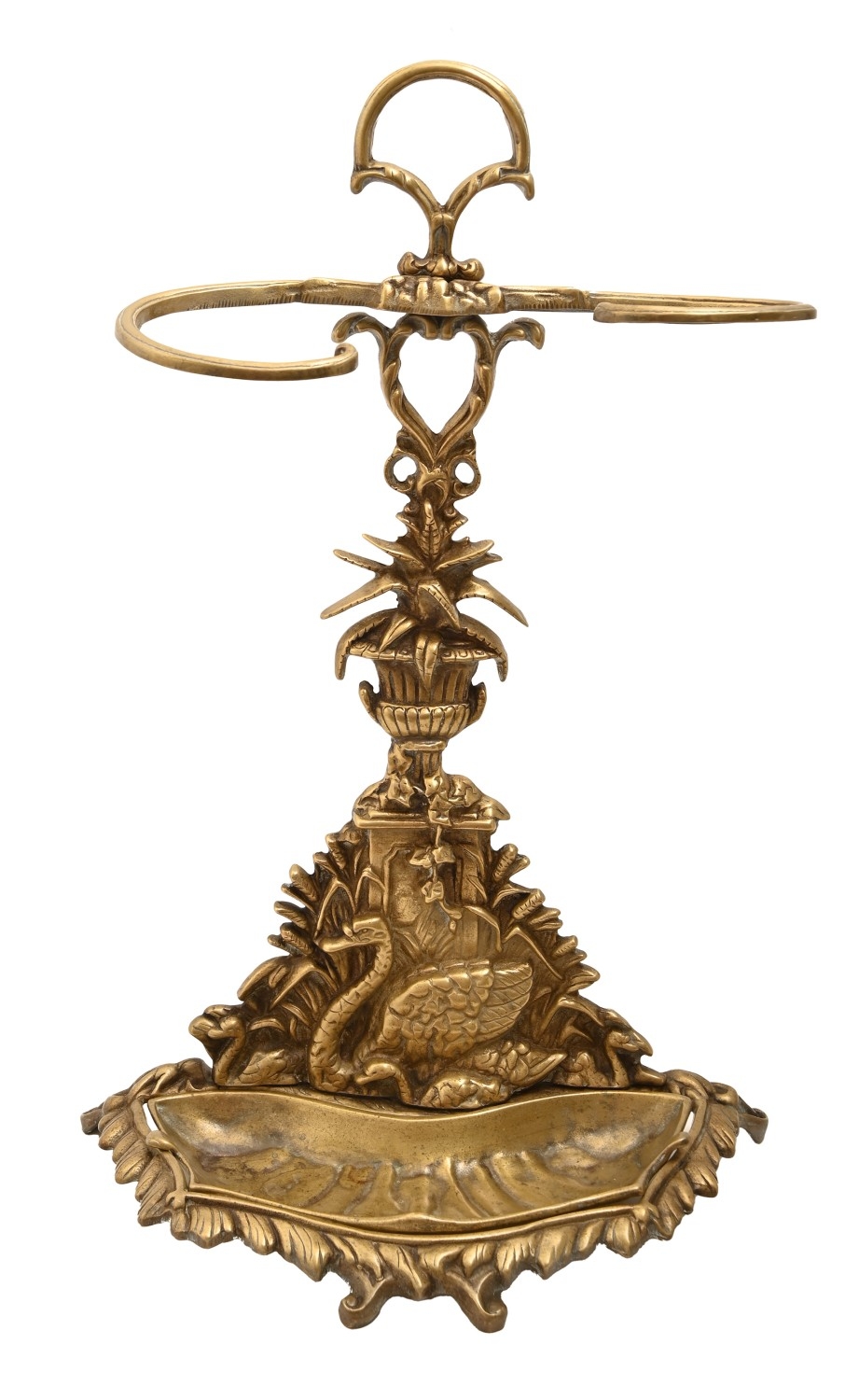 An ornate brass stick stand, early 20th c, with a swan and cygnet, mounted by a vase of flowers, 64cm h