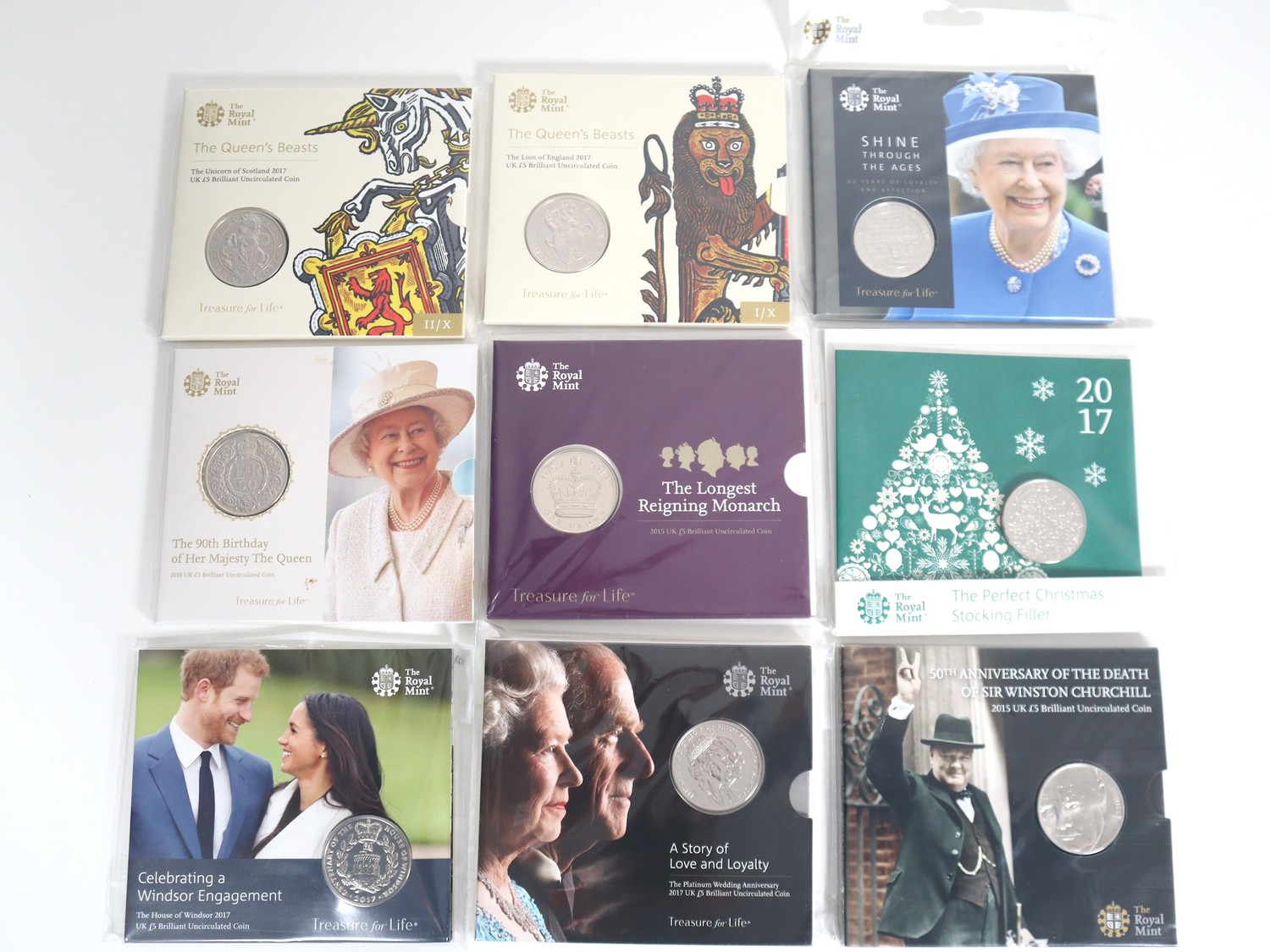 Nine various brilliant uncirculated Cupro-Nickel Commemorative £5 UK Coins