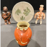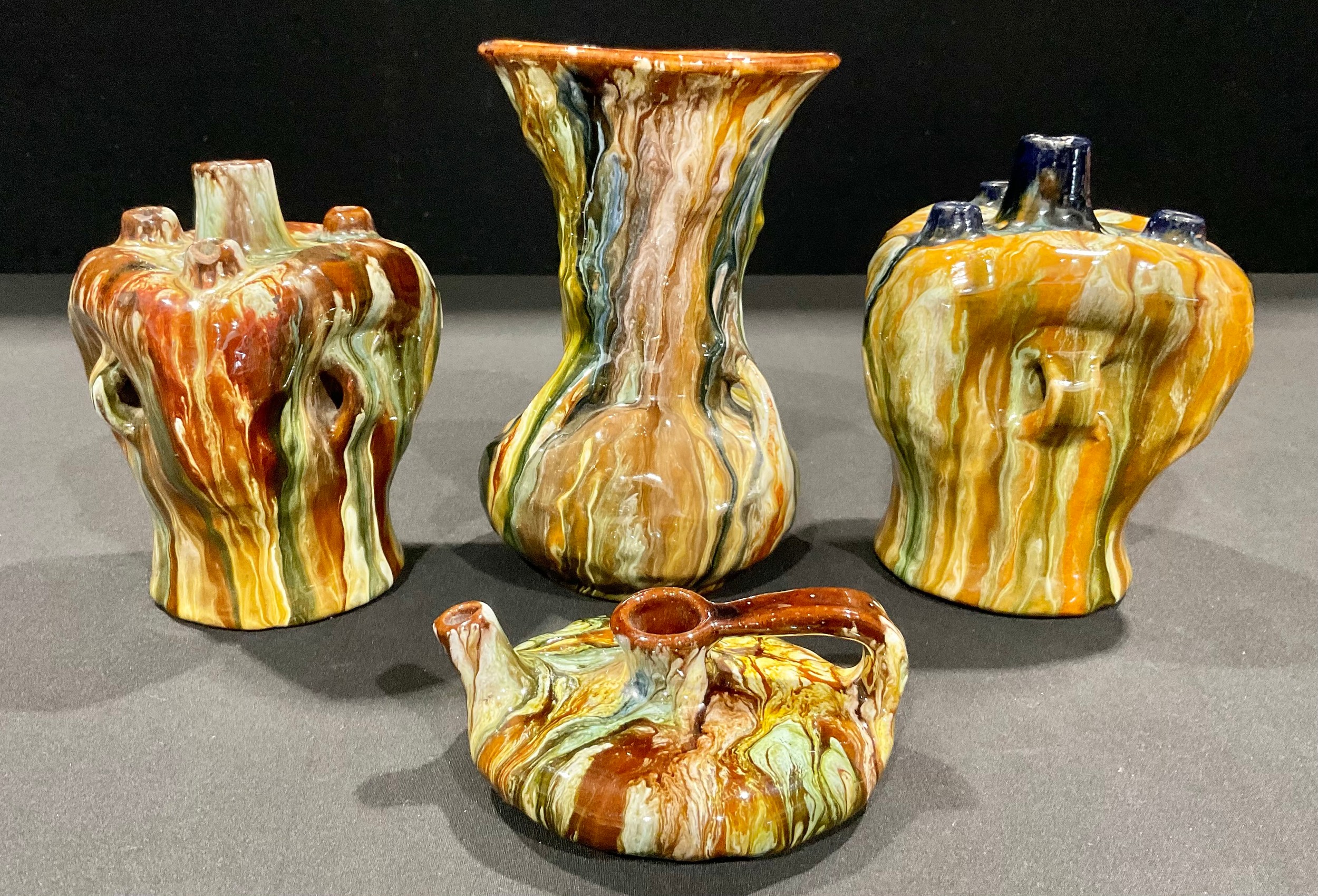 A Bretby Pottery triform bulb vase, after a design by Christopher Dresser (1834 - 1904) three lug handles, crudely and thickly drip glazed in majolica shades of ochre, green, yellow and cobalt blue, 13.5cm, impressed marks, number 1680, c.1900; another similar bulb vase, 12.5cm, c.1900; a Roman Candle, 11cm wide, impressed sunburst mark, number 1690, c.1908; a similar three handled vase, 17cm, impressed sunburst mark, number 1716, c.1900 (4)