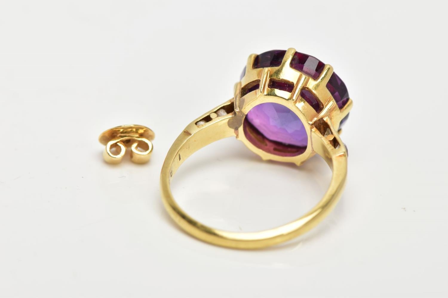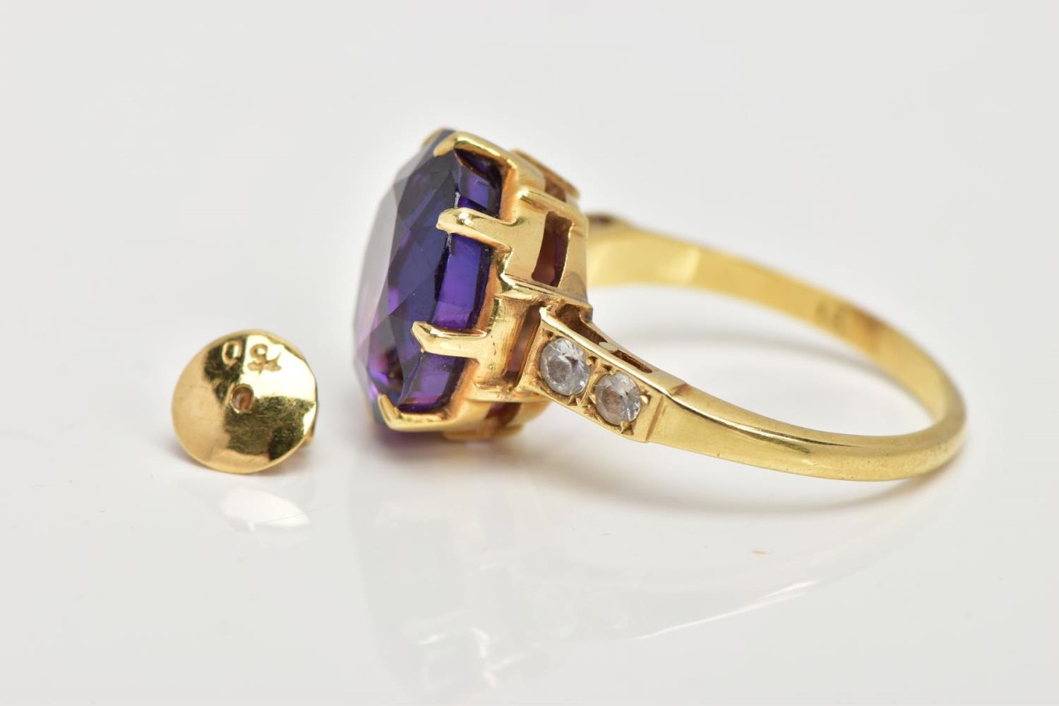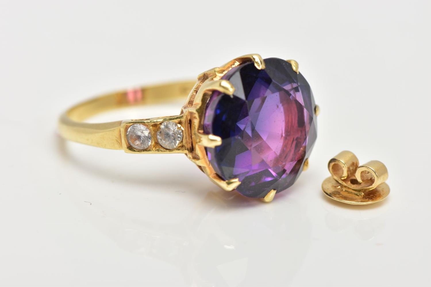 A SYNTHETIC COLOUR CHANGE SAPPHIRE RING, yellow metal ring set with a circular cut colour change synthetic sapphire in an eight claw setting, approximate stone diameter 12mm, also set with four accent circular cut spinel's, stamped 18ct, ring size M 1/2, also including a singular scroll earring, back stamped 750, approximate gross weight 5.8 grams, (condition report: general light wear, overall condition good)