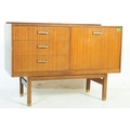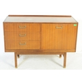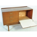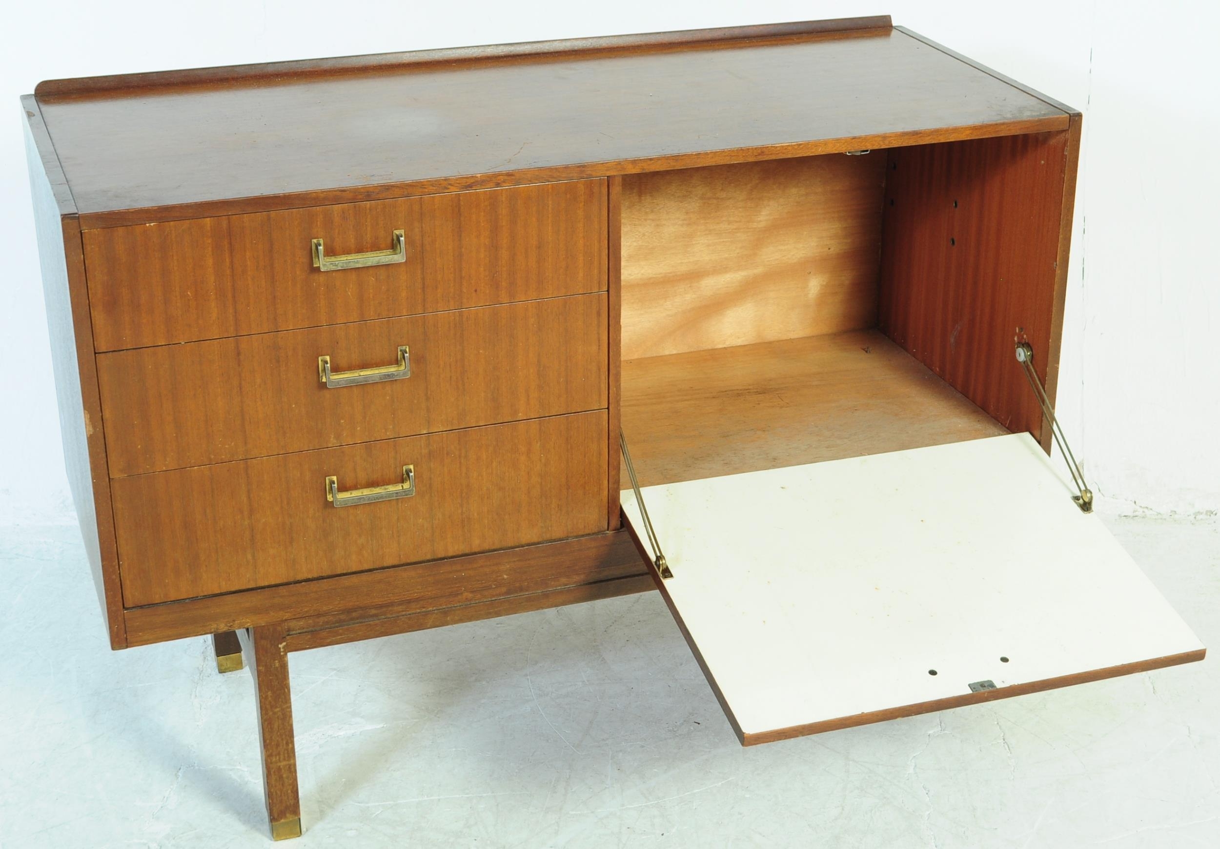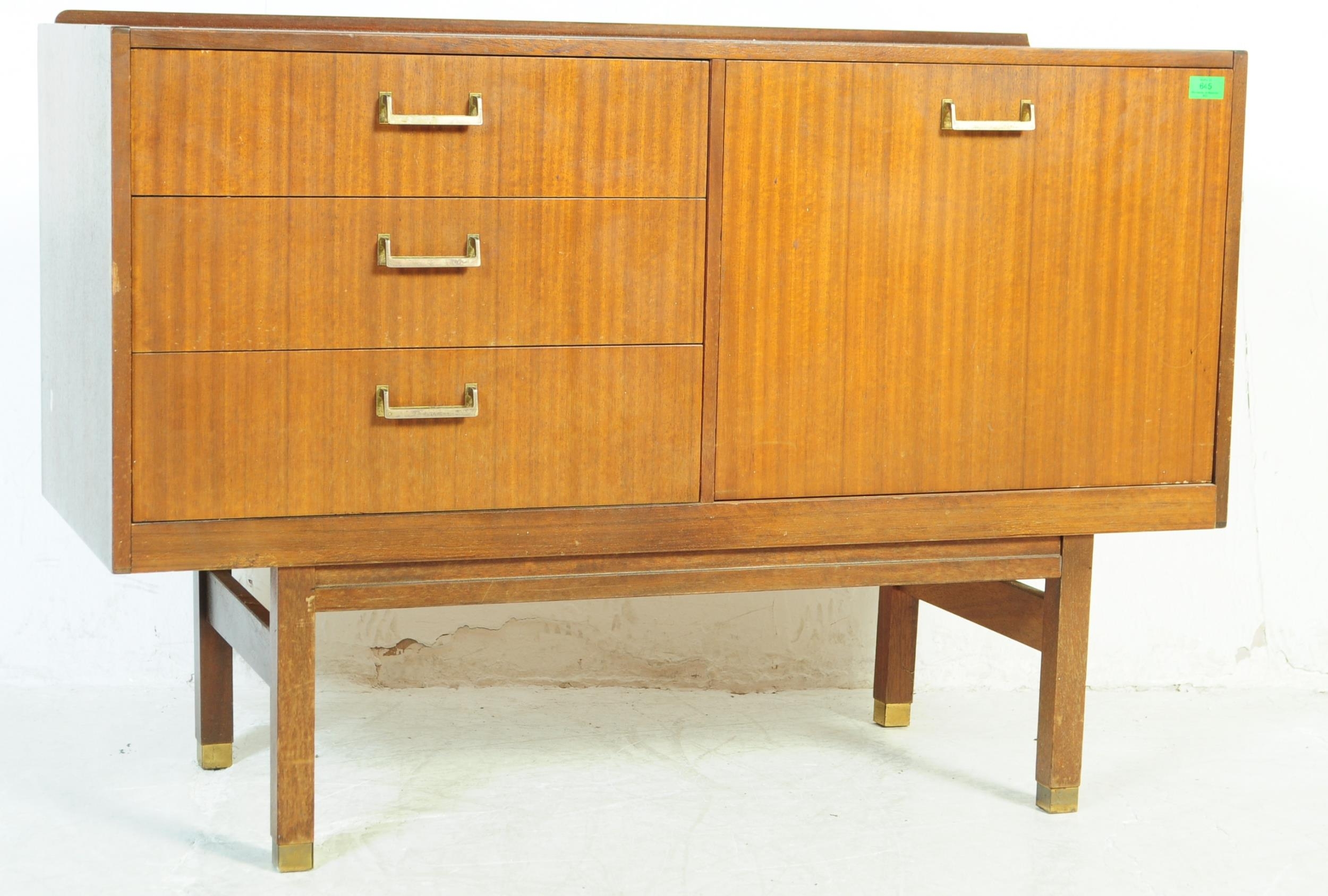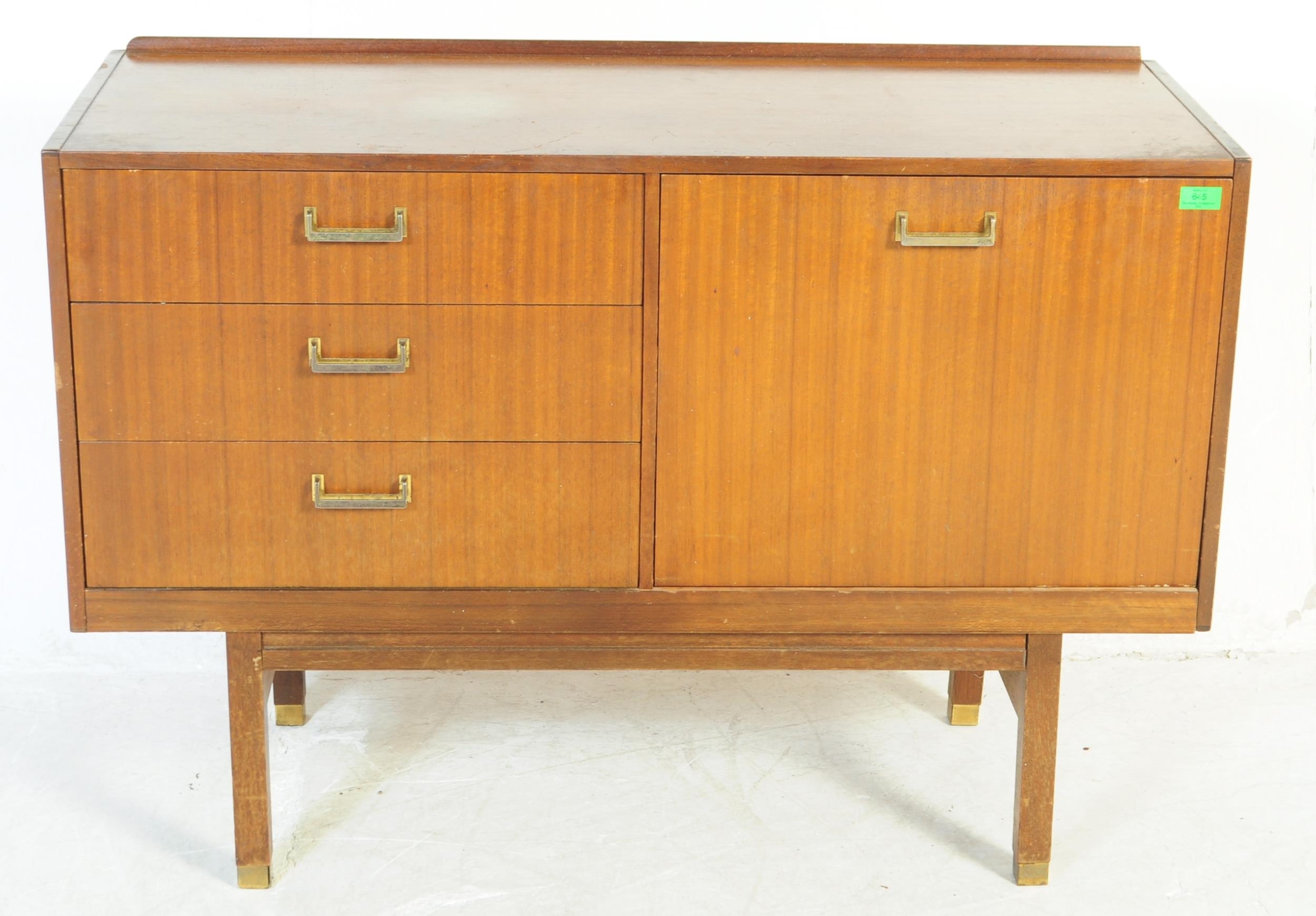 A retro mid 20th Century British design teak wood sideboard credenza having a bank of three drawers to the left with each having brass handles. Flanked to the right by a twin door cupboard with all raised on square shaped supports. Measures approx;77x112x46cm