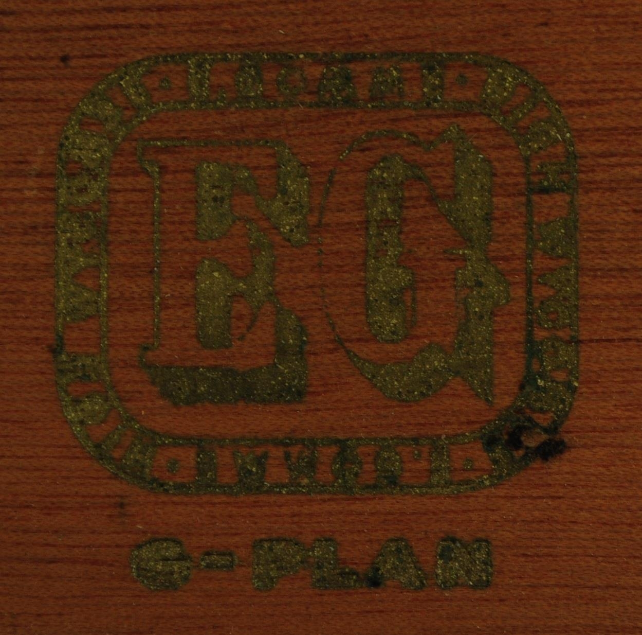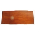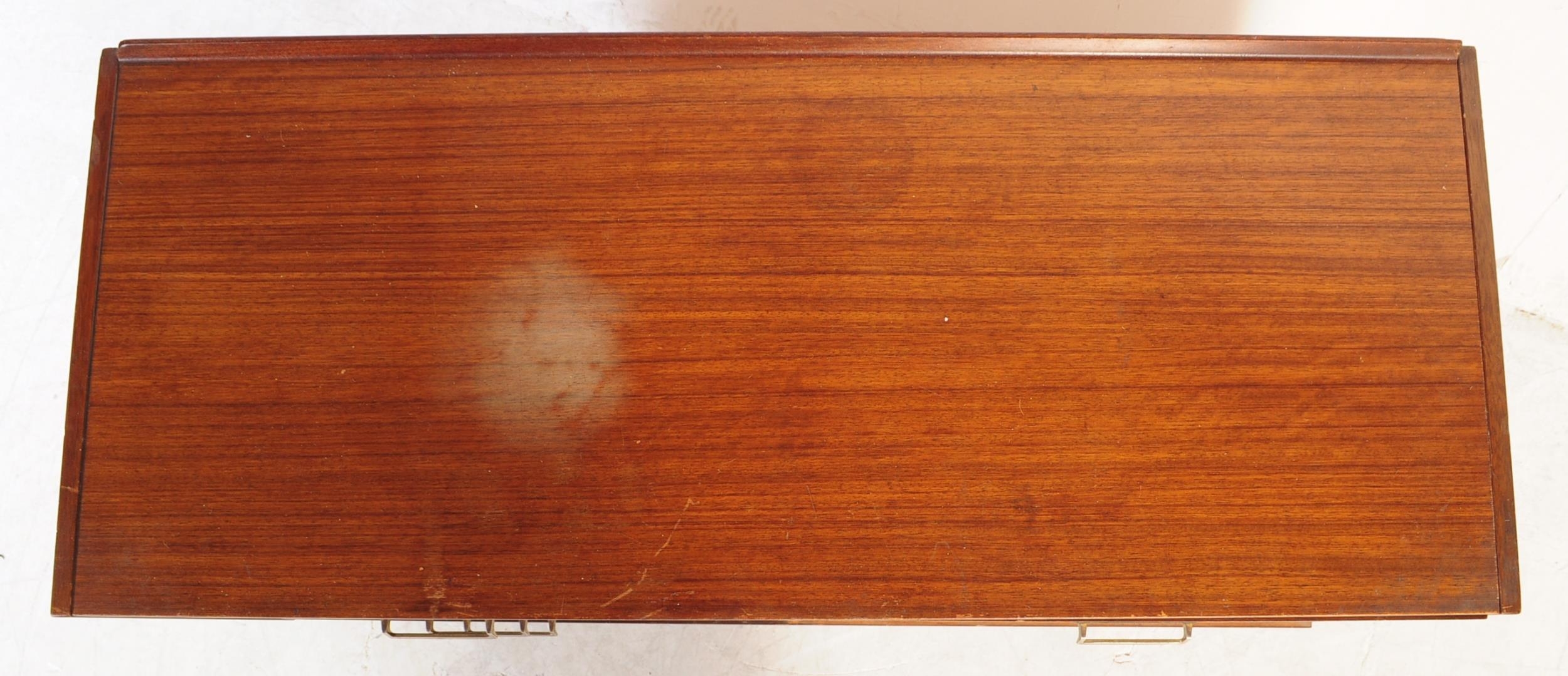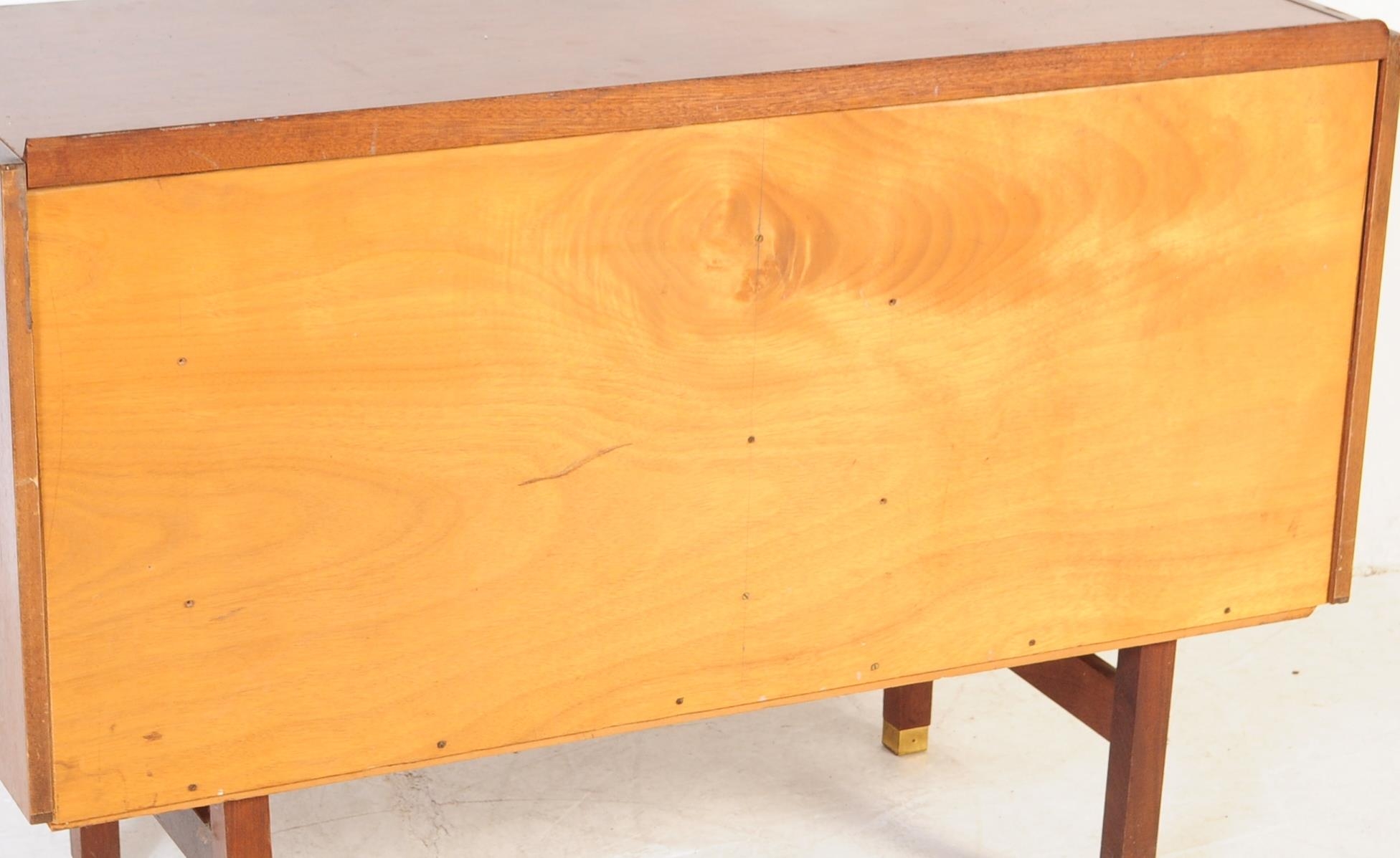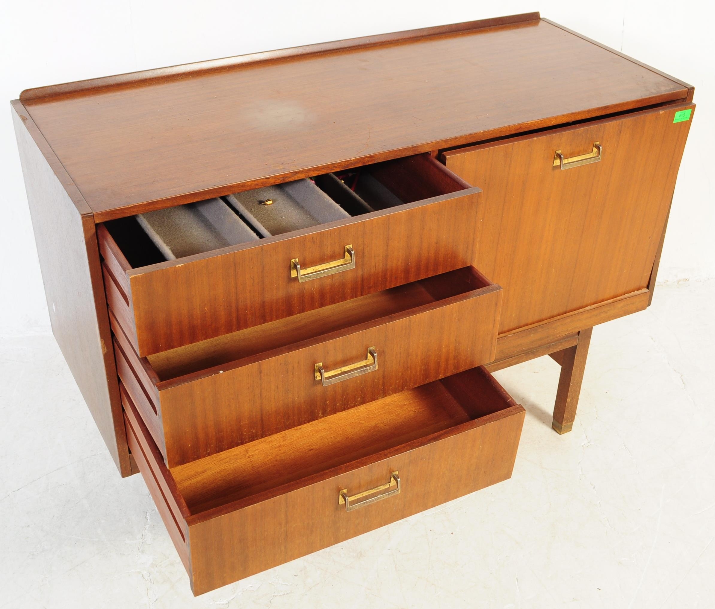 A retro mid 20th Century British design teak wood sideboard credenza having a bank of three drawers to the left with each having brass handles. Flanked to the right by a twin door cupboard with all raised on square shaped supports. Measures approx;77x112x46cm