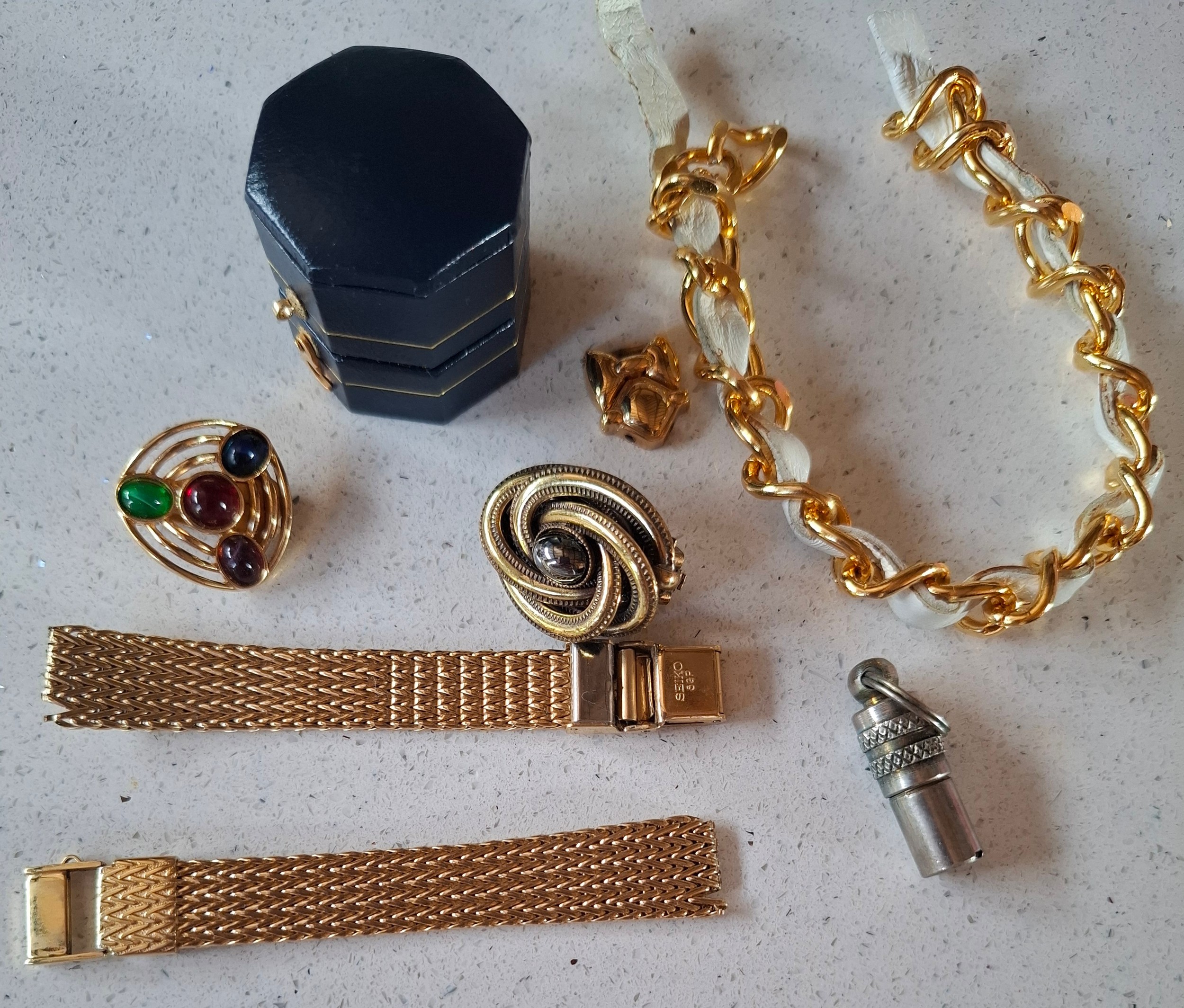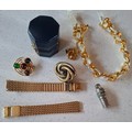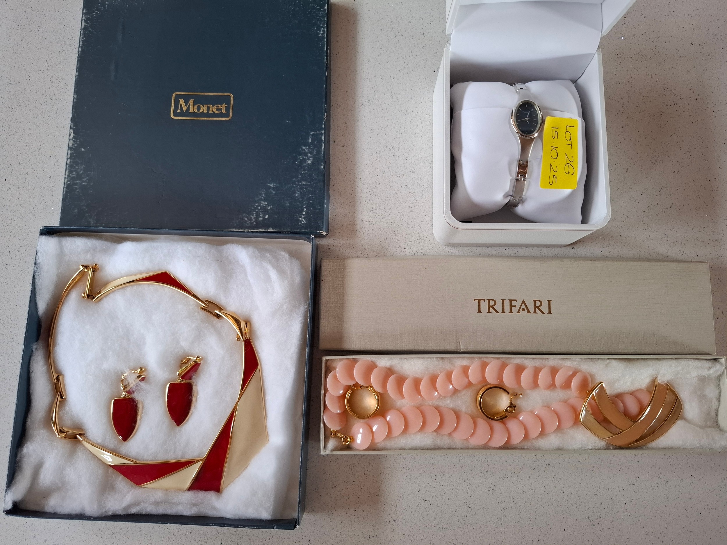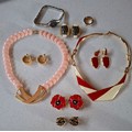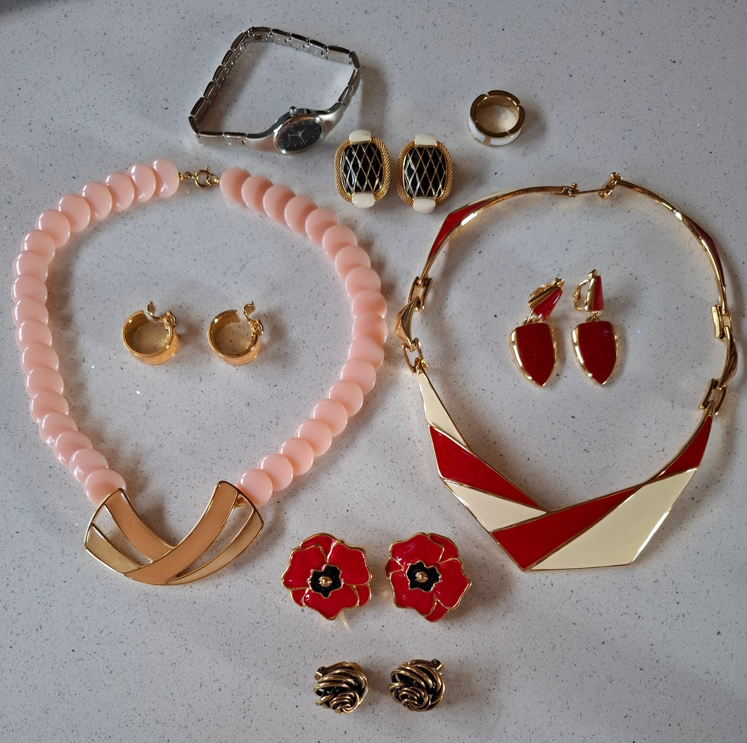 Balenciaga and Escada -A quantity of late 20th Century costume jewellery to include a pair of Balenciaga gold tone and enamel clip-on earrings, a pair of Escada red enamel poppy clip-on earrings, a Bering gold tone ring, Bulatti earrings, a Trifari gold tone and pink bead jewellery suite with branded box and a Monet gold tone, red and cream enamel jewellery suite with branded box together with a gold plated watch strap A/F, a ladies boxed Pulsar watch and miscellaneous items. Location: R2.3