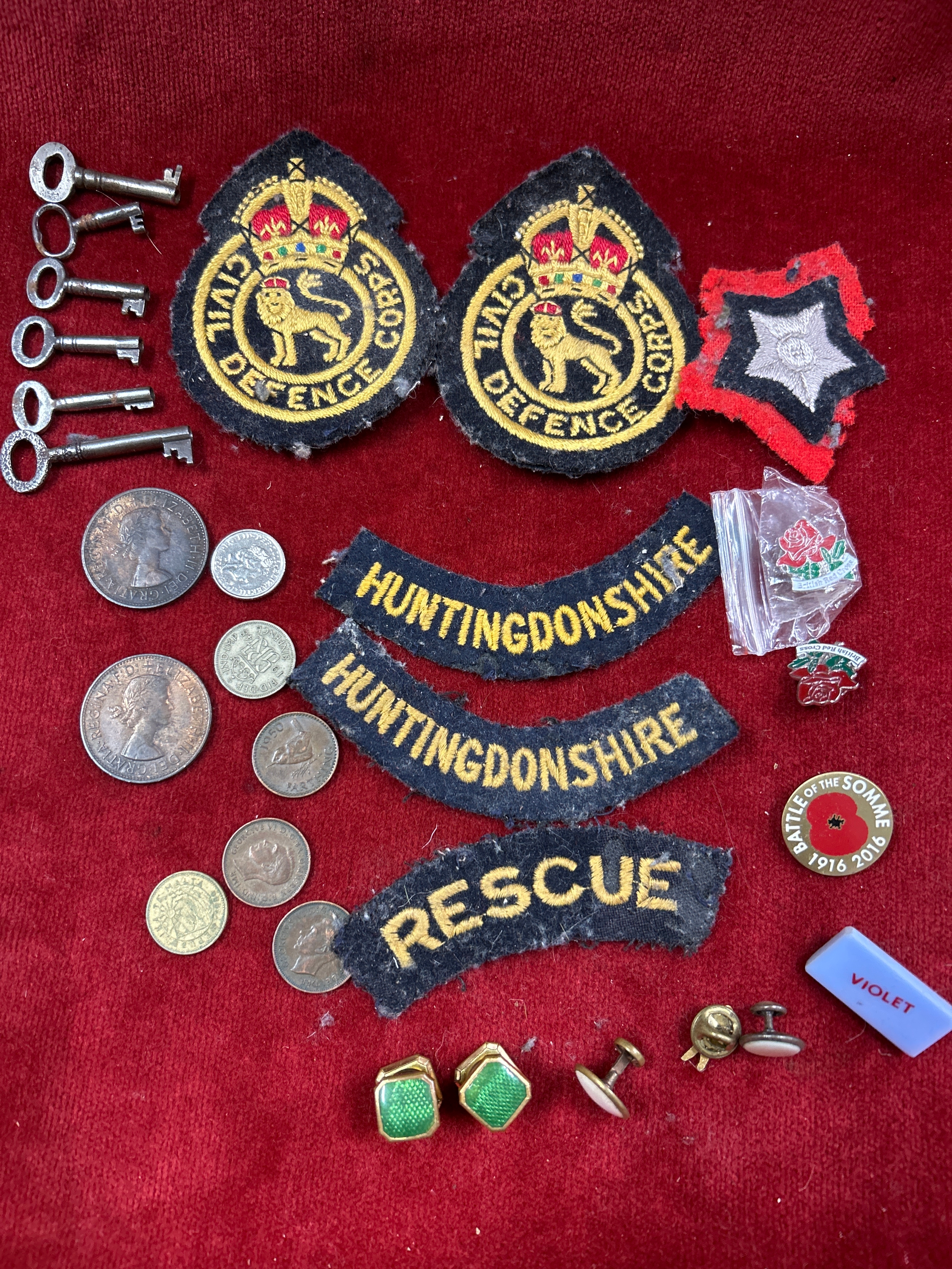 Collector’s lot to include military cloth badges, vintage box or cabinet keys, coins, studs etc