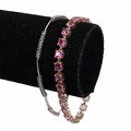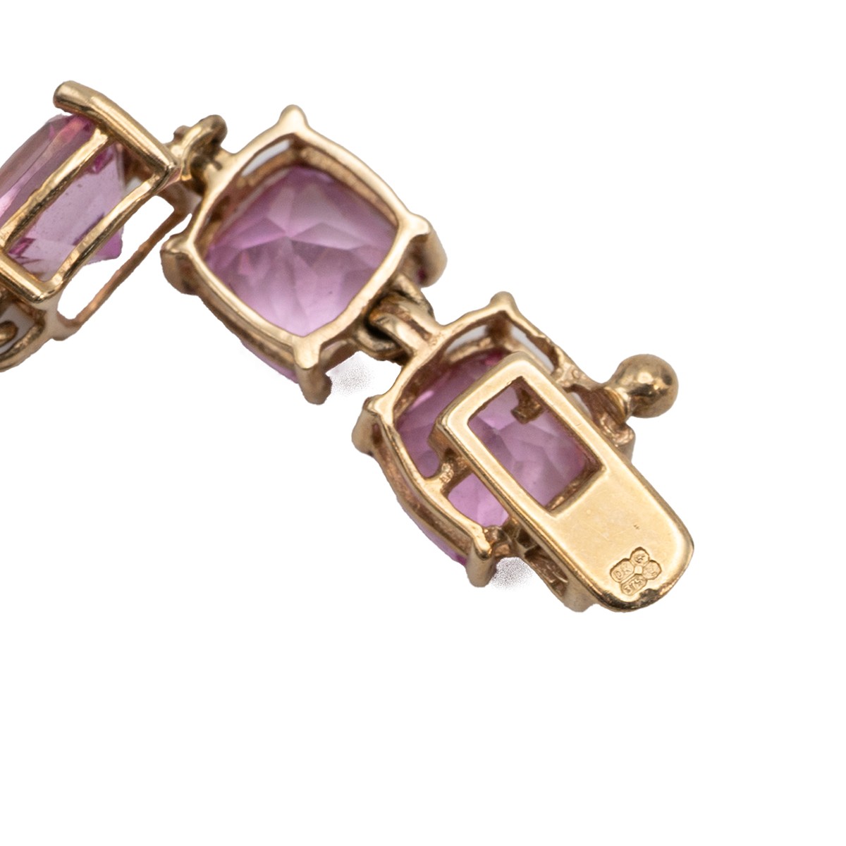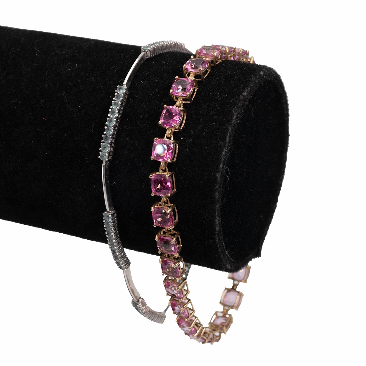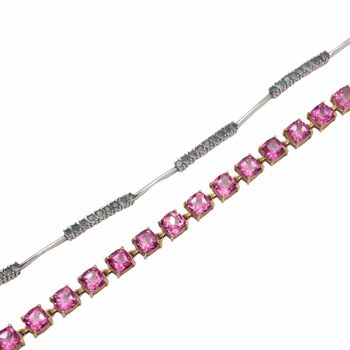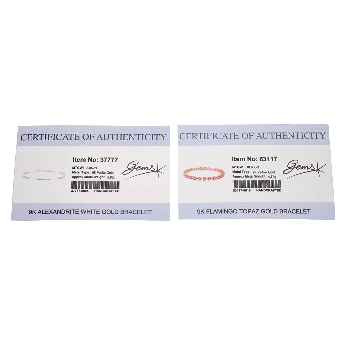 Two 9ct gold gem-set bracelets: a 9ct yellow gold flamingo topaz bracelet, and a 9ct white gold alexandrite bracelet, both with certificates of authenticity, gross weight 14.9 grams. (2)