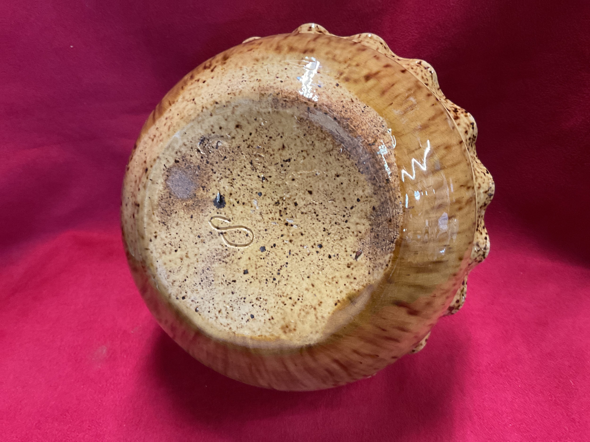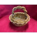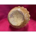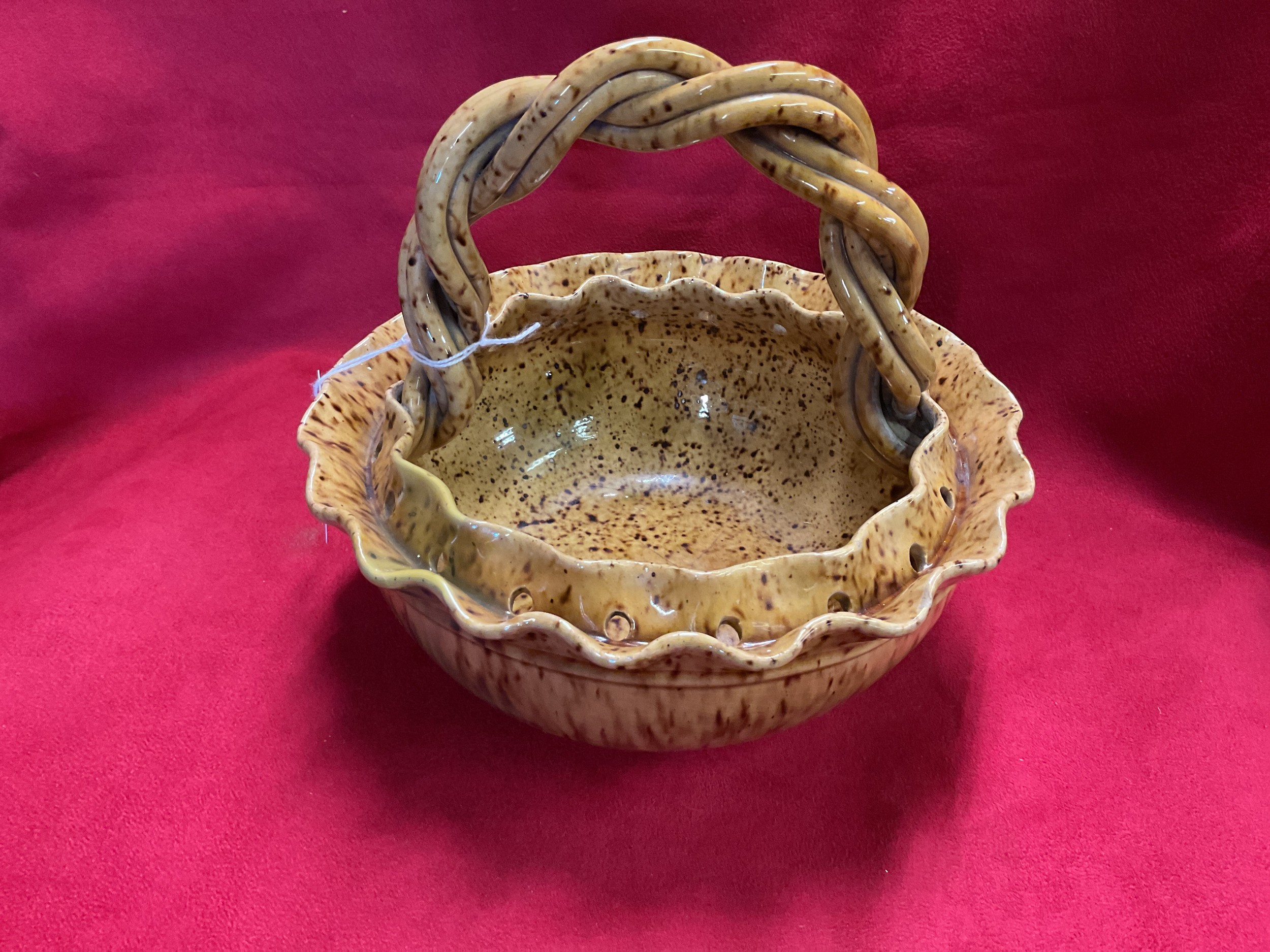 A Rye Pottery mottled brown glazed hanging basket with rope twist handle, impressed mark to base S