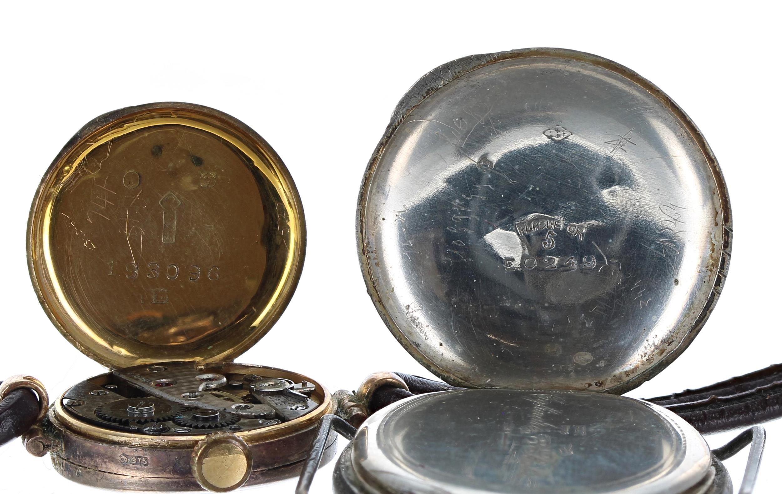 9ct ladies wristwatch for repair, import hallmarks London 1924, silvered dial, hinged case, brown leather strap, 12.8gm, 22mm; together with a white metal fob watch converted to a wire-lug wristwatch, enamel dial, inscribed hinged cuvette, hinged floral engraved case, 30mm (at fault, lacking strap) (2)