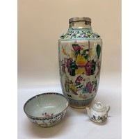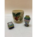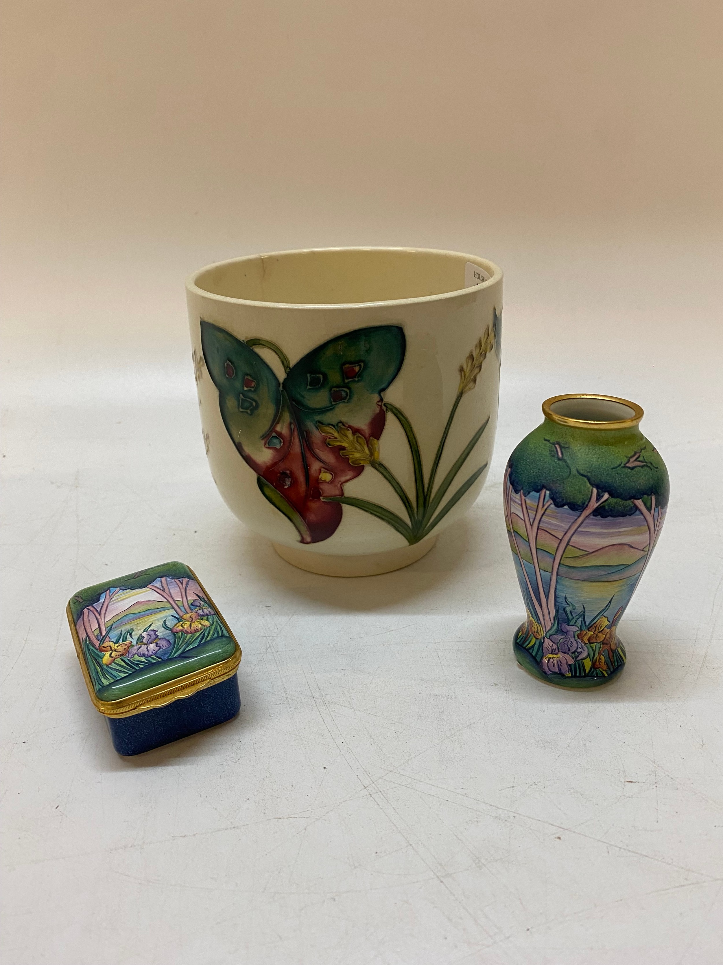 A Moorcroft pot, white ground decorated Arum Lily - 4 1/2in. high, a modern Moorcroft enamel trinket box decorated iris flowers, trees and mountains - 2 1/4in. wide and the matching vase - 3in. high