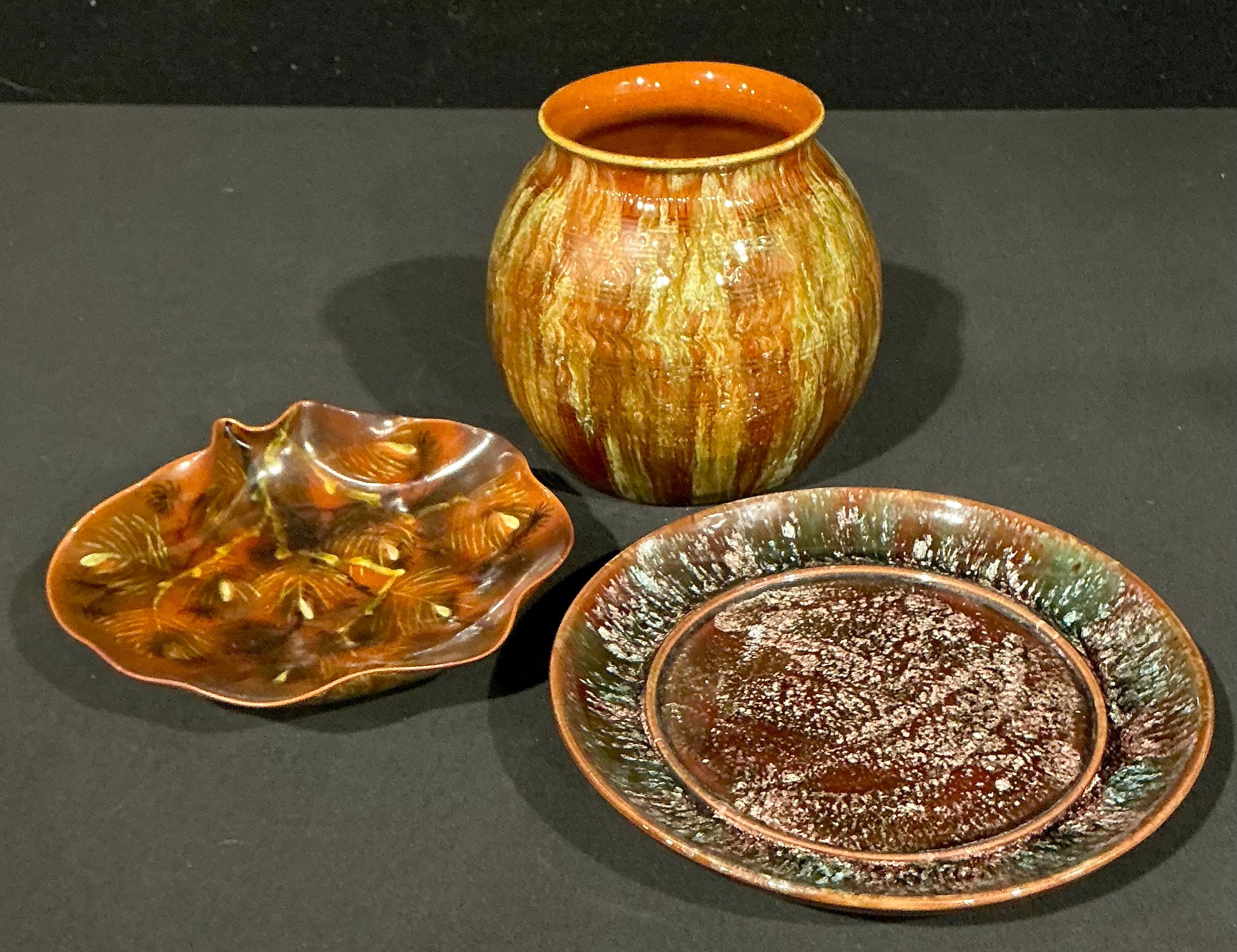 A Linthorpe Pottery ovoid vase, designed by Christopher Dresser (1864 - 1904) incised with bands of roundels and dashes, drip glazed in green and brown, 13.5cm, impressed marks, Dresser signature, Henry Tooth monogram and number 68, c.1880; a Linthorpe Pottery folded dish, painted with fir tree and pine cones, 16.5cm wide, impressed mark, number 2090, c.1880; another Linthorpe circular tray, impressed Dresser signature and Tooth monogram, c.1880 (3)