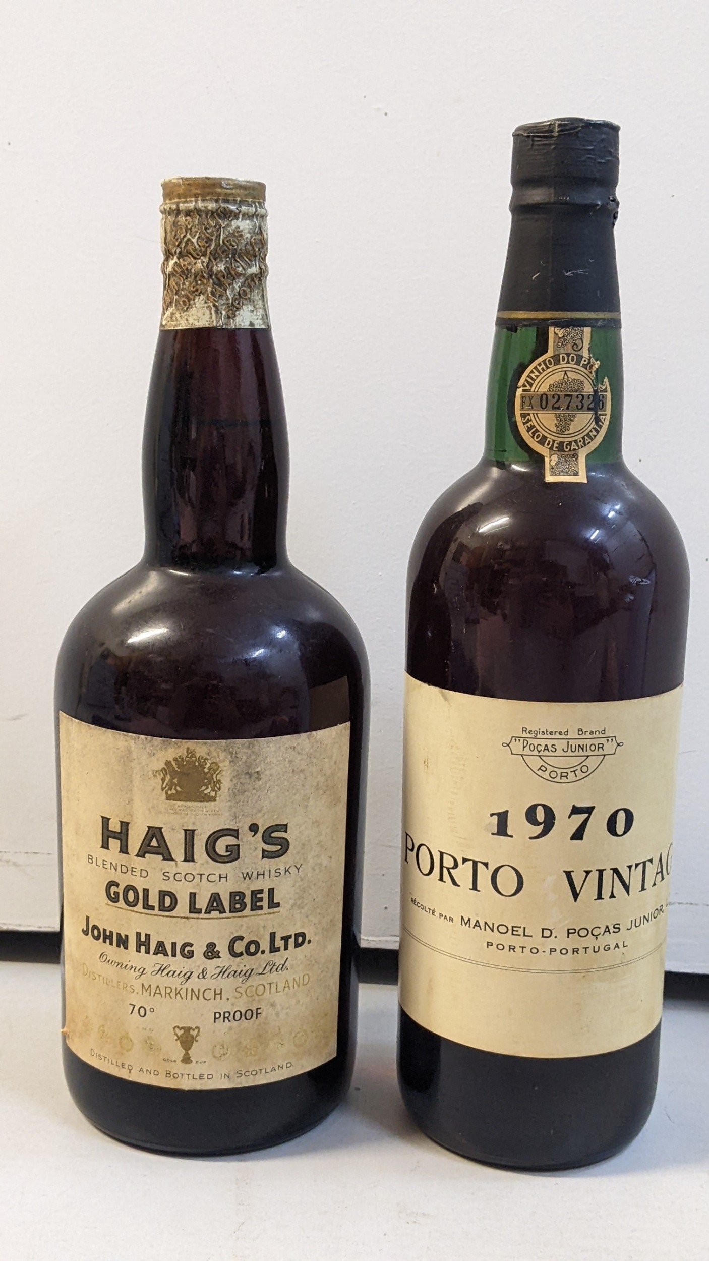A bottle of Haig’s Gold Label Blended Scotch Whisky, by John Haig & Co. Ltd., 70° proof, distilled and bottled in Scotland, together with a bottle of 1970 Porto Vintage, by Manoel D. Poças Júnior, Portugal.