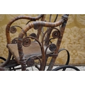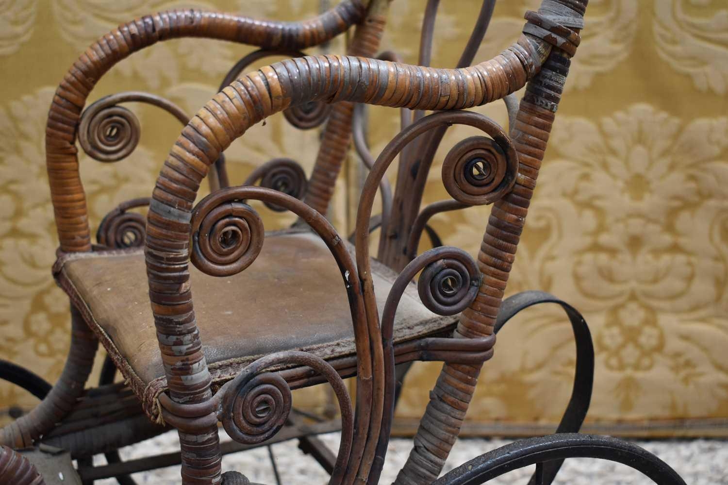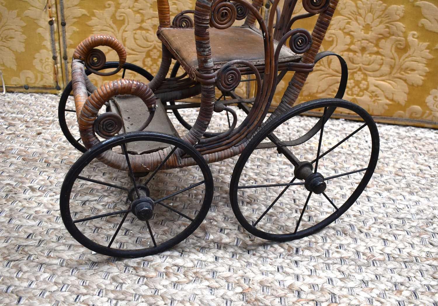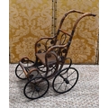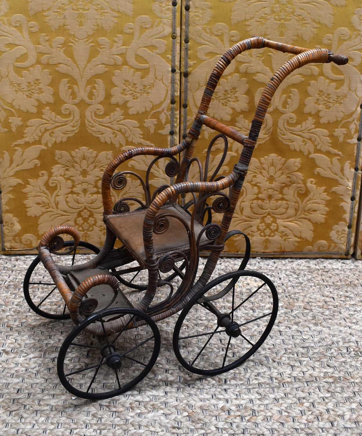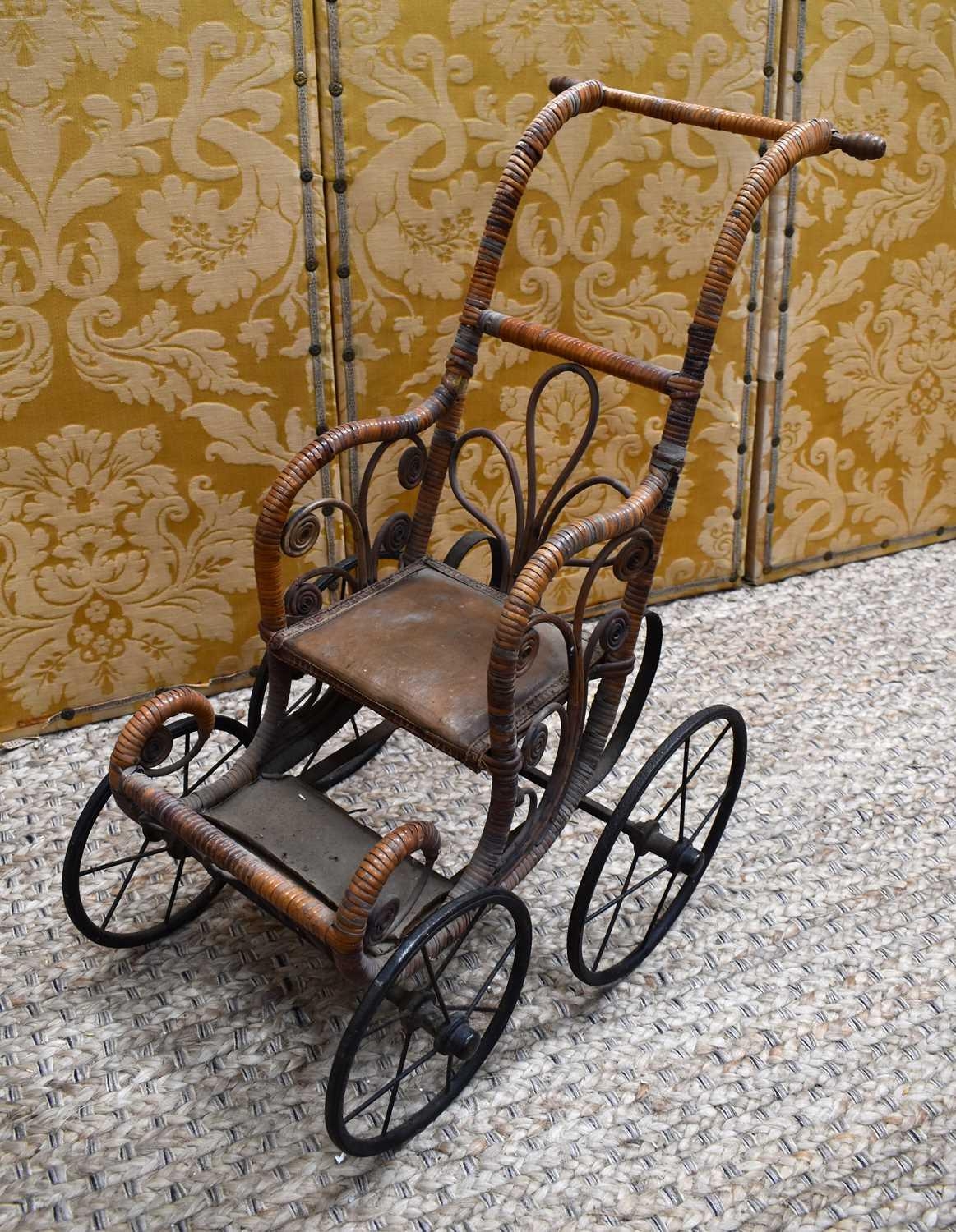 A late Victorian/early Edwardian child's wooden and cane dolls push chair with foot rest, metal undercarriage and wheels, 70cm high.