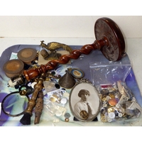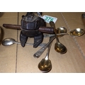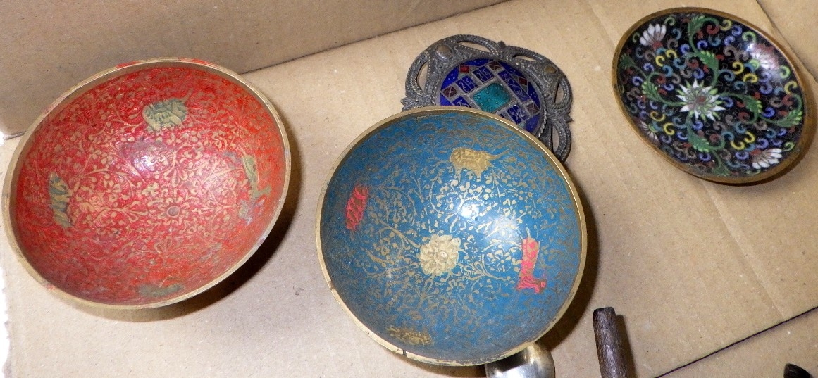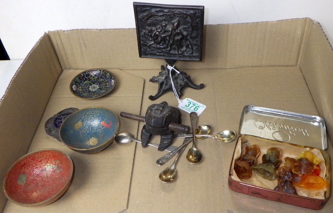 A group of misc collectables to inc cloisonné, carved frog, cast miniature tripod table etc