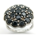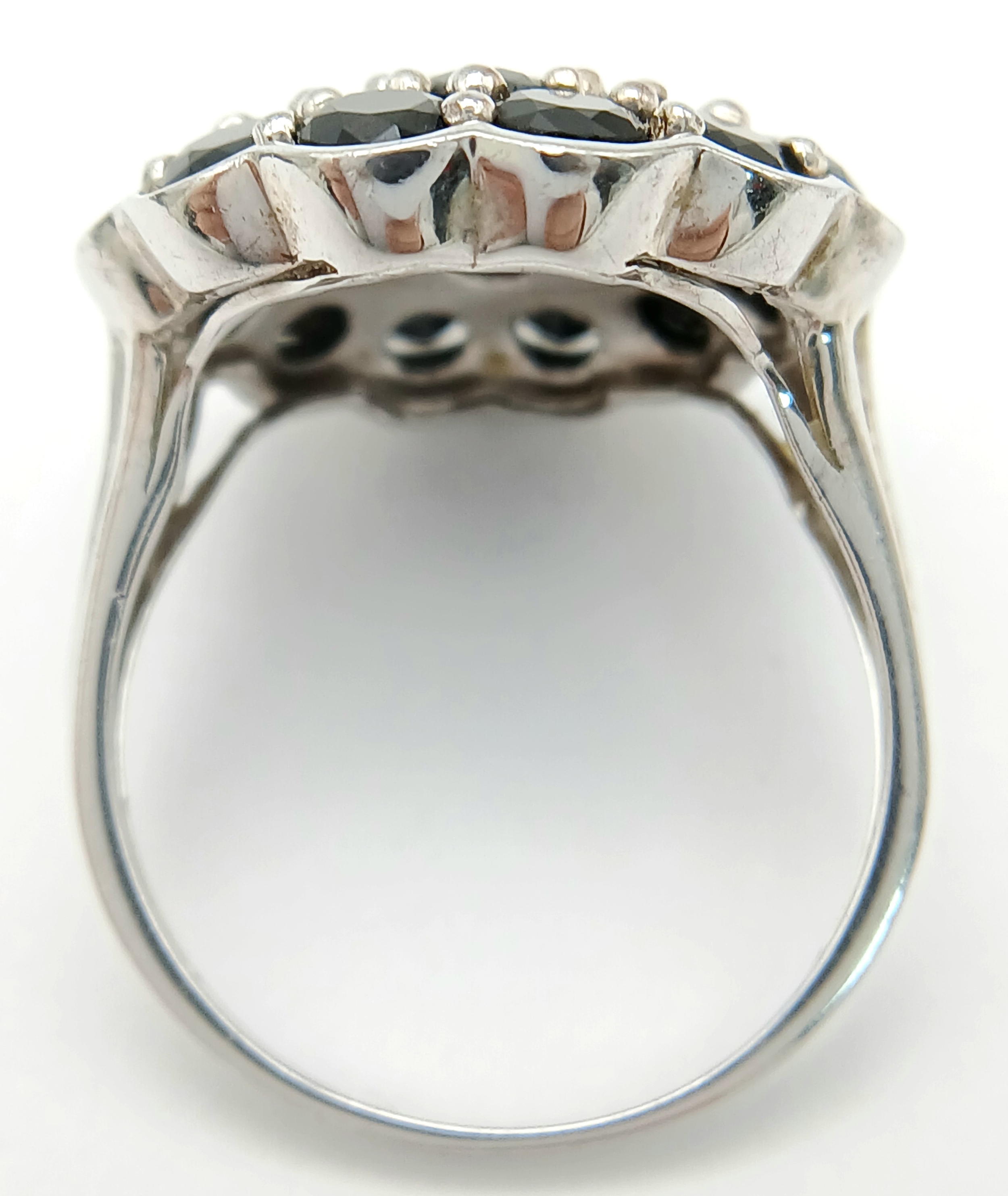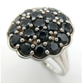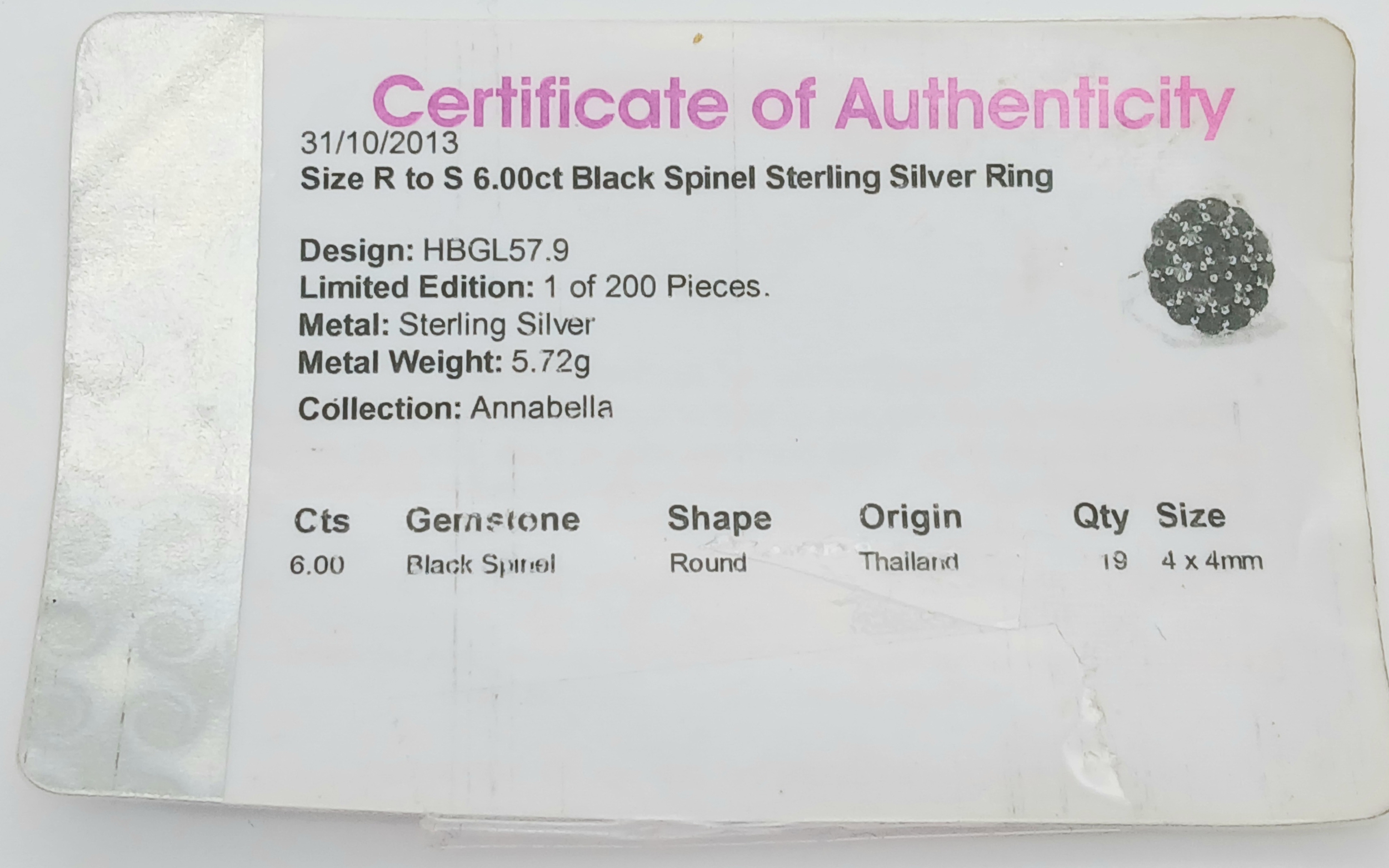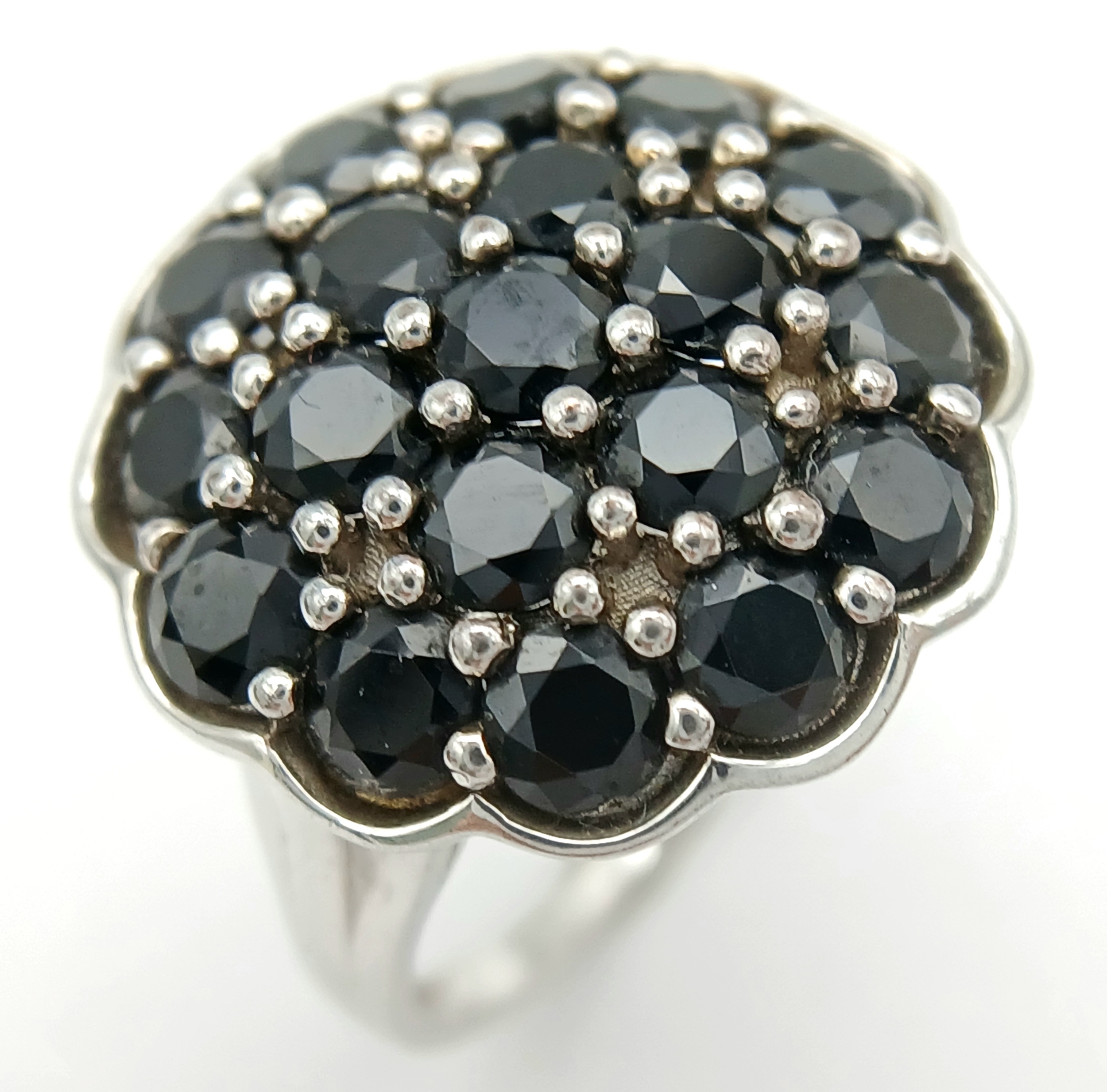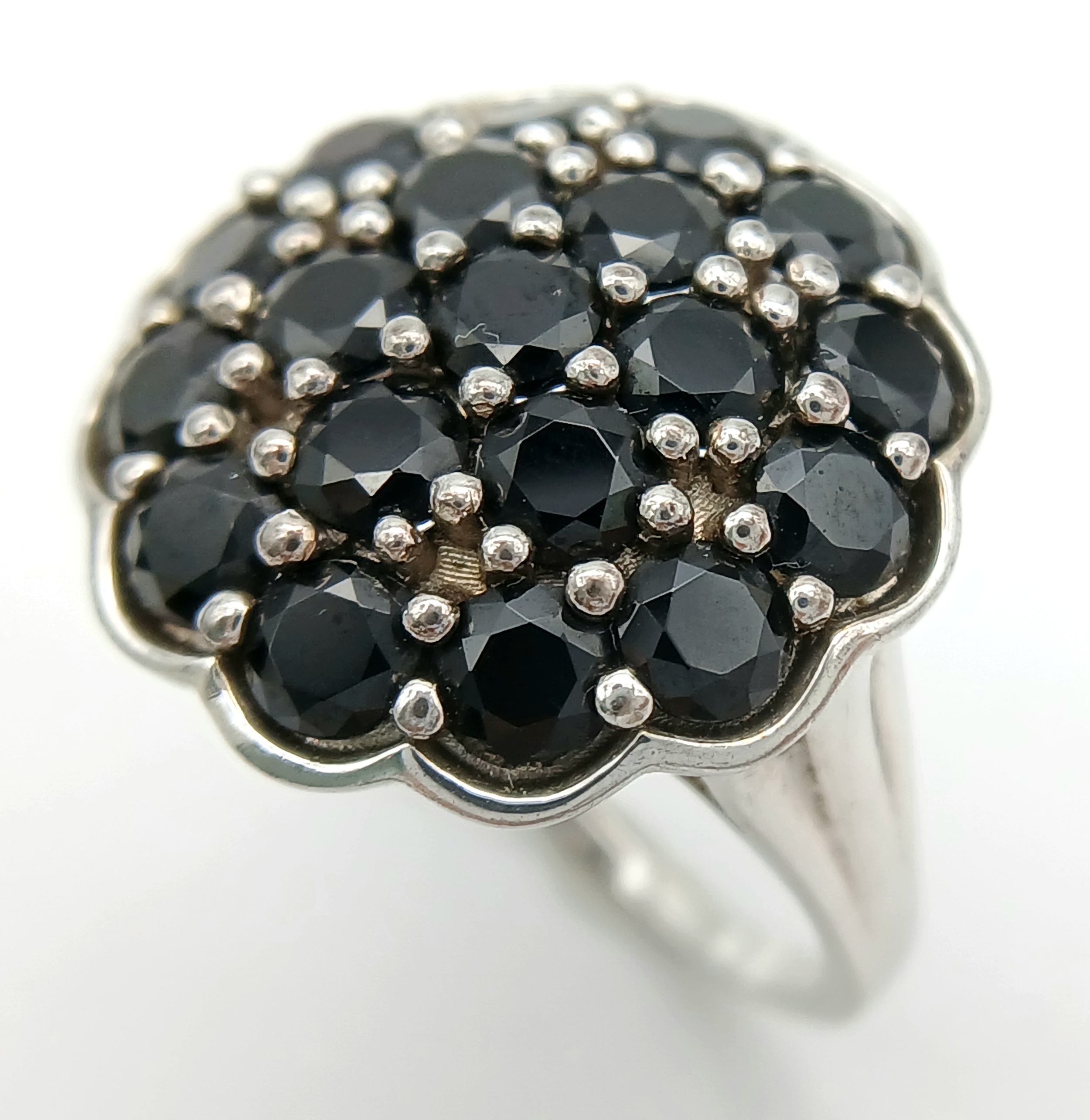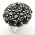 An Impressive Sterling Silver Black Spinel Cluster Ring Size R1/2. The Ring has a total of 6 Carats of Round Cut Black Spinel. The Crown Measures 2.2cm Wide and the Ring has a gross weight of 7.14 Grams. Comes with a Certificate of Authenticity.
